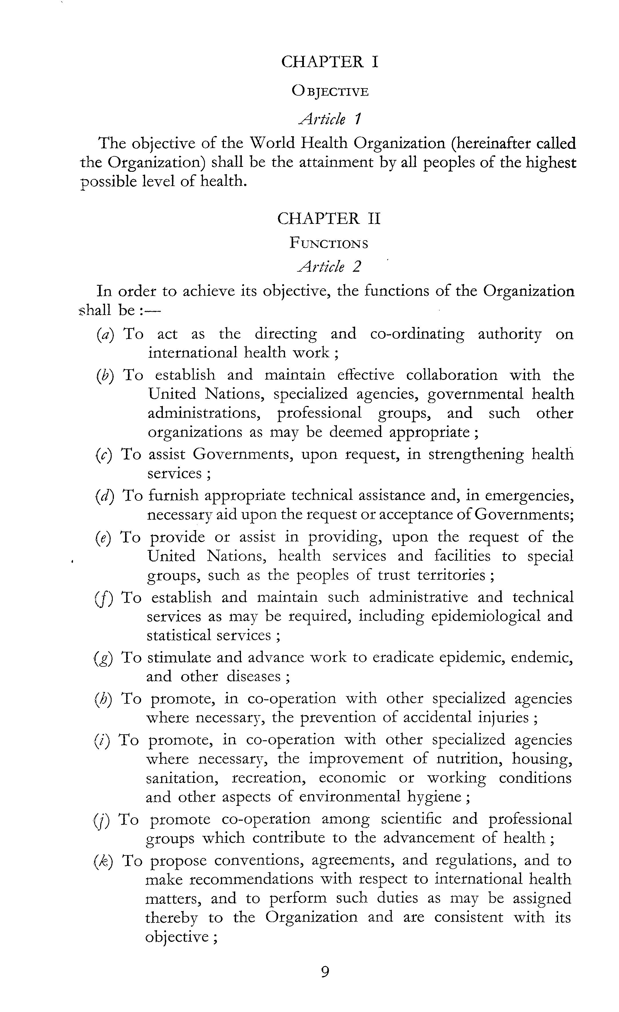 CHAPTER I Objective Article 1 The objective of the World Health Organization (hereinafter called the Organization) shall be the attainment by all peoples of the highest possible level of health. CHAPTER II Functions Article 2 In order to achieve its objective, the functions of the Organization shall be : {a) To act as the directing and co-ordinating authority on international health work; (b) To establish and maintain effective collaboration with the United Nations, specialized agencies, governmental health administrations, professional groups, and such other organizations as may be deemed appropriate; (c) To assist Governments, upon request, in strengthening health services ; {d) To furnish appropriate technical assistance and, in emergencies, necessary aid upon the request or acceptance of Governments; (e) To provide or assist in providing, upon the request of the United Nations, health services and facilities to special groups, such as the peoples of trust territories ; (J) To establish and maintain such administrative and technical services as may be required, including epidemiological and statistical services ; (g) To stimulate and advance work to eradicate epidemic, endemic, and other diseases ; (h) To promote, in co-operation with other specialized agencies where necessary, the prevention of accidental injuries ; (j) To promote, in co-operation with other specialized agencies where necessary, the improvement of nutrition, housing, sanitation, recreation, economic or working conditions and other aspects of environmental hygiene ; (j) To promote co-operation among scientific and professional groups which contribute to the advancement of health; (k) To propose conventions, agreements, and regulations, and to make recommendations with respect to international health matters, and to perform such duties as may be assigned thereby to the Organization and are consistent with its objective;
