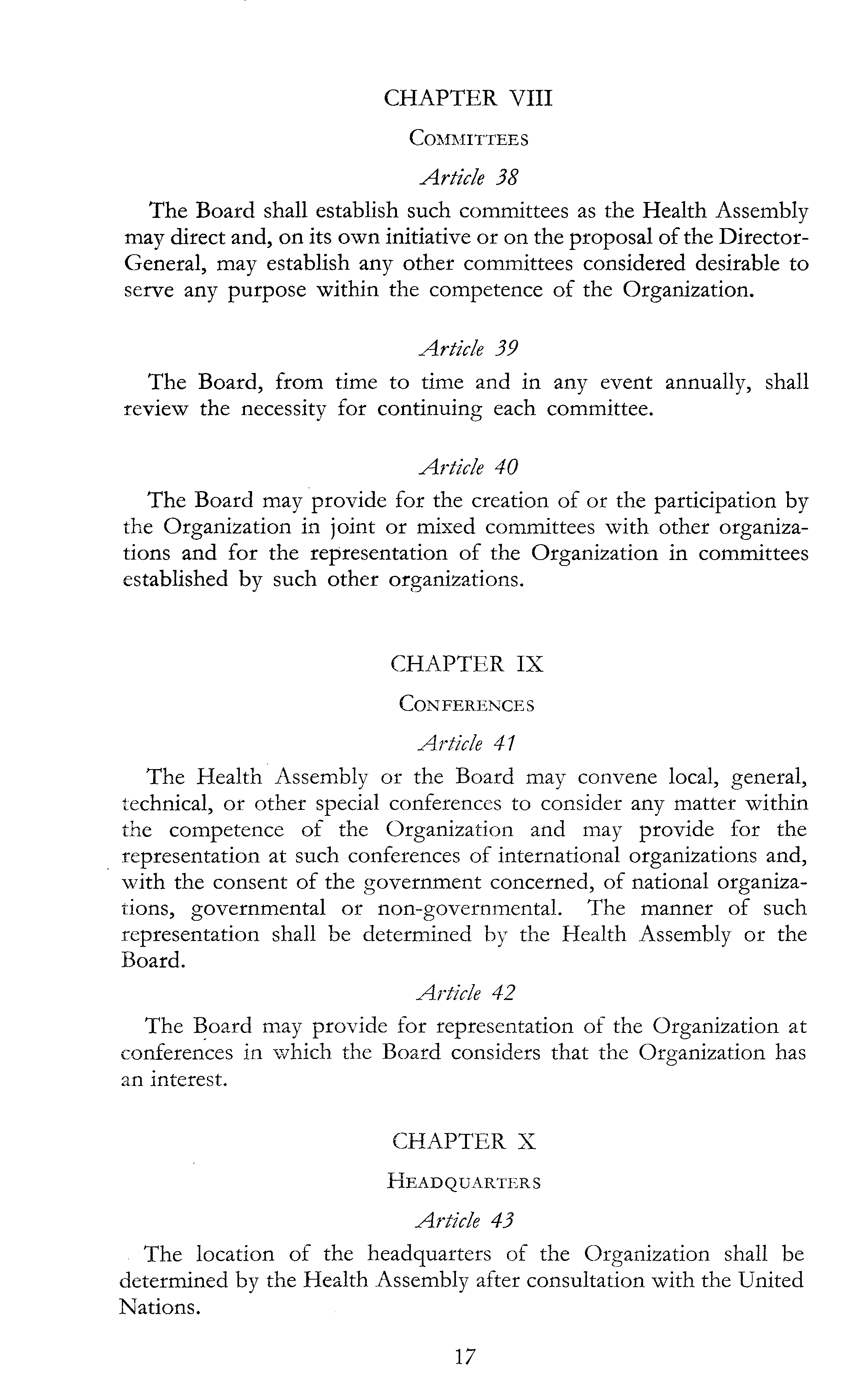 CHAPTER VIII Committees Article 38 The Board shall establish such committees as the Health Assembly may direct and, on its own initiative or on the proposal of the DirectorGeneral, may establish any other committees considered desirable to serve any purpose within the competence of the Organization. Article 39 The Board, from time to time and in any event annually, shall review the necessity for continuing each committee. Article 40 The Board may provide for the creation of or the participation by the Organization in joint or mixed committees with other organizations and for the representation of the Organization in committees established by such other organizations. CHAPTER IX Conferences Article 41 The Health Assembly or the Board may convene local, general, technical, or other special conferences to consider any matter within the competence of the Organization and may provide for the representation at such conferences of international organizations and, with the consent of the government concerned, of national organizations, governmental or non-governmental. The manner of such representation shall be determined by the Health Assembly or the Board. Article 42 The Board may provide for representation of the Organization at conferences in which the Board considers that the Organization has an interest. CHAPTER X Headquarters Article 43 The location of the headquarters of the Organization shall be determined by the Health Assembly after consultation with the United Nations.