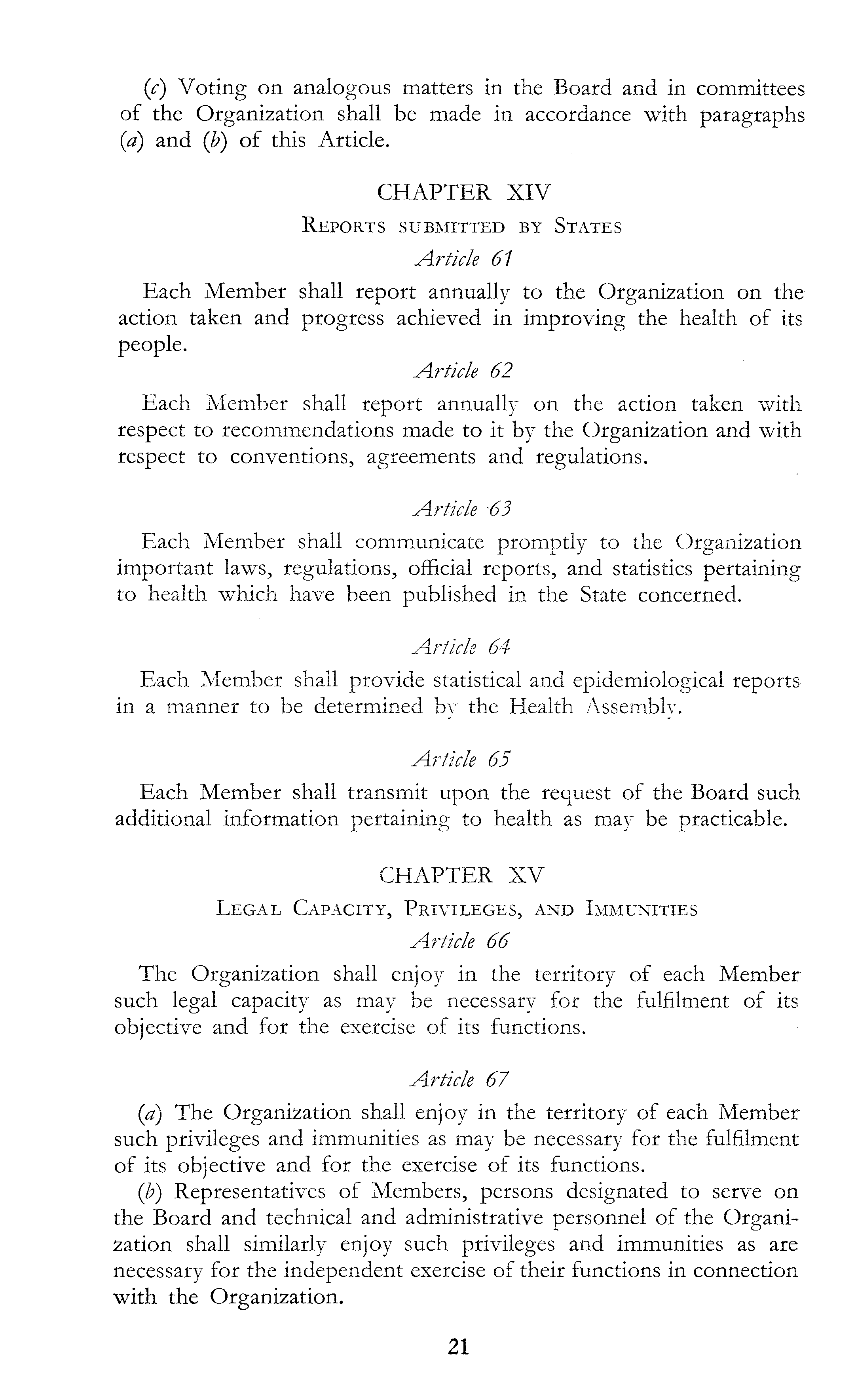 (c) Voting on analogous matters in the Board and in committees of the Organization shall be made in accordance with paragraphs (a) and (b) of this Article. CHAPTER XIV Reports submitted by States Article 61 Each Member shall report annually to the Organization on the action taken and progress achieved in improving the health of its people. Article 62 Each Member shall report annually on the action taken with respect to recommendations made to it by the Organization and with respect to conventions, agreements and regulations. Article 63 Each Member shall communicate promptly to the Organization important laws, regulations, official reports, and statistics pertaining to health which have been published in the State concerned. Article 64 Each Member shall provide statistical and epidemiological reports in a manner to be determined by the Health Assembly. Article 65 Each Member shall transmit upon the request of the Board such additional information pertaining to health as may be practicable. CHAPTER XV Legal Capacity, Privileges, and Immunities Article 66 The Organization shall enjoy in the territory of each Member such legal capacity as may be necessary for the fulfilment of its objective and for the exercise of its functions. Article 67 (a) The Organization shall enjoy in the territory of each Member such privileges and immunities as may be necessary for the fulfilment of its objective and for the exercise of its functions. (b) Representatives of Members, persons designated to serve on the Board and technical and administrative personnel of the Organization shall similarly enjoy such privileges and immunities as are necessary for the independent exercise of their functions in connection with the Organization.