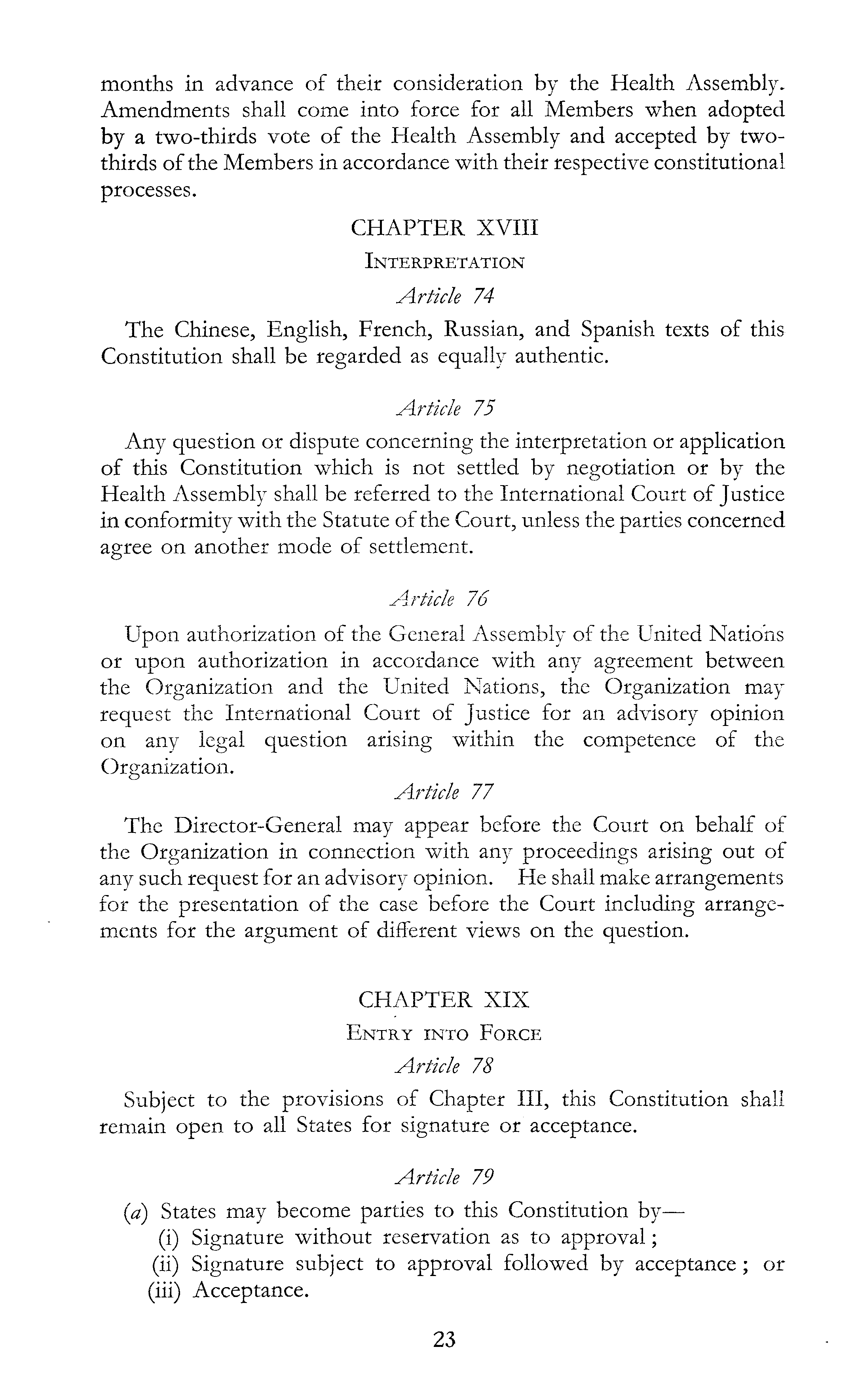 months in advance of their consideration by the Health Assembly. Amendments shall come into force for all Members when adopted by a two-thirds vote of the Health Assembly and accepted by twothirds of the Members in accordance with their respective constitutional processes. CHAPTER XVIII Interpretation Article 74 The Chinese, English, French, Russian, and Spanish texts of this Constitution shall be regarded as equally authentic. Article 75 Any question or dispute concerning the interpretation or application of this Constitution which is not settled by negotiation or by the Health Assembly shall be referred to the International Court of Justice in conformity with the Statute of the Court, unless the parties concerned agree on another mode of settlement. Article 76 Upon authorization of the General Assembly of the United Nations or upon authorization in accordance with any agreement between the Organization and the United Nations, the Organization may request the International Court of Justice for an advisory opinion on any legal question arising within the competence of the Organization. Article 77 The Director-General may appear before the Court on behalf of the Organization in connection with any proceedings arising out of any such request for an advisory opinion. He shall make arrangements for the presentation of the case before the Court including arrangements for the argument of different views on the question. CHAPTER XIX Entry into Force Article 78 Subject to the provisions of Chapter 111, this Constitution shall remain open to all States for signature or acceptance. Article 79 (a) States may become parties to this Constitution by—(i) Signature without reservation as to approval; (ii) Signature subject to approval followed by acceptance; or (iii) Acceptance.