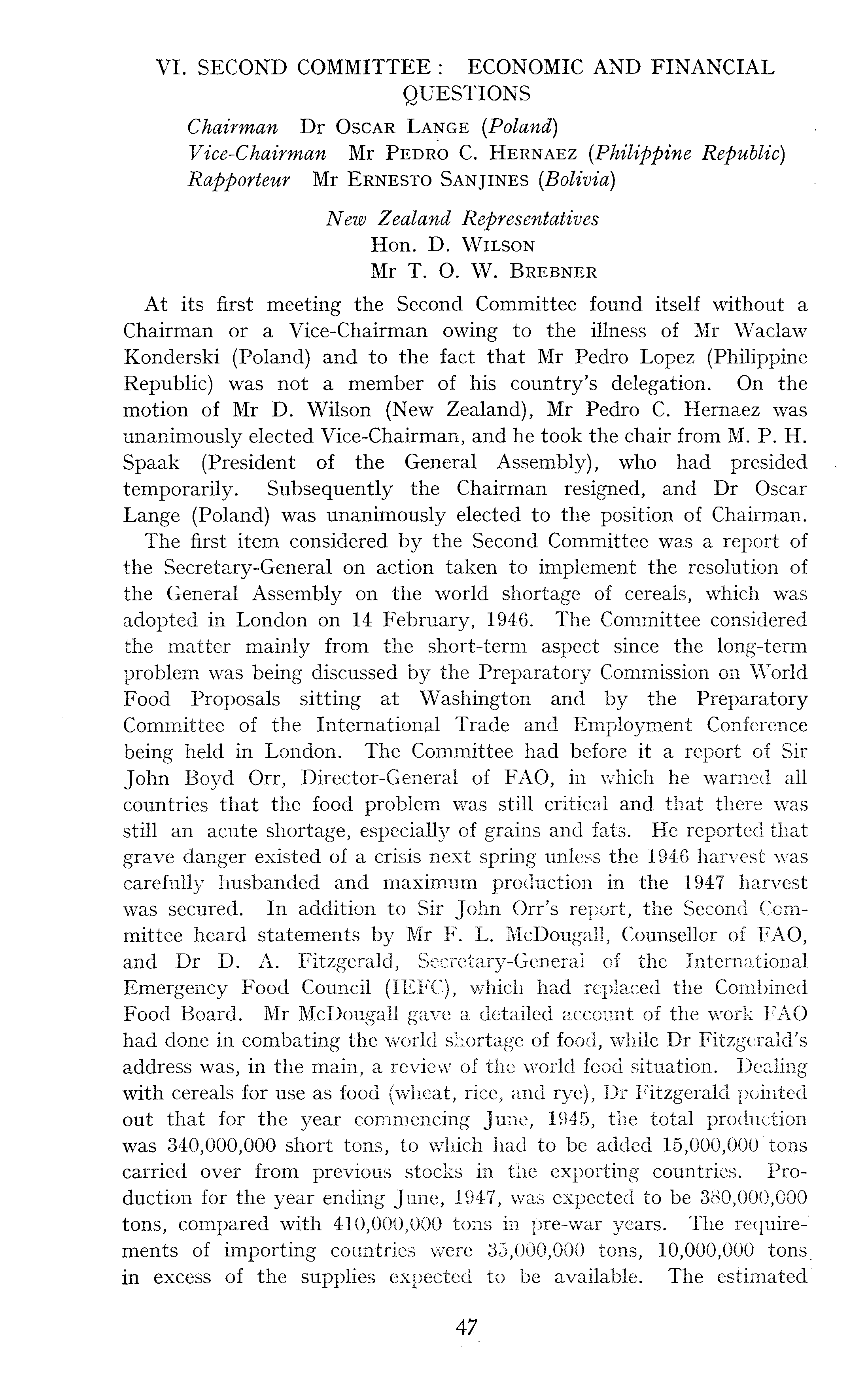 VI. SECOND COMMITTEE : ECONOMIC AND FINANCIAL QUESTIONS Chairman Dr Oscar Lange (Poland) Vice-Chairman Mr Pedro C. Hernaez (Philippine Republic) Rapporteur Mr Ernesto Sanjines (Bolivia) New Zealand Representatives Hon. D. Wilson Mr T. O. W. Brebner At its first meeting the Second Committee found itself without a Chairman or a Vice-Chairman owing to the illness of Mr Waclaw Konderski (Poland) and to the fact that Mr Pedro Lopez (Philippine Republic) was not a member of his country's delegation. On the motion of Mr D. Wilson (New Zealand), Mr Pedro C. Hernaez was unanimously elected Vice-Chairman, and he took the chair from M. P. H. Spaak (President of the General Assembly), who had presided temporarily. Subsequently the Chairman resigned, and Dr Oscar Lange (Poland) was unanimously elected to the position of Chairman. The first item considered by the Second Committee was a report of the Secretary-General on action taken to implement the resolution of the General Assembly on the world shortage of cereals, which was adopted in London on 14 February, 1946. The Committee considered the matter mainly from the short-term aspect since the long-term problem was being discussed by the Preparatory Commission on World Food Proposals sitting at Washington and by the Preparatory Committee of the International Trade and Employment Conference being held in London. The Committee had before it a report of Sir John Boyd Orr, Director-General of FAO, in which he warned all countries that the food problem was still critical and that there was still an acute shortage, especially of grains and fats. He reported that grave danger existed of a crisis next spring unless the 1946 harvest was carefully husbanded and maximum production in the 1947 harvest was secured. In addition to Sir John Orr's report, the Second Committee heard statements by Mr F. L. McDougall, Counsellor of FAO, and Dr D. A. Fitzgerald, Secretary-General of the International Emergency Food Council (IEFC), which had replaced the Combined Food Board. Mr McDougall gave a detailed account of the work FAO had done in combating the world shortage of food, while Dr Fitzgerald's address was, in the main, a review of the world food situation. Dealing with cereals for use as food (wheat, rice, and rye), Dr Fitzgerald pointed out that for the year commencing June, 1945, the total production was 340,000,000 short tons, to which had to be added 15,000,000 tons carried over from previous stocks in the exporting countries. Production for the year ending June, 1947, was expected to be 380,000,000 tons, compared with 410,000,000 tons in pre-war years. The requirements of importing countries were 35,000,000 tons, 10,000,000 tons in excess of the supplies expected to be available. The estimated