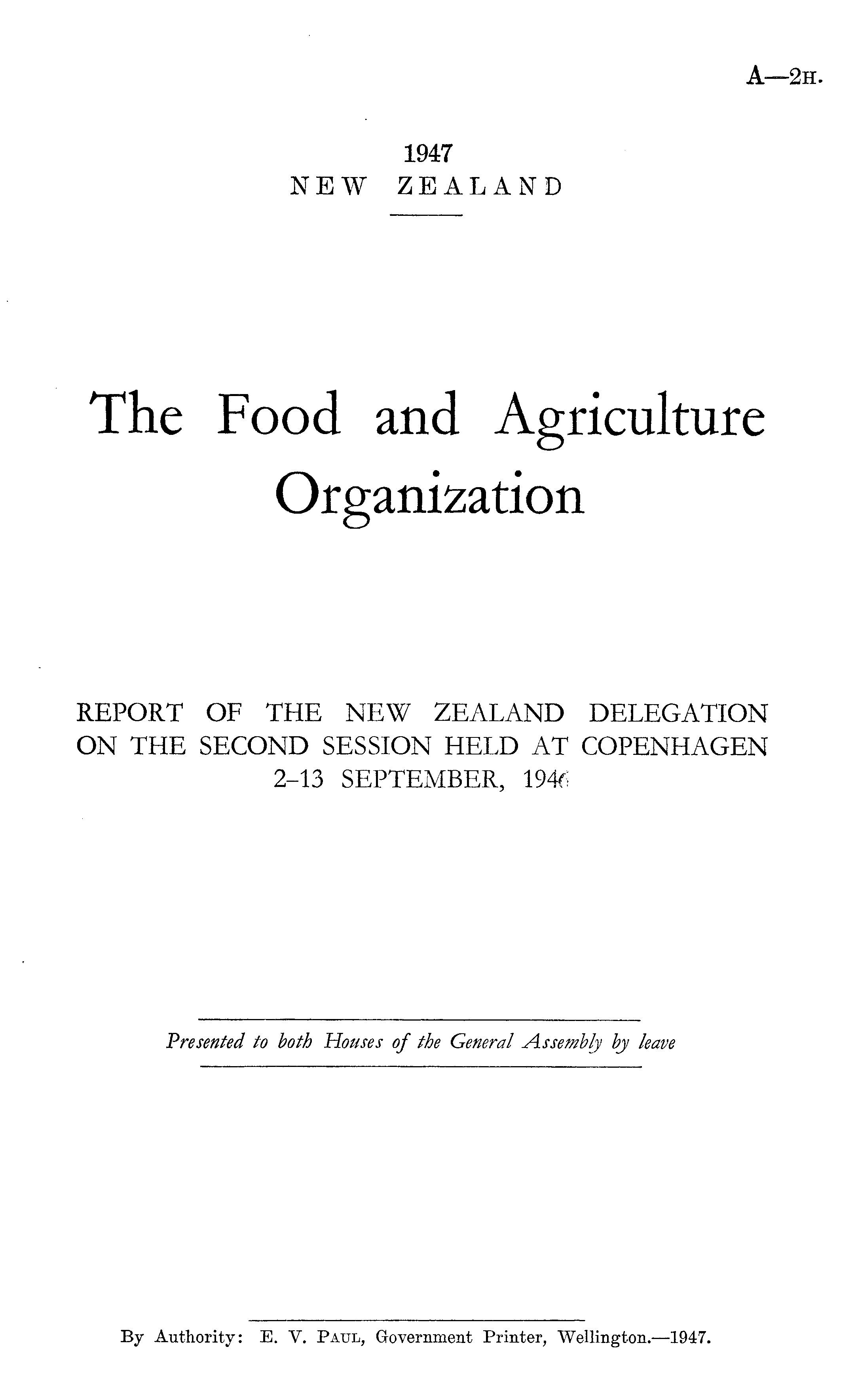 The Food and Agriculture Organization REPORT OF THE NEW ZEALAND DELEGATION ON THE SECOND SESSION HELD AT COPENHAGEN 2-13 SEPTEMBER, 1946