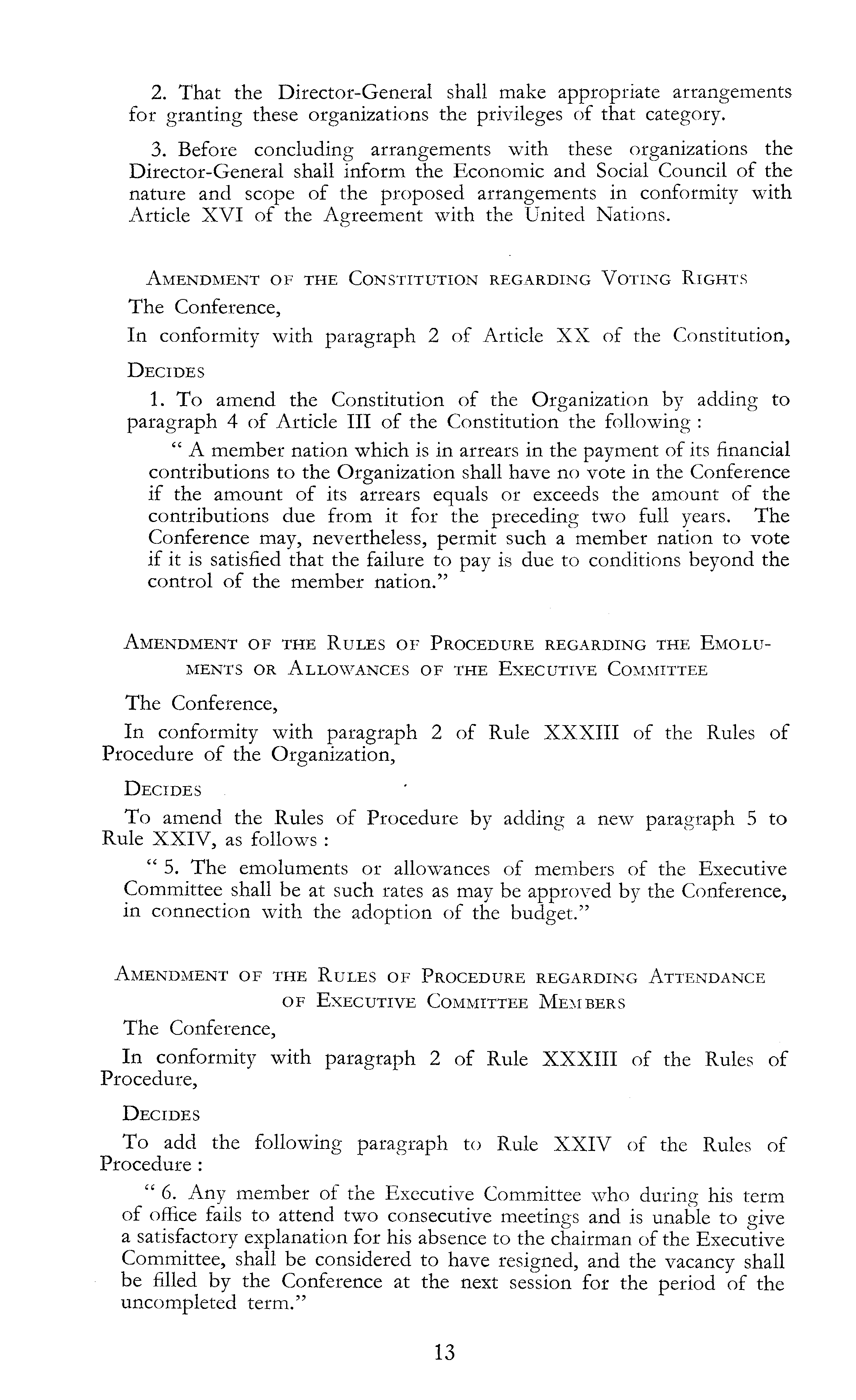 2. That the Director-General shall make appropriate arrangements for granting these organizations the privileges of that category. 3. Before concluding arrangements with these organizations the Director-General shall inform the Economic and Social Council of the nature and scope of the proposed arrangements in conformity with Article XVI of the Agreement with the United Nations. Amendment of the Constitution regarding Voting Rights The Conference, In conformity with paragraph 2 of Article XX of the Constitution, Decides 1. To amend the Constitution of the Organization by adding to paragraph 4 of Article 111 of the Constitution the following : " A member nation which is in arrears in the payment of its financial contributions to the Organization shall have no vote in the Conference if the amount of its arrears equals or exceeds the amount of the contributions due from it for the preceding two full years. The Conference may, nevertheless, permit such a member nation to vote if it is satisfied that the failure to pay is due to conditions beyond the control of the member nation." Amendment of the Rules of Procedure regarding the Emoluments or Allowances of the Executive Committee The Conference, In conformity with paragraph 2 of Rule XXXIII of the Rules of Procedure of the Organization, Decides To amend the Rules of Procedure by adding a new paragraph 5 to Rule XXIV, as follows : "5. The emoluments or allowances of members of the Executive Committee shall be at such rates as may be approved by the Conference, in connection with the adoption of the budget." Amendment of the Rules of Procedure regarding Attendance of Executive Committee Members The Conference, In conformity with paragraph 2 of Rule XXXIII of the Rules of Procedure, Decides To add the following paragraph to Rule XXIV of the Rules of Procedure : " 6. Any member of the Executive Committee who during his term of office fails to attend two consecutive meetings and is unable to give a satisfactory explanation for his absence to the chairman of the Executive Committee, shall be considered to have resigned, and the vacancy shall be filled by the Conference at the next session for the period of the uncompleted term."