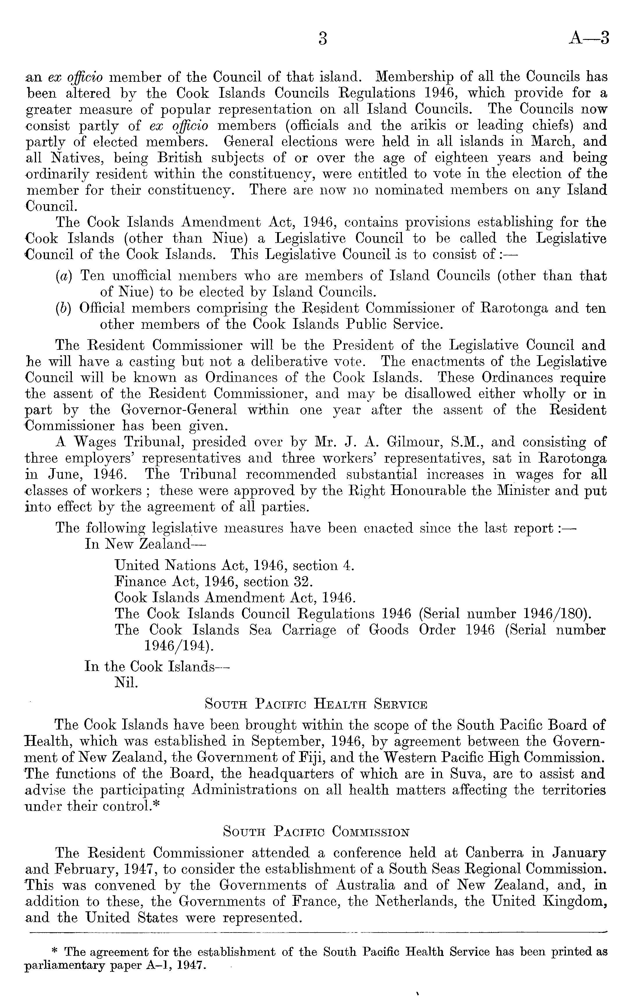 an ex officio member of the Council of that island. Membership of all the Councils has been altered by the Cook Islands Councils Regulations 1946, which provide for a greater measure of popular representation on all Island Councils. The Councils now consist partly of ex officio members (officials and the arikis or leading chiefs) and partly of elected members. General elections were held in all islands in March, and all Natives, being British subjects of or over the age of eighteen years and being ordinarily resident within the constituency, were entitled to vote in the election of the member for their constituency. There are now no nominated members on any Island ■Council. The Cook Islands Amendment Act, 1946, contains provisions establishing for the Cook Islands (other than Niue) a Legislative Council to be called the Legislative Council of the Cook Islands. This Legislative Council is to consist of: — (a) Ten unofficial members who are members of Island Councils (other than that of Niue) to be elected by Island Councils. (b) Official members comprising the Resident Commissioner of Rarotonga and ten other members of the Cook Islands Public Service. The Resident Commissioner will be the President of the Legislative Council and he will have a casting but not a deliberative vote. The enactments of the Legislative •Council will be known as Ordinances of the Cook Islands. These Ordinances require the assent of the Resident Commissioner, and may be disallowed either wholly or in part by the Governor-General within one year after the assent of the Resident ■Commissioner has been given. A "Wages Tribunal, presided over by Mr. J. A. Gilmour, S.M., and consisting of three employers' representatives and three workers' representatives, sat in Rarotonga in June, 1946. The Tribunal recommended substantial increases in wages, for all classes of workers ; these were approved by the Right Honourable the Minister and put into effect by the agreement of all parties. The following legislative measures have been enacted since the last report In New Zealand — United Nations Act, 1946, section 4. Finance Act, 1946, section 32. Cook Islands Amendment Act, 1946. The Cook Islands Council Regulations 1946 (Serial number 1946/180). The Cook Islands Sea Carriage of Goods Order 1946 (Serial number 1946/194). In the Cook Islands— • Nil. South Pacific Health Service The Cook Islands have been brought within the scope of the South Pacific Board of Health, which was established in September, 1946, by agreement between the Government of New Zealand, the Government of Fiji, and the Western Pacific High Commission. The functions of the Board, the headquarters of which are in Suva, are to assist and advise the participating Administrations on all health matters affecting the territories under their control.* South Pacific Commission The Resident Commissioner attended a conference held at Canberra in January and February, 1947, to consider the establishment of a South Seas Regional Commission. This was convened by the Governments of Australia and of New Zealand, and, in addition to these, the Governments of France, the Netherlands, the United Kingdom, and the United States were represented.
