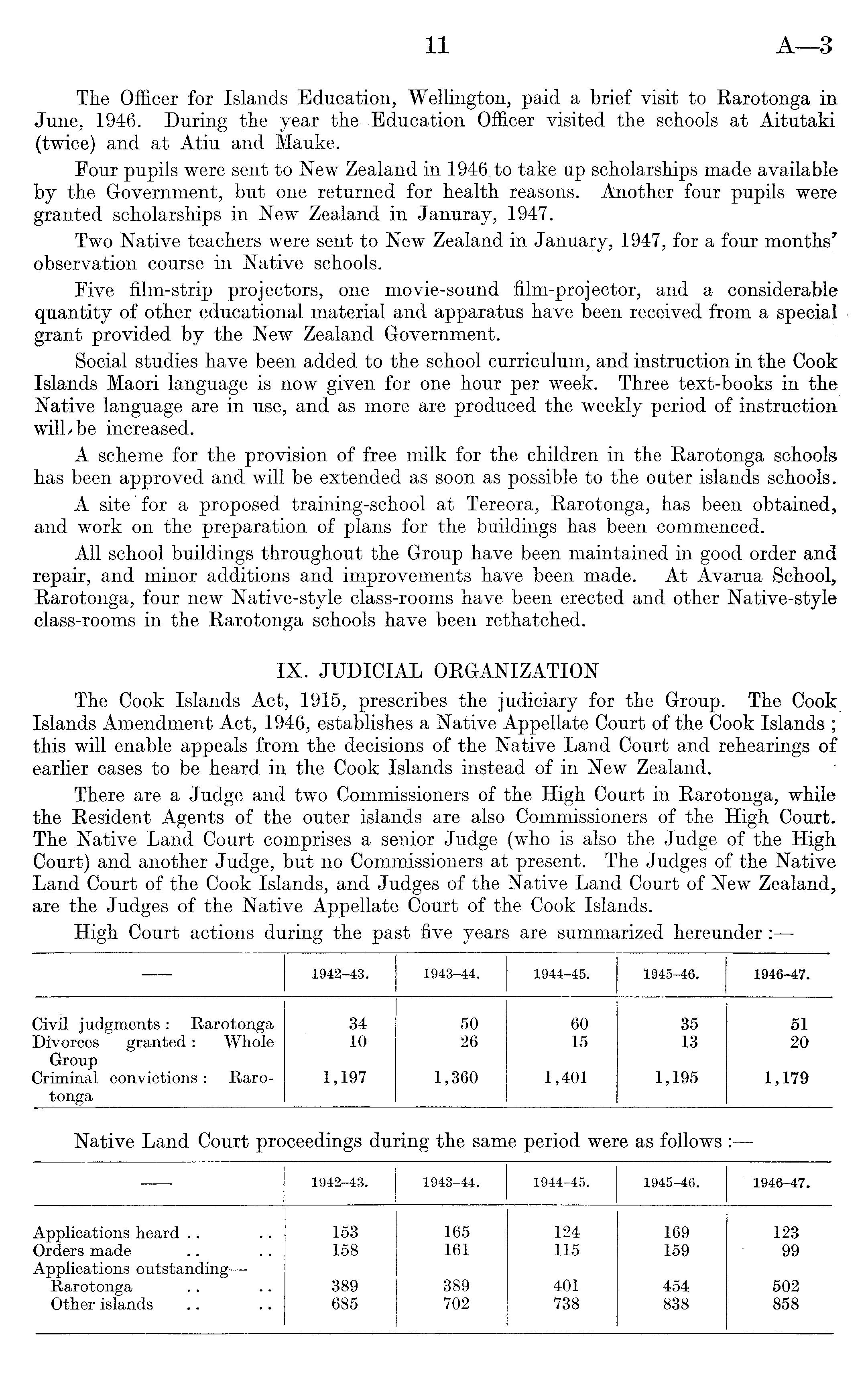 The Officer for Islands Education, Wellington, paid a brief visit to Rarotonga in June, 1946. During the year the Education Officer visited the schools at Aitutaki (twice) and at Atiu and Mauke. Four pupils were sent to New Zealand in 1946.t0 take up scholarships made available by the Government, but one returned for health reasons. Another four pupils were granted scholarships in New Zealand in Januray, 1947. Two Native teachers were sent to New Zealand in January, 1947, for a four months 7 observation course in Native schools. Five film-strip projectors, one movie-sound film-projector, and a considerable quantity of other educational material and apparatus have been received from a special grant provided by the New Zealand Government. Social studies have been added to the school curriculum, and instruction in the Cook Islands Maori language is now given for one hour per week. Three text-books in the Native language are in use, and as more are produced the weekly period of instruction wilL be increased. A scheme for the provision of free milk for the children in the Rarotonga schools has been approved and will be extended as soon as possible to the outer islands schools. A site for a proposed training-school at Tereora, Rarotonga, has been obtained, and work on the preparation of plans for the buildings has been commenced. All school buildings throughout the Group have been maintained in good order and repair, and minor additions and improvements have been made. At Avarua School, Rarotonga, four new Native-style class-rooms have been erected and other class-rooms in the Rarotonga schools have been rethatched. IX. JUDICIAL ORGANIZATION The Cook Islands Act, 1915, prescribes the judiciary for the Group. The Cook Islands Amendment Act, 1946, establishes a Native Appellate Court of the Cook Islands ; this will enable appeals from the decisions of the Native Land Court and rehearings of earlier cases to be heard in the Cook Islands instead of in New Zealand. There are a Judge and two Commissioners of the High Court in Rarotonga, while the Resident Agents of the outer islands are also Commissioners of the High Court. The Native Land Court comprises a senior Judge (who is also the Judge of the High Court) and another Judge, but no Commissioners at present. The Judges of the Native Land Court of the Cook Islands, and Judges of the Native Land Court of New Zealand, are the Judges of the Native Appellate Court of the Cook Islands. High Court actions during the past five years are summarized hereunder :