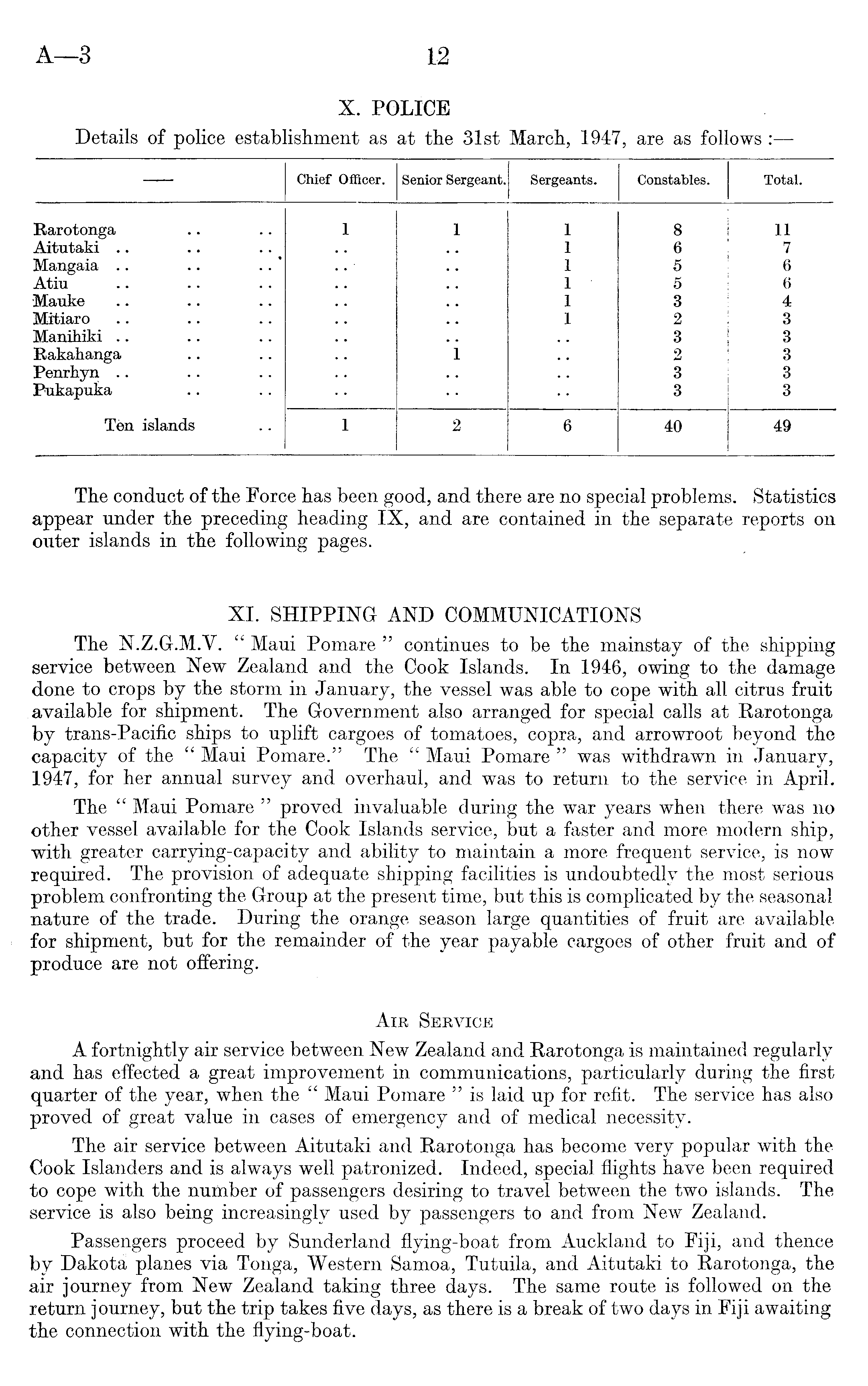 The conduct of the Force has been good, and there are no special problems. Statistics appear under the preceding heading IX, and are contained in the separate reports on outer islands in the following pages. XI. SHIPPING AND COMMUNICATIONS The N.Z.G.M.V. " Maui Pomare " continues to be the mainstay of the shipping service between New Zealand and the Cook Islands. In 1946, owing to the damage done to crops by the storm in January, the vessel was able to cope with all citrus fruit available for shipment. The Government also arranged for special calls at Rarotonga by trans-Pacific ships to uplift cargoes of tomatoes, copra, and arrowroot beyond the capacity of the " Maui Pomare." The " Maui Pomare " was withdrawn in January, 1947, for her annual survey and overhaul, and was to return to the service in April. The " Maui Pomare " proved invaluable during the war years when there was no other vessel available for the Cook Islands service, but a faster and more modern ship, with greater carrying-capacity and ability to maintain a more frequent service, is now required. The provision of adequate shipping facilities is undoubtedly the most serious problem confronting the Group at the present time, but this is complicated by the seasonal nature of the trade. During the orange season large quantities of fruit are available for shipment, but for the remainder of the year payable cargoes of other fruit and of produce are not offering. Air Service - A fortnightly air service between New Zealand and Rarotonga is maintained regularly and has effected a great improvement in communications, particularly during the first quarter of the year, when the " Maui Pomare "is laid up for refit. The service has also proved of great value in-cases of emergency and of medical necessity. The air service between Aitutaki and Rarotonga has become very popular with the Cook Islanders and is always well patronized. Indeed, special flights have been required to cope with the number of passengers desiring to travel between the two islands. The service is also being increasingly used by passengers to and from New Zealand. Passengers proceed by Sunderland flying-boat from Auckland to -Fiji, and thence by Dakota planes via Tonga, Western Samoa, Tutuila, and Aitutaki to Rarotonga, the air journey from New Zealand taking -three days. The same route is followed on the return journey, but the trip takes five days, as there is a break of two days in Fiji awaiting the connection with the flying-boat.