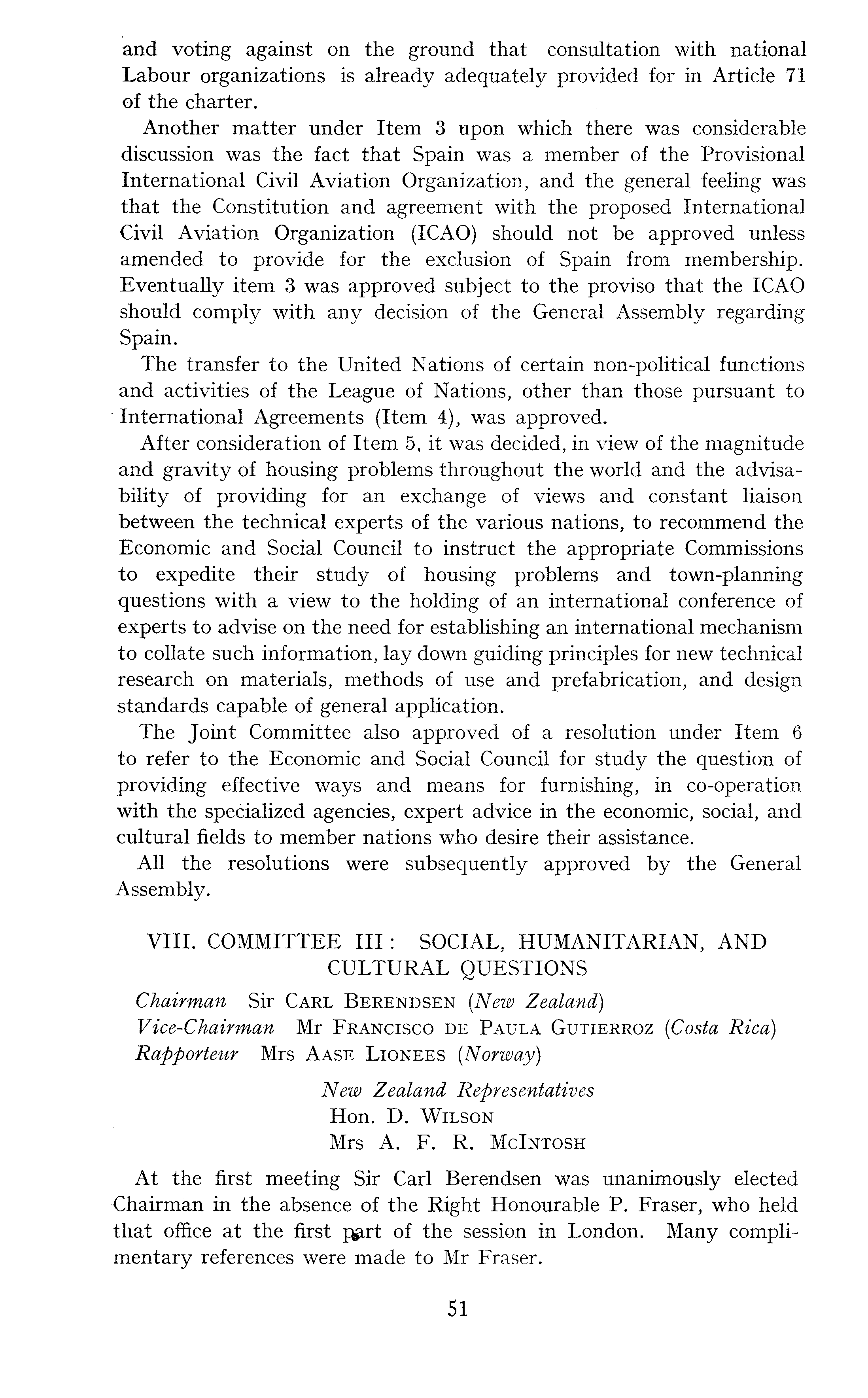 and voting against on the ground that consultation with national Labour organizations is already adequately provided for in Article 71 of the charter. Another matter under Item 3 upon which there was considerable discussion was the fact that Spain was a member of the Provisional International Civil Aviation Organization, and the general feeling was that the Constitution and agreement with the proposed International Civil Aviation Organization (ICAO) should not be approved unless amended to provide for the exclusion of Spain from membership. Eventually item 3 was approved subject to the proviso that the ICAO should comply with any decision of the General Assembly regarding Spain. The transfer to the United Nations of certain non-political functions and activities of the League of Nations, other than those pursuant to • International Agreements (Item 4), was approved. After consideration of Item 5, it was decided, in view of the magnitude and gravity of housing problems throughout the world and the advisability of providing for an exchange of views and constant liaison between the technical experts of the various nations, to recommend the Economic and Social Council to instruct the appropriate Commissions to expedite their study of housing problems and town-planning questions with a view to the holding of an international conference of experts to advise on the need for establishing an international mechanism to collate such information, lay down guiding principles for new technical research on materials, methods of use and prefabrication, and design standards capable of general application. The Joint Committee also approved of a resolution under Item 6 to refer to the Economic and Social Council for study the question of providing effective ways and means for furnishing, in co-operation with the specialized agencies, expert advice in the economic, social, and cultural fields to member nations who desire their assistance. All the resolutions were subsequently approved by the General Assembly. VIII. COMMITTEE 111 : SOCIAL, HUMANITARIAN, AND CULTURAL QUESTIONS Chairman Sir Carl Berendsen (New Zealand) Vice-Chairman Mr Francisco de Paula Gutierroz (Costa Rica) Rapporteur Mrs Aase Lionees (Norway) New Zealand Representatives Hon. D. Wilson Mrs A. F. R. Mclntosh At the first meeting Sir Carl Berendsen was unanimously elected Chairman in the absence of the Right Honourable P. Fraser, who held that office at the first pprt of the session in London. Many complimentary references were made to Mr Fraser.