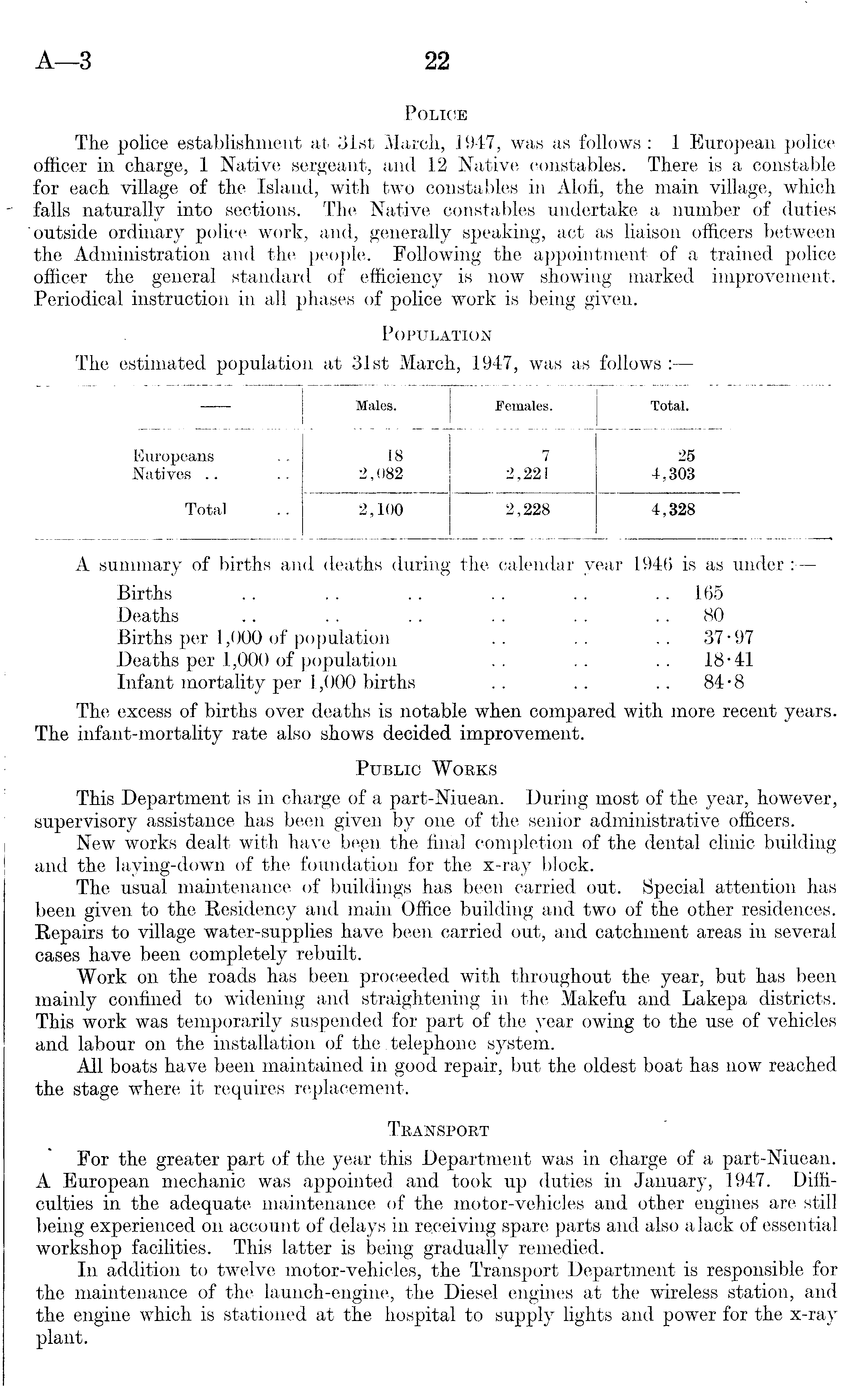 A summary of births and deaths during the calendar year 1946 is as under Births .. .. .. .. .. .. 165 Deaths .. .. .. .. .. 80 Births per 1,000 of population .. . . . . 37-97 Deaths per 1,000 of population .. .. .. 18-41 Infant mortality per 1,000 births .. .. .. 84-8 The excess of births over deaths is notable when compared with more recent years. The infant-mortality rate also shows decided improvement. Public Works This Department is in charge of a part-Niuean. During most of the year, however, supervisory assistance has been given by one of the senior administrative officers. New works dealt with have bepn the final completion of the dental clinic building and the laying-down of the foundation for the x-ray block. The usual maintenance of buildings has been carried out. Special attention has been given to the Residency and main Office building and two of the other residences. Repairs to village water-supplies have been carried out, and catchment areas in several cases have been completely rebuilt. Work on the roads has been proceeded with throughout the year, but has been mainly confined to widening and straightening in the Makefu and Lakepa districts. This work was temporarily suspended for part of the year owing to the use of vehicles and labour on the installation of the telephone system. All boats have been maintained in good repair, but the oldest boat has now reached the stage where it requires replacement. Transport For the greater part of the year this Department was in charge of a part-Muean. A European mechanic was appointed and took up duties in January, 1947. Difficulties in the adequate maintenance of the motor-vehicles and other engines are still being experienced on account of delays in receiving spare parts and also alack of essential workshop facilities. This latter is being gradually remedied. In addition to twelve motor-vehicles, the Transport Department is responsible for the maintenance of the launch-engine, the Diesel engines at the wireless station, and the engine which is stationed at the hospital to supply lights and power for the x-ray plant.