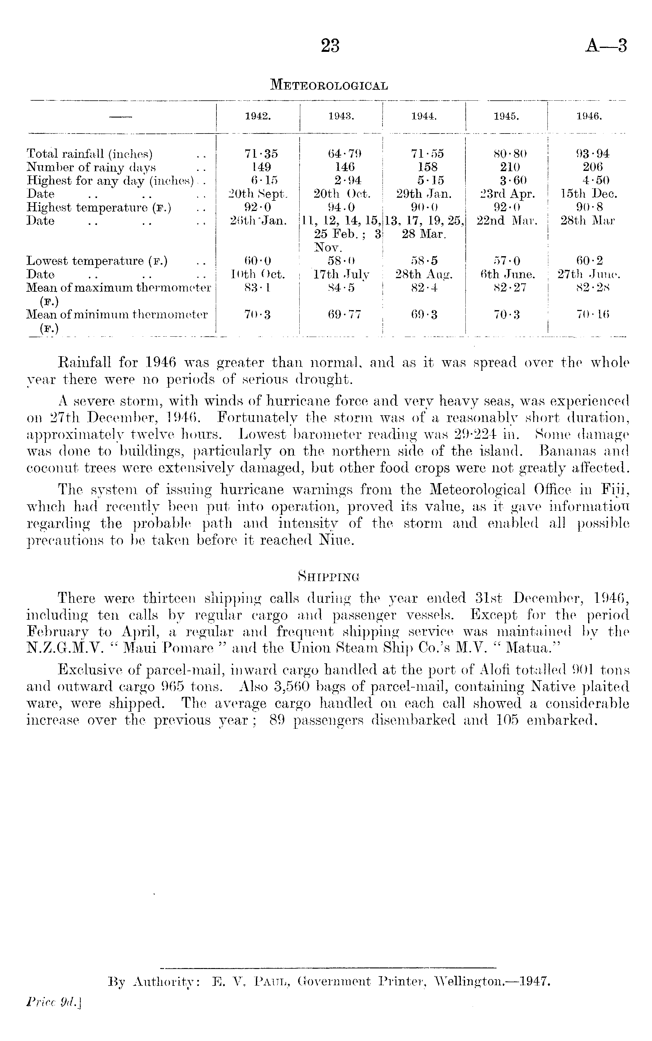 Rainfall for 1946 was greater than normal, and as it was spread over the whole year there were no periods of serious drought. A severe storm, with winds of hurricane force and very heavy seas, was experienced on 27th December, 1946. Fortunately the storm was of a reasonably short duration, approximately twelve hours. Lowest barometer reading was 29-224 in. Some damage was done to buildings, particularly on the northern side of the island. Bananas and coconut trees were extensively damaged, but other food crops were not greatly affected. The system of issuing hurricane warnings from the Meteorological Office in Fiji, which had recently been put into operation, proved its value, as it gave information regarding the probable path and intensity of the storm and enabled all possible precautions to be taken before it reached Niue. Shipping There were thirteen shipping calls during the year ended 31st December, 1946, including ten calls by regular cargo and passenger vessels. Except for the period February to April, a regular and frequent shipping service was maintained by the N.Z.G-.M.V. " Maui Pomare " and the Union Steam Ship Co.'s M.Y. " Matua." Exclusive of parcel-mail, inward cargo handled at the port of Alofi totalled 901 tons and outward cargo 965 tons. Also 3,560 bags of parcel-mail, containing Native plaited ware, were shipped. The average cargo handled on each call showed a considerable increase over the previous year; 89 passengers disembarked and 105 embarked.