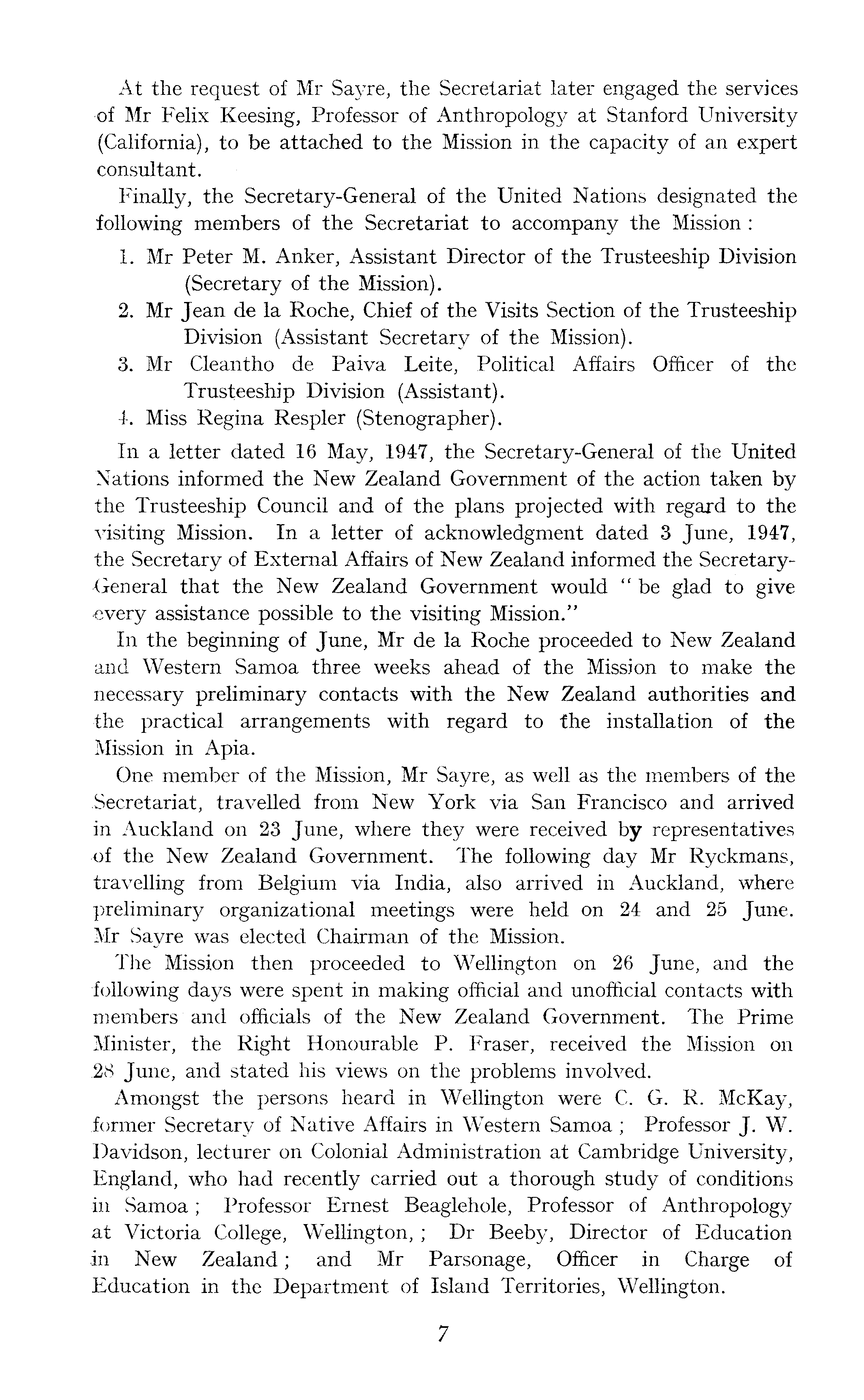 At the request of Mr Sayre, the Secretariat later engaged the services of Mr Felix Keesing, Professor of Anthropology at Stanford University (California), to be attached to the Mission in the capacity of an expert consultant. Finally, the Secretary-General of the United Nations designated the following members of the Secretariat to accompany the Mission : 1. Mr Peter M. Anker, Assistant Director of the Trusteeship Division (Secretary of the Mission). 2. Mr Jean de la Roche, Chief of the Visits Section of the Trusteeship Division (Assistant Secretary of the Mission). 3. Mr Cleantho de Paiva Leite, Political Affairs Officer of the Trusteeship Division (Assistant). 4. Miss Regina Respler (Stenographer). In a letter dated 16 May, 1947, the Secretary-General of the United Nations informed the New Zealand Government of the action taken by the Trusteeship Council and of the plans projected with regard to the visiting Mission. In a letter of acknowledgment dated 3 June, 1947, the Secretary of External Affairs of New Zealand informed the SecretaryGeneral that the New Zealand Government would " be glad to give every assistance possible to the visiting Mission." In the beginning of June, Mr de la Roche proceeded to New Zealand and Western Samoa three weeks ahead of the Mission to make the necessary preliminary contacts with the New Zealand authorities and the practical arrangements with regard to the installation of the Mission in Apia. One member of the Mission, Mr Sayre, as well as the members of the .Secretariat, travelled from New York via San Francisco and arrived in Auckland on 23 June, where they were received by representatives of the New Zealand Government. The following day Mr Ryckmans, travelling from Belgium via India, also arrived in Auckland, where preliminary organizational meetings were held on 24 and 25 June. Mr Sayre was elected Chairman of the Mission. The Mission then proceeded to Wellington on 26 June, and the following days were spent in making official and unofficial contacts with members and officials of the New Zealand Government. The Prime Minister, the Right Honourable P. Fraser, received the Mission on 58 June, and stated his views on the problems involved. Amongst the persons heard in Wellington were C. G. R. McKay, former Secretary of Native Affairs in Western Samoa ; Professor J. W. Davidson, lecturer on Colonial Administration at Cambridge University, England, who had recently carried out a thorough study of conditions in Samoa; Professor Ernest Beaglehole, Professor of Anthropology at Victoria College, Wellington, ; Dr Beeby, Director of Education in New Zealand; and Mr Parsonage, Officer in Charge of Education in the Department of Island Territories, Wellington.