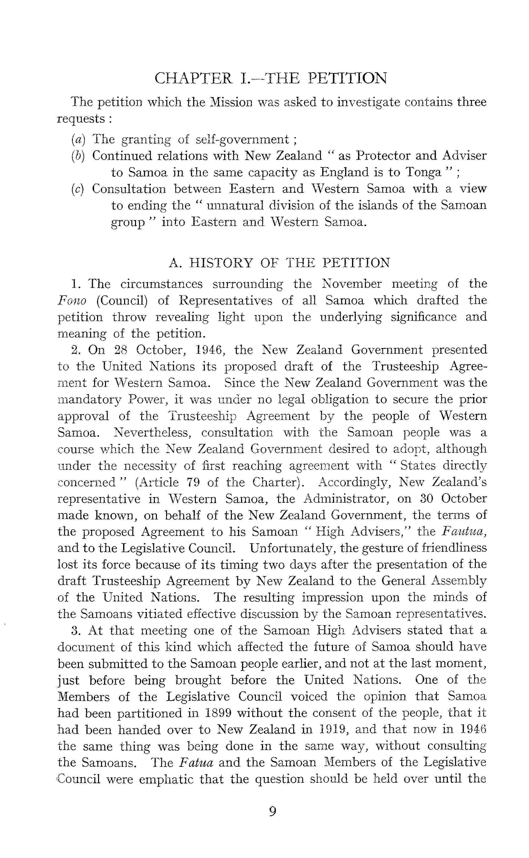 CHAPTER I.—THE PETITION The petition which the Mission was asked to investigate contains three requests : {a) The granting of self-government; (b) Continued relations with New Zealand "as Protector and Adviser to Samoa in the same capacity as England is to Tonga " ; (c) Consultation between Eastern and Western Samoa with a view to ending the " unnatural division of the islands of the Samoan group " into Eastern and Western Samoa. A. HISTORY OF THE PETITION 1. The circumstances surrounding the November meeting of the Fono (Council) of Representatives of all Samoa which drafted the petition throw revealing light upon the underlying significance and meaning of the petition. 2. On 28 October, 1946, the New Zealand Government presented to the United Nations its proposed draft of the Trusteeship Agreement for Western Samoa. Since the New Zealand Government was the mandatory Power, it was under no legal obligation to secure the prior approval of the Trusteeship Agreement by the people of Western Samoa. Nevertheless, consultation with the Samoan people was a course which the New Zealand Government desired to adopt, although under the necessity of first reaching agreement with " States directly concerned" (Article 79 of the Charter). Accordingly, New Zealand's representative in Western Samoa, the Administrator, on 30 October made known, on behalf of the New Zealand Government, the terms of the proposed Agreement to his Samoan " High Advisers," the Fautua, and to the Legislative Council. Unfortunately, the gesture of friendliness lost its force because of its timing two days after the presentation of the draft Trusteeship Agreement by New Zealand to the General Assembly of the United Nations. The resulting impression upon the minds of the Samoans vitiated effective discussion by the Samoan representatives. 3. At that meeting one of the Samoan High Advisers stated that a document of this kind which affected the future of Samoa should have been submitted to the Samoan people earlier, and not at the last moment, just before being brought before the United Nations. One of the Members of the Legislative Council voiced the opinion that Samoa had been partitioned in 1899 without the consent of the people, that it had been handed over to New Zealand in 1919, and that now in 1946 the same thing was being done in the same way, without consulting the Samoans. The Fatua and the Samoan Members of the Legislative Council were emphatic that the question should be held over until the