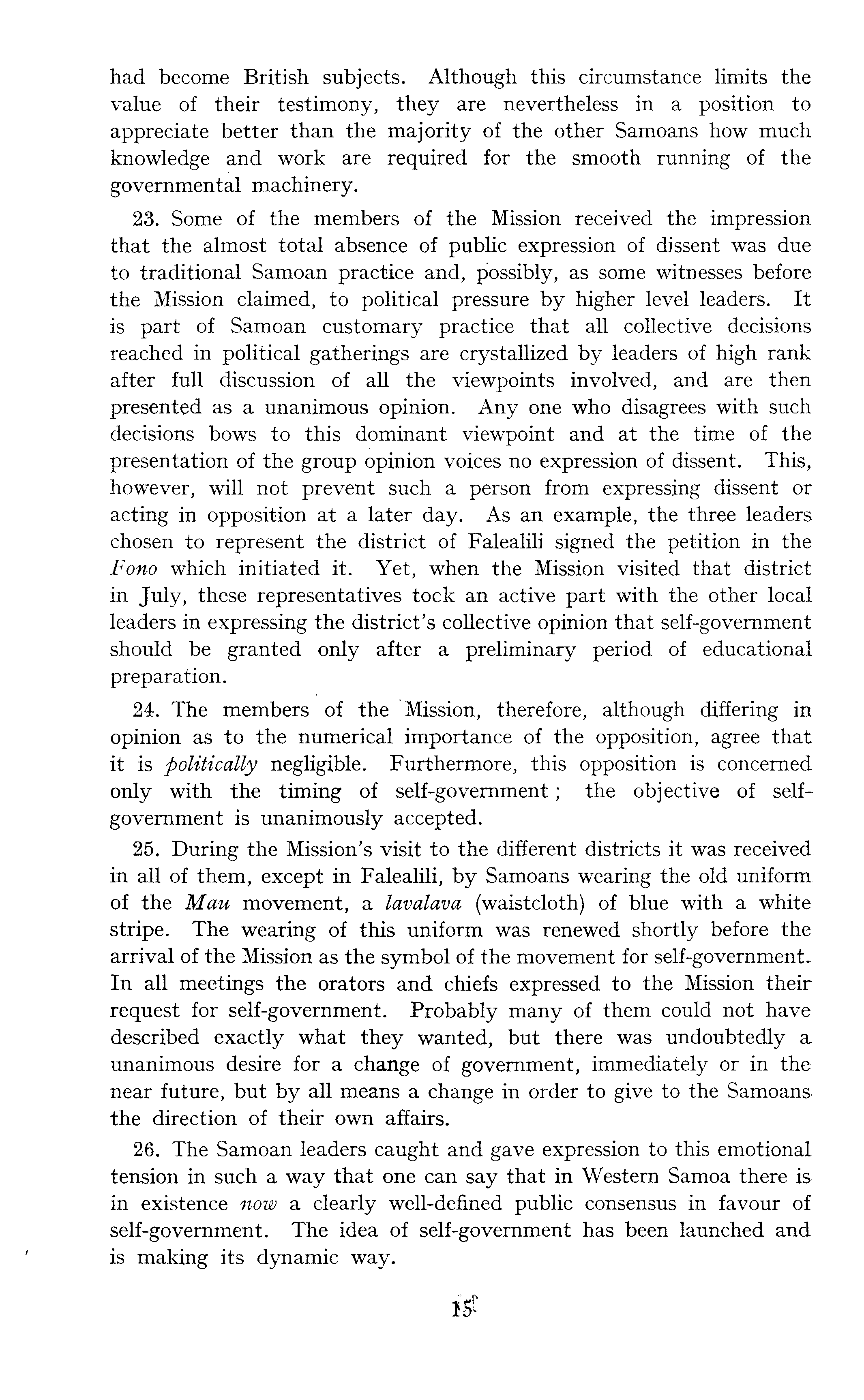 had become British subjects. Although this circumstance limits the value of their testimony, they are nevertheless in a position to appreciate better than the majority of the other Samoans how much knowledge and work are required for the smooth running of the governmental machinery. 23. Some of the members of the Mission received the impression that the almost total absence of public expression of dissent was due to traditional Samoan practice and, possibly, as some witnesses before the Mission claimed, to political pressure by higher level leaders. It is part of Samoan customary practice that all collective decisions reached in political gatherings are crystallized by leaders of high rank after full discussion of all the viewpoints involved, and are then presented as a unanimous opinion. Any one who disagrees with such decisions bows to this dominant viewpoint and at the time of the presentation of the group opinion voices no expression of dissent. This, however, will not prevent such a person from expressing dissent or acting in opposition at a later day. As an example, the three leaders chosen to represent the district of Falealili signed the petition in the Fono which initiated it. Yet, when the Mission visited that district in July, these representatives took an active part with the other local leaders in expressing the district's collective opinion that self-government should be granted only after a preliminary period of educational preparation. 24. The members of the Mission, therefore, although differing in opinion as to the numerical importance of the opposition, agree that it is politically negligible. Furthermore, this opposition is concerned only with the timing of self-government; the objective of selfgovernment is unanimously accepted. 25. During the Mission's visit to the different districts it was received in all of them, except in Falealili, by Samoans wearing the old uniform of the Mau movement, a lavalava (waistcloth) of blue with a white stripe. The wearing of this uniform was renewed shortly before the arrival of the Mission as the symbol of the movement for self-government. In all meetings the orators and chiefs expressed to the Mission their request for self-government. Probably many of them could not have described exactly what they wanted, but there was undoubtedly a unanimous desire for a change of government, immediately or in the near future, but by all means a change in order to give to the Samoans. the direction of their own affairs. 26. The Samoan leaders caught and gave expression to this emotional tension in such a way that one can say that in Western Samoa there is in existence now a clearly well-defined public consensus in favour of self-government. The idea of self-government has been launched and is making its dynamic way.