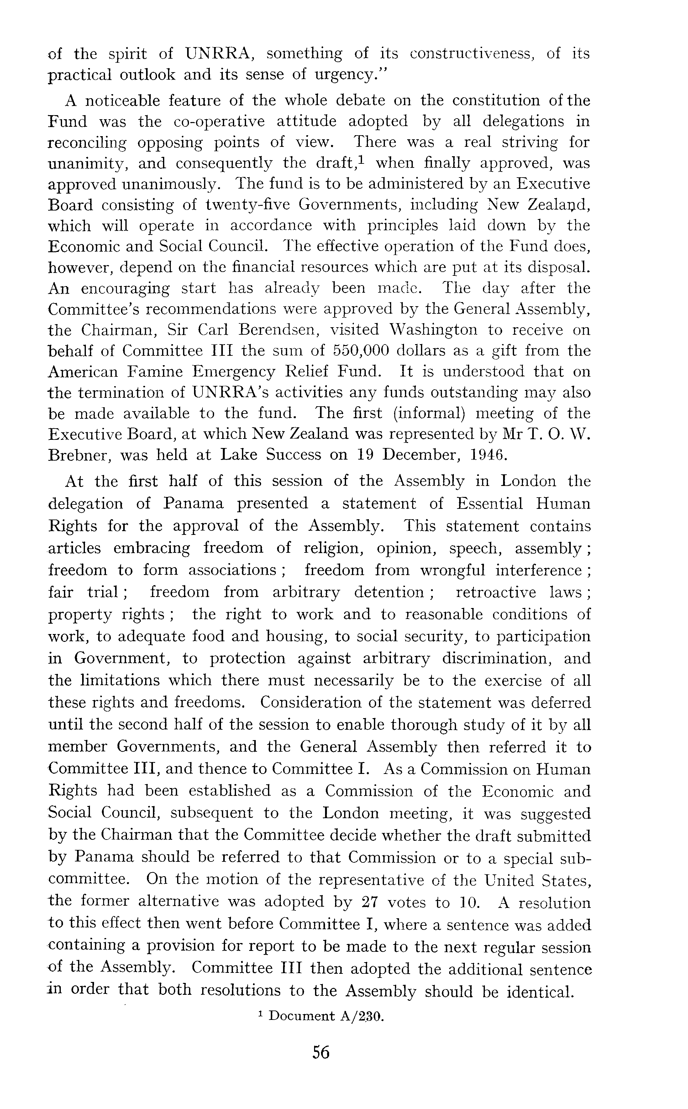 of the spirit of UNRRA, something of its constructiveness, of its practical outlook and its sense of urgency." A noticeable feature of the whole debate on the constitution of the Fund was the co-operative attitude adopted by all delegations in reconciling opposing points of view. There was a real striving for unanimity, and consequently the draft, 1 when finally approved, was approved unanimously. The fund is to be administered by an Executive Board consisting of twenty-five Governments, including New Zealaijd, which will operate in accordance with principles laid down by the Economic and Social Council. The effective operation of the Fund does, however, depend on the financial resources which are put at its disposal. An encouraging start has already been made. The day after the Committee's recommendations were approved by the General Assembly, the Chairman, Sir Carl Berendsen, visited Washington to receive on behalf of Committee 111 the sum of 550,000 dollars as a gift from the American Famine Emergency Relief Fund. It is understood that on the termination of UNRRA's activities any funds outstanding may also be made available to the fund. The first (informal) meeting of the Executive Board, at which New Zealand was represented by Mr T. O. W. Brebner, was held at Lake Success on 19 December, 1946. At the first half of this session of the Assembly in London the delegation of Panama presented a statement of Essential Human Rights for the approval of the Assembly. This statement contains articles embracing freedom of religion, opinion, speech, assembly; freedom to form associations ; freedom from wrongful interference ; fair trial; freedom from arbitrary detention; retroactive laws; property rights ; the right to work and to reasonable conditions of work, to adequate food and housing, to social security, to participation in Government, to protection against arbitrary discrimination, and the limitations which there must necessarily be to the exercise of all these rights and freedoms. Consideration of the statement was deferred until the second half of the session to enable thorough study of it by all member Governments, and the General Assembly then referred it to Committee 111, and thence to Committee I. As a Commission on Human Rights had been established as a Commission of the Economic and Social Council, subsequent to the London meeting, it was suggested by the Chairman that the Committee decide whether the draft submitted by Panama should be referred to that Commission or to a special subcommittee. On the motion of the representative of the United States, the former alternative was adopted by 27 votes to 10. A resolution to this effect then went before Committee I, where a sentence was added containing a provision for report to be made to the next regular session •of the Assembly. Committee 111 then adopted the additional sentence in order that both resolutions to the Assembly should be identical.