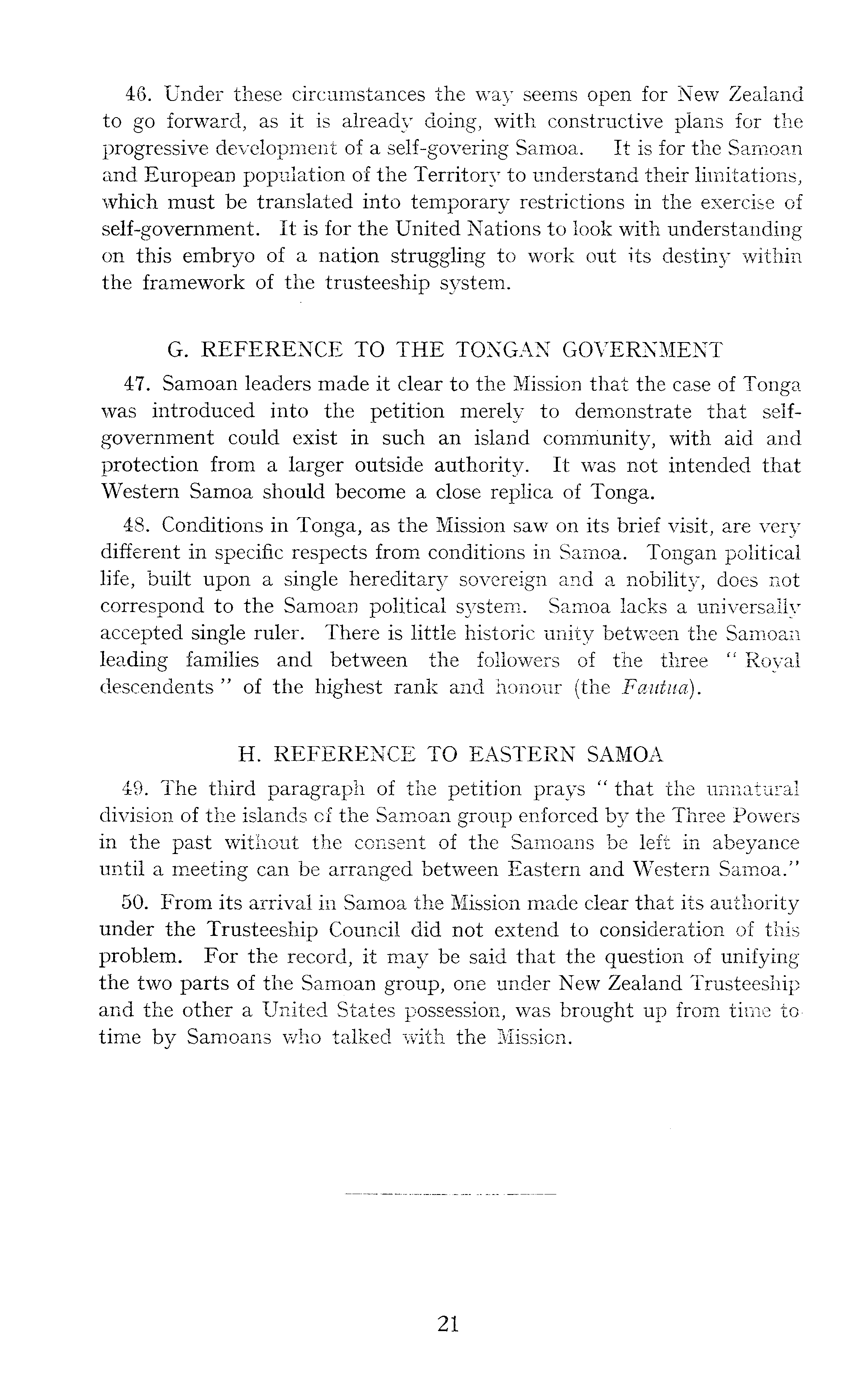 46. Under these circumstances the way seems open for New Zealand to go forward, as it is already doing, with constructive plans for the progressive development of a self-govering Samoa. It is for the Samoan and European population of the Territory to understand their limitations, which must be translated into temporary restrictions in the exercise of self-government. It is for the United Nations to look with understanding on this embryo of a nation struggling to work out its destiny within the framework of the trusteeship system. G. REFERENCE TO THE TONGAN GOVERNMENT 47. Samoan leaders made it clear to the Mission that the case of Tonga was introduced into the petition merely to demonstrate that selfgovernment could exist in such an island community, with aid and protection from a larger outside authority. It was not intended that Western Samoa should become a close replica of Tonga. 48. Conditions in Tonga, as the Mission saw on its brief visit, are very different in specific respects from conditions in Samoa. Tongan political life, built upon a single hereditary sovereign and a nobility, does not correspond to the Samoan political system. Samoa lacks a universally accepted single ruler. There is little historic unity between the Samoan leading families and between the followers of the three " Royal descendents " of the highest rank and honour (the Fautua). H. REFERENCE TO EASTERN SAMOA 49. The third paragraph of the petition prays " that the unnatural division of the islands of the Samoan group enforced by the Three Powers in the past without the consent of the Samoan s be left in abeyance until a meeting can be arranged between Eastern and Western Samoa." 50. From its arrival in Samoa the Mission made clear that its authority under the Trusteeship Council did not extend to consideration of this problem. For the record, it may be said that the question of unifying the two parts of the Samoan group, one under New Zealand Trusteeship and the other a United States possession, was brought up from time totime by Samoans who talked with the Mission.