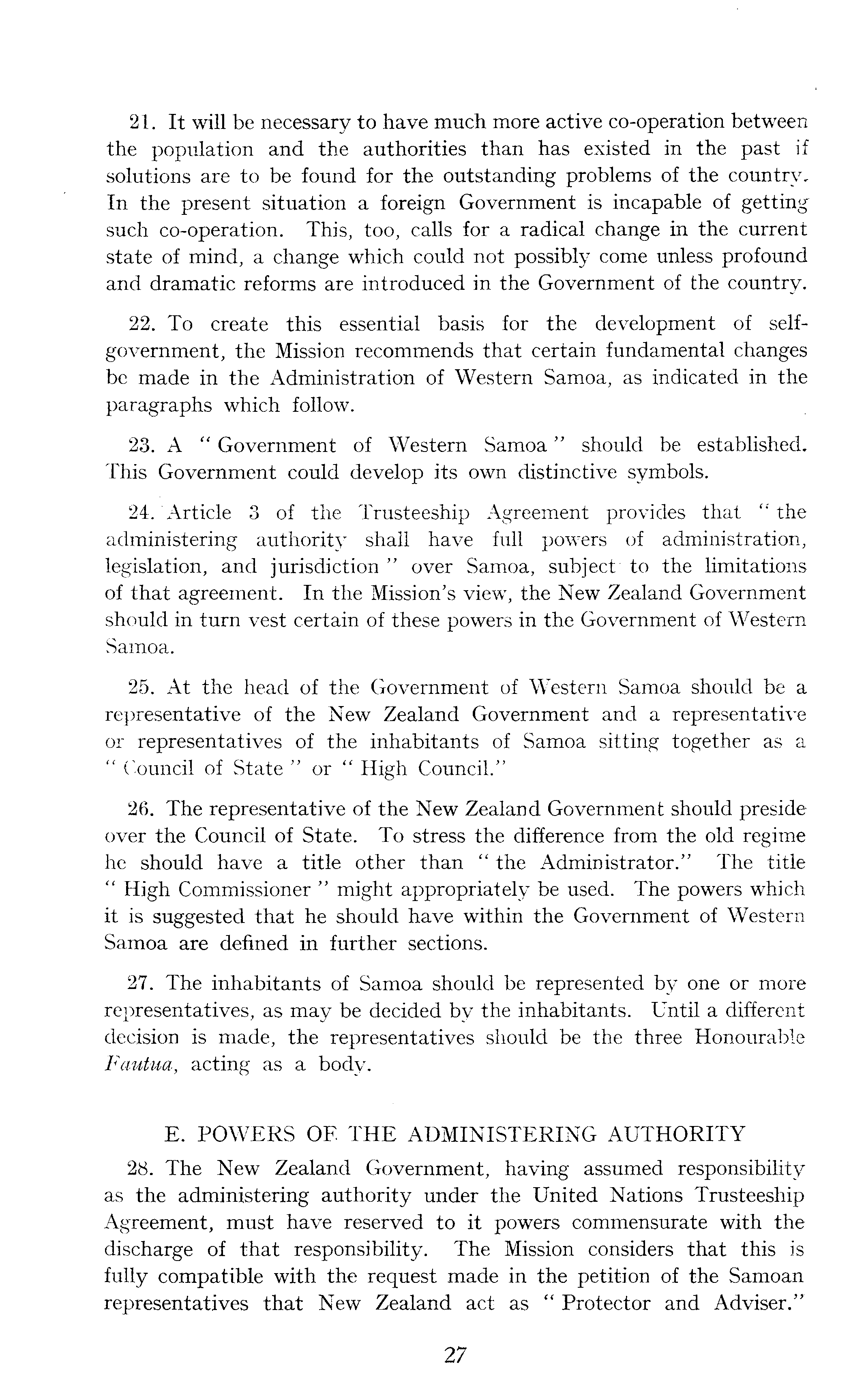 21. It will be necessary to have much more active co-operation between the population and the authorities than has existed in the past if solutions are to be found for the outstanding problems of the country. In the present situation a foreign Government is incapable of getting such co-operation. This, too, calls for a radical change in the current state of mind, a change which could not possibly come unless profound and dramatic reforms are introduced in the Government of the country. 22. To create this essential basis for the development of selfgovernment, the Mission recommends that certain fundamental changes be made in the Administration of Western Samoa, as indicated in the paragraphs which follow. 23. A " Government of Western Samoa" should be established. This Government could develop its own distinctive symbols. 24. Article 3 of the Trusteeship Agreement provides that " the administering authority shall have full powers of administration, legislation, and jurisdiction " over Samoa, subject to the limitations of that agreement. In the Mission's view, the New Zealand Government should in turn vest certain of these powers in the Government of Western Samoa. 25. At the head of the Government of Western Samoa should be a representative of the New Zealand Government and a representative or representatives of the inhabitants of Samoa sitting together as a " Council of State " or " High Council." 26. The representative of the New Zealand Government should preside over the Council of State. To stress the difference from the old regime he should have a title other than " the Administrator." The title " High Commissioner " might appropriately be used. The powers which it is suggested that he should have within the Government of Western Samoa are defined in further sections. 27. The inhabitants of Samoa should be represented by one or more representatives, as may be decided by the inhabitants. Until a different decision is made, the representatives should be the three Honourable Fautua, acting as a body. E. POWERS OF. THE ADMINISTERING AUTHORITY 28. The New Zealand Government, having assumed responsibility as the administering authority under the United Nations Trusteeship Agreement, must have reserved to it powers commensurate with the discharge of that responsibility. The Mission considers that this is fully compatible with the request made in the petition of the Samoan representatives that New Zealand act as " Protector and Adviser."