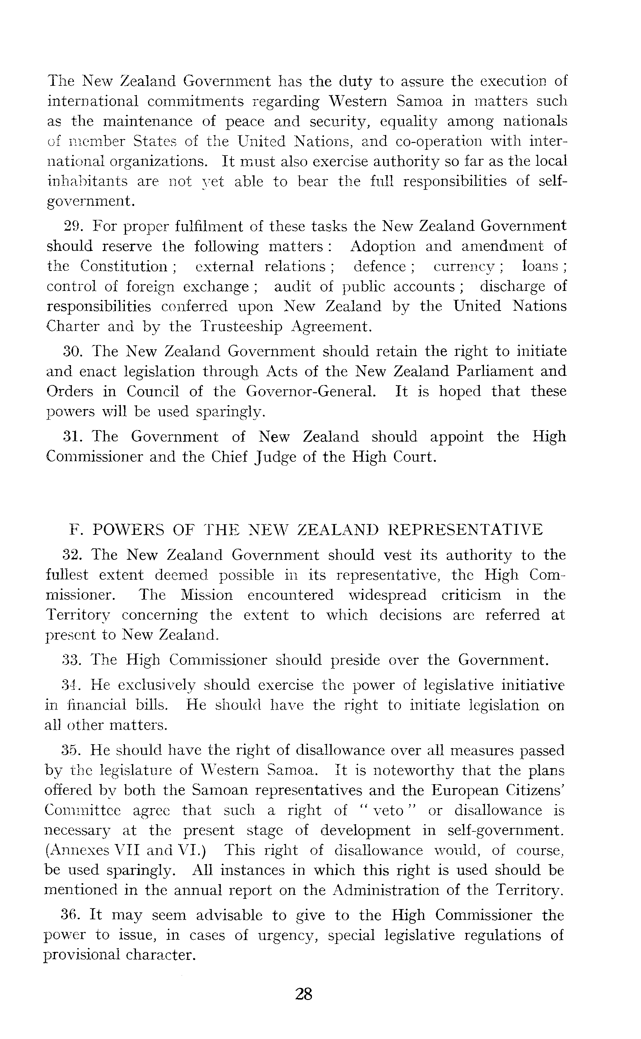 The New Zealand Government has the duty to assure the execution of international commitments regarding Western Samoa in matters such as the maintenance of peace and security, equality among nationals of member States of the United Nations, and co-operation with international organizations. It must also exercise authority so far as the local inhabitants are not yet able to bear the full responsibilities of selfgovernment. 29. For proper fulfilment of these tasks the New Zealand Government should reserve the following matters : Adoption and amendment of the Constitution ; external relations ; defence ; currency ; loans ; control of foreign exchange ; audit of public accounts; discharge of responsibilities conferred upon New Zealand by the United Nations Charter and by the Trusteeship Agreement. 30. The New Zealand Government should retain the right to initiate and enact legislation through Acts of the New Zealand Parliament and Orders in Council of the Governor-General. It is hoped that these powers will be used sparingly. 31. The Government of New Zealand should appoint the High Commissioner and the Chief Judge of the High Court. F. POWERS OF THE NEW ZEALAND REPRESENTATIVE 32. The New Zealand Government should vest its authority to the fullest extent deemed possible in its representative, the High Commissioner. The Mission encountered widespread criticism in the Territory concerning the extent to which decisions are referred at present to New Zealand. 33. The High Commissioner should preside over the Government. 34. He exclusively should exercise the power of legislative initiative in financial bills. He should have the right to initiate legislation on all other matters. 35. He should have the right of disallowance over all measures passed by the legislature of Western Samoa. It is noteworthy that the plans offered by both the Samoan representatives and the European Citizens' Committee agree that such a right of " veto" or disallowance is necessary at the present stage of development in self-government. (Annexes VII and VI.) This right of disallowance would, of course, be used sparingly. All instances in which this right is used should be mentioned in the annual report on the Administration of the Territory. 36. It may seem advisable to give to the High Commissioner the power to issue, in cases of urgency, special legislative regulations of provisional character.