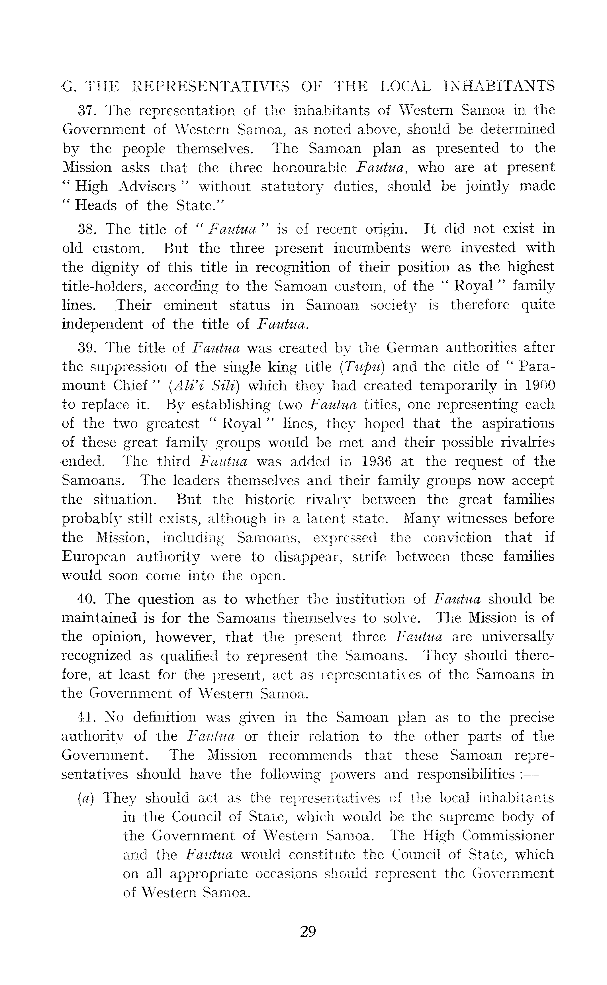 G. THE REPRESENTATIVES OF THE LOCAL INHABITANTS 37. The representation of the inhabitants of Western Samoa in the Government of Western Samoa, as noted above, should be determined by the people themselves. The Samoan plan as presented to the Mission asks that the three honourable Fautua, who are at present " High Advisers" without statutory duties, should be jointly made ■" Heads of the State." 38. The title of " Fautua " is of recent origin. It did not exist in old custom. But the three present incumbents were invested with the dignity of this title in recognition of their position as the highest title-holders, according to the Samoan custom, of the " Royal" family lines. Their eminent status in Samoan society is therefore quite independent of the title of Fautua. 39. The title of Fautua was created by the German authorities after the suppression of the single king title (Tupu) and the title of " Paramount Chief " {AWi Sili) which they had created temporarily in 1900 to replace it. By establishing two Fautua titles, one representing each of the two greatest " Royal" lines, they hoped that the aspirations of these great family groups would be met and their possible rivalries ended. The third Fautua was added in 1936 at the request of the Samoans. The leaders themselves and their family groups now accept the situation. But the historic rivalry between the great families probably still exists, although in a latent state. Many witnesses before the Mission, including Samoans, expressed the conviction that if European authority were to disappear, strife between these families would soon come into the open. 40. The question as to whether the institution of Fautua should be maintained is for the Samoans themselves to solve. The Mission is of the opinion, however, that the present three Fautua are universally recognized as qualified to represent the Samoans. They should therefore, at least for the present, act as representatives of the Samoans in the Government of Western Samoa. 41. No definition was given in the Samoan plan as to the precise authority of the Fautua or their relation to the other parts of the Government. The Mission recommends that these Samoan representatives should have the following powers and responsibilities : (a) They should act as the representatives of the local inhabitants in the Council of State, which would be the supreme body of the Government of Western Samoa. The High Commissioner and the Fautua would constitute the Council of State, which on all appropriate occasions should represent the Government of Western Samoa.