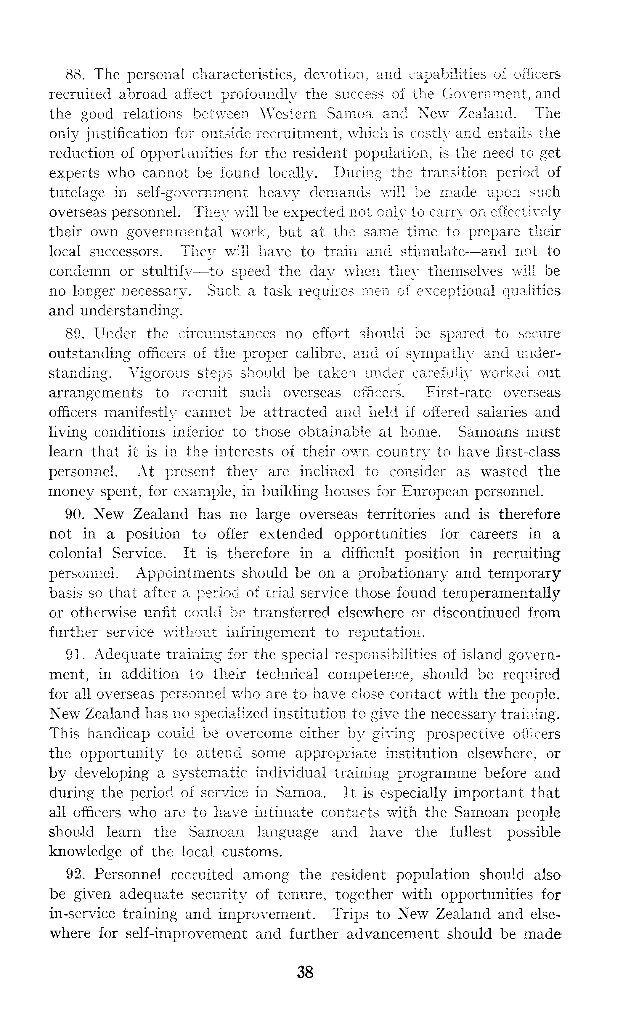 88. The personal characteristics, devotion, and capabilities of officers recruited abroad affect profoundly the success of the Government, and the good relations between Western Samoa and New Zealand. The only justification for outside recruitment, which is costly and entails the reduction of opportunities for the resident population, is the need to get experts who cannot be found locally. During the transition period of tutelage in self-government heavy demands will be made upon such overseas personnel. They will be expected not only to carry on effectively their own governmental work, but at the same time to prepare their local successors. They will have to train and stimulate —and not to condemn or stultify—to speed the day when they themselves will be no longer necessary. Such a task requires men of exceptional qualities and understanding. 89. Under the circumstances no effort should be spared to secure outstanding officers of the proper calibre, and of sympathy and understanding. Vigorous steps should be taken under carefully worked out arrangements to recruit such overseas officers. First-rate overseas officers manifestly cannot be attracted and held if offered salaries and living conditions inferior to those obtainable at home. Samoans must learn that it is in the interests of their own country to have first-class personnel. At present they are inclined to consider as wasted the money spent, for example, in building houses for European personnel. 90. New Zealand has no large overseas territories and is therefore not in a position to offer extended opportunities for careers in a colonial Service. It is therefore in a difficult position in recruiting personnel. Appointments should be on a probationary and temporary basis so that after a period of trial service those found temperamentally or otherwise unfit could be transferred elsewhere or discontinued from further service without infringement to reputation. 91. Adequate training for the special responsibilities island government, in addition to their technical competence, should be required for all overseas personnel who are to have close contact with the people. New Zealand has no specialized institution to give the necessary training. This handicap could be overcome either by giving prospective officers the opportunity to attend some appropriate institution elsewhere, or by developing a systematic individual training programme before and during the period of service in Samoa. It is especially important that all officers who are to have intimate contacts with the Samoan people should learn the Samoan language and have the fullest possible knowledge of the local customs. 92. Personnel recruited among the resident population should also be given adequate security of tenure, together with opportunities for in-service training and improvement. Trips to New Zealand and elsewhere for self-improvement and further advancement should be made
