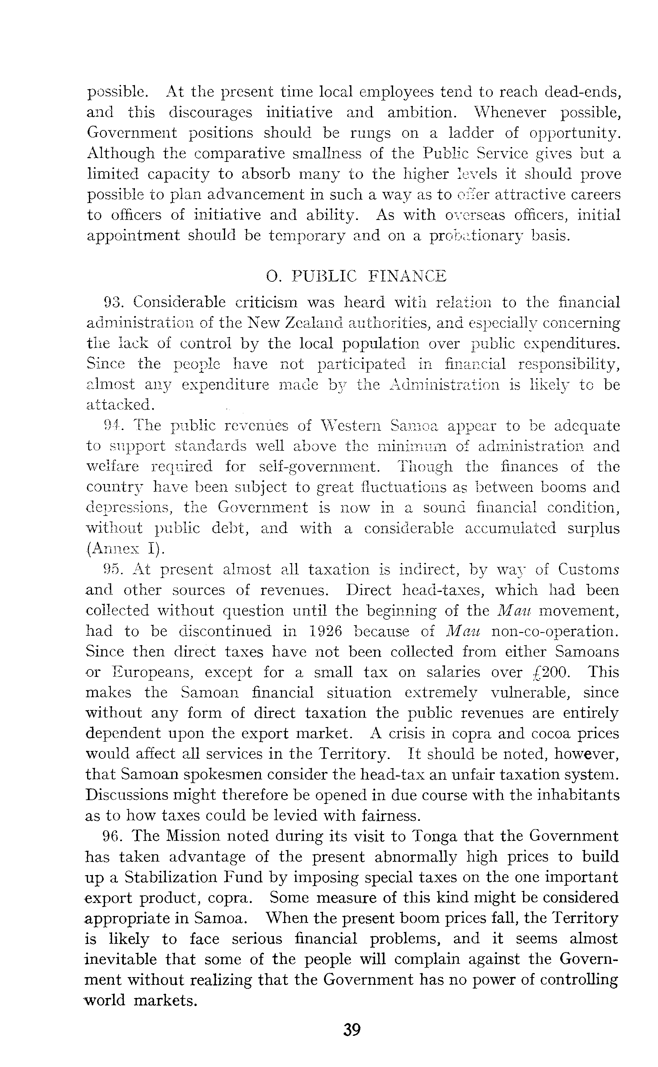 possible. At the present time local employees tend to reach dead-ends, and this discourages initiative and ambition. Whenever possible, Government positions should be rungs on a ladder of opportunity. Although the comparative smallness of the Public Service gives but a limited capacity to absorb many to the higher levels it should prove possible to plan advancement in such a way as to offer attractive careers to officers of initiative and ability. As with overseas officers, initial appointment should be temporary and on a probationary basis. o. Public finance 93. Considerable criticism was heard with relation to the financial administration of the New Zealand authorities, and especially concerning the lack of control by the local population over public expenditures. Since the people have not participated in financial responsibility, almost any expenditure made by the Administration is likely to be attacked. 94. The public to support standards well above the minimum of administration and welfare required for self-government. Though the finances of the country have been subject to great fluctuations as between booms and depressions, the Government is now in a sound financial condition, without public debt, and with a considerable accumulated surplus (Annex I). 95. At present almost all taxation is indirect, by way of Customs and other sources of revenues. Direct head-taxes, which had been collected without question until the beginning of the Mau movement, had to be discontinued in 1926 because of Mau non-co-operation. Since then direct taxes have not been collected from either Samoans or Europeans, except for a small tax on salaries over £2OO. This makes the Samoan financial situation extremely vulnerable, since without any form of direct taxation the public revenues are entirely dependent upon the export market. A crisis in copra and cocoa prices would affect all services in the Territory. It should be noted, however, that Samoan spokesmen consider the head-tax an unfair taxation system. Discussions might therefore be opened in due course with the inhabitants as to how taxes could be levied with fairness. 96. The Mission noted during its visit to Tonga that the Government has taken advantage of the present abnormally high prices to build up a Stabilization Fund by imposing special taxes on the one important export product, copra. Some measure of this kind might be considered appropriate in Samoa. When the present boom prices fall, the Territory is likely to face serious financial problems, and it seems almost inevitable that some of the people will complain against the Government without realizing that the Government has no power of controlling world markets.