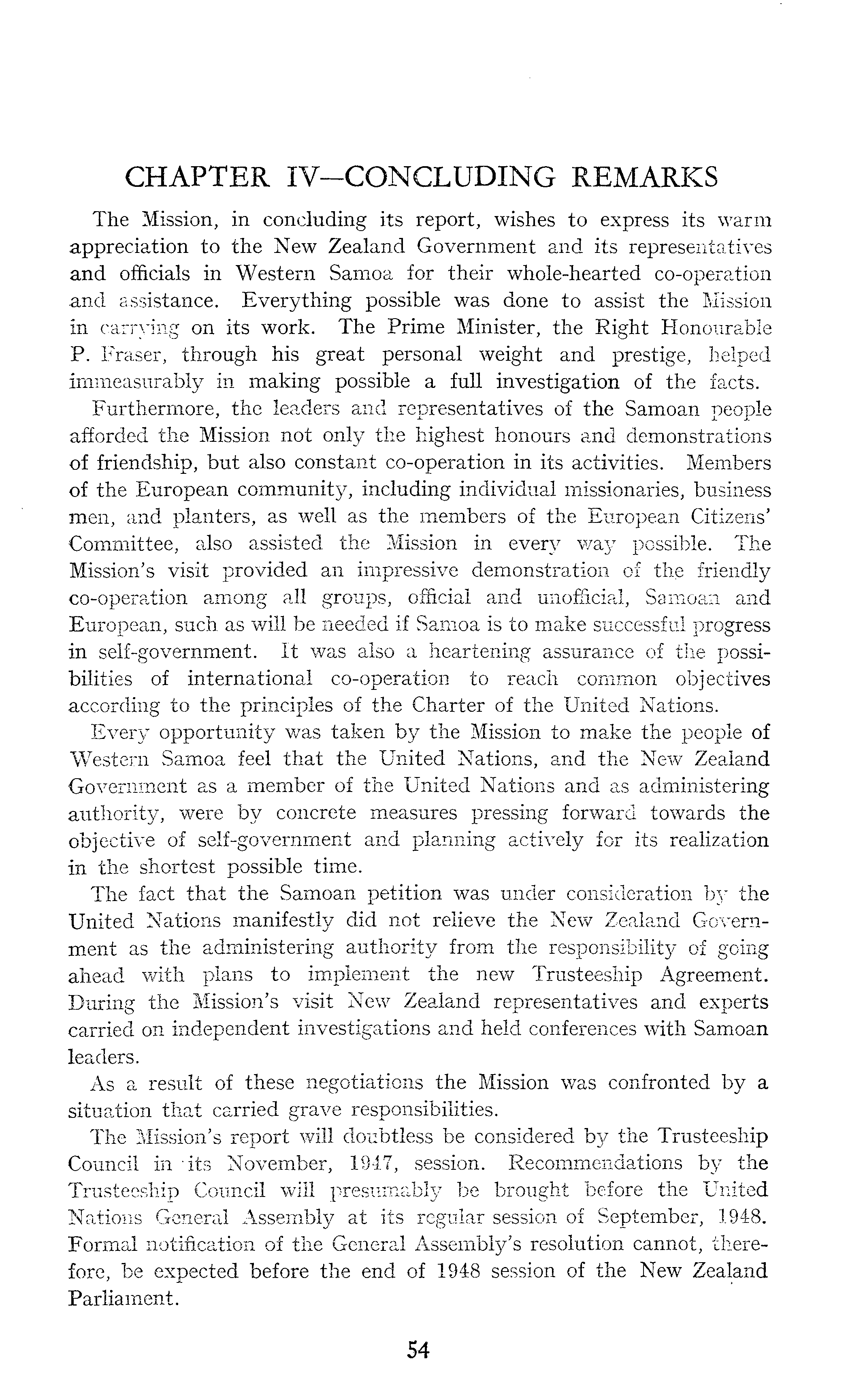 CHAPTER IV—CONCLUDING REMARKS The Mission, in concluding its report, wishes to express its warm appreciation to the New Zealand Government and its representatives and officials in Western Samoa for their whole-hearted co-operation and assistance. Everything possible was done to assist the Mission in carrying on its work. The Prime Minister, the Right Honourable P. Fraser, through his great personal weight and prestige, helped immeasurably in making possible a full investigation of the facts. Furthermore, the leaders and representatives of the Samoan people afforded the Mission not only the highest honours and demonstrations of friendship, but also constant co-operation in its activities. Members of the European community, including individual missionaries, business men, and planters, as well as the members of the European Citizens' Committee, also assisted the Mission in every possible. The Mission's visit provided an impressive demonstration of the friendly co-operation among all groups, official and unofficial, Samoan and European, such as will be needed if Samoa is to make successful progress in self-government. It was also a heartening assurance of the possibilities of international co-operation to reach common objectives according to the principles of the Charter of the United Nations. Every opportunity was taken by the Mission to make the people of Western Samoa feel that the United Nations, and the New Zealand Government as a member of the United Nations and as administering authority, were by concrete measures pressing forward towards the objective of self-government and planning actively for its realization in the shortest possible time. The fact that the Samoan petition was under consideration by the United Nations manifestly did not relieve the New Zealand Government as the administering authority from the responsibility of going ahead with plans to implement the new Trusteeship Agreement. During the Mission's visit New Zealand representatives and experts carried on independent investigations and held conferences with Samoan leaders. As a result of these negotiations the Mission was confronted by a situation that carried grave responsibilities. The Mission's report will doubtless be considered by the Trusteeship Council in its November, 1947, session. Recommendations by the Trusteeship Council will presumably be brought before the United Nations General Assembly at its regular session of September, 1948. Formal notification of the General Assembly's resolution cannot, therefore, be expected before the end of 1948 session of the New Zealand Parliament.