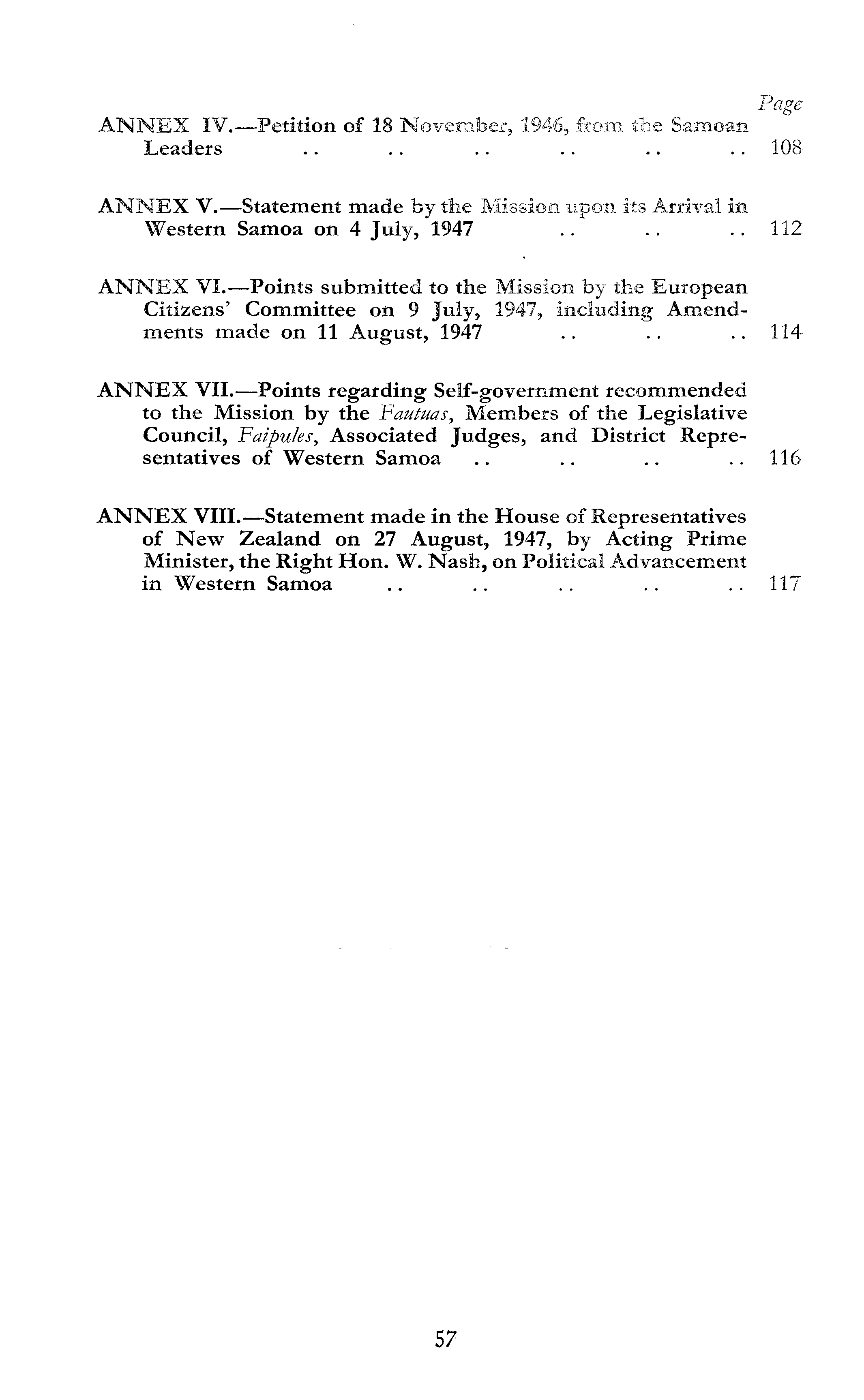 Page ANNEX IV.—Petition of 18 November, 1946, from the Samoan Leaders .. .. .. .. .. .. 108 ANNEX V.—Statement made by the Mission upon its Arrival in Western Samoa on 4 July, 1947 .. .. 112 ANNEX Vl.—Points submitted to the Mission by the European Citizens' Committee on 9 July, 1947, including Amendments made on 11 August, 1947 .. .. ..114 ANNEX Vll.—Points regarding Self-government recommended to the Mission by the Fautuas, Members of the Legislative Council, Faipules, Associated Judges, and District Representatives of Western Samoa .. .. .. 116 ANNEX Vlll.—Statement made in the House of Representatives of New Zealand on 27 August, 1947, by Acting Prime Minister, the Right Hon. W. Nash, on Political Advancement in Western Samoa .. .. .. .. ..117