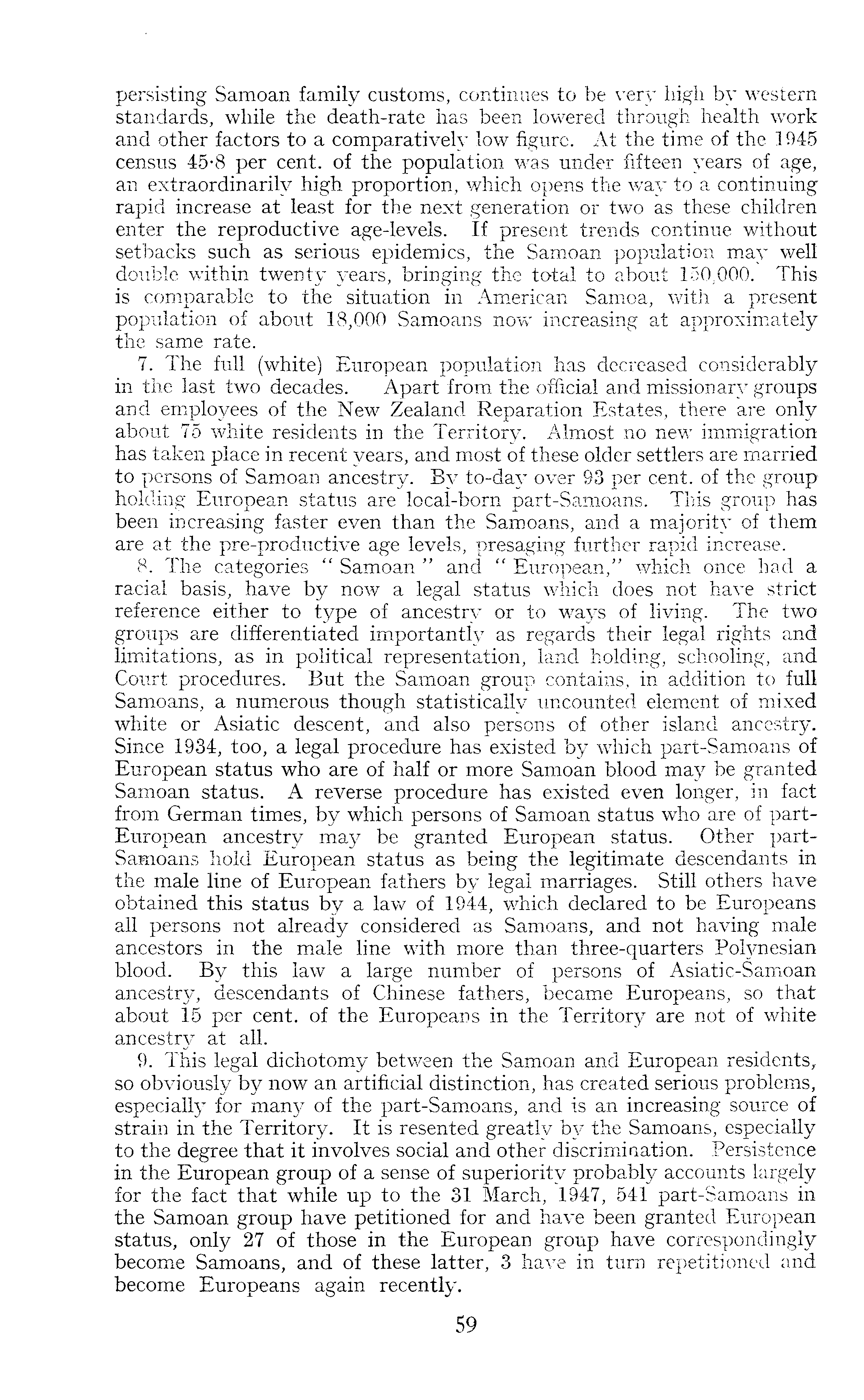 persisting Samoan family customs, continues to be very high by western standards, while the death-rate has been lowered through health work and other factors to a low figure. At the time of the 1945 census 45-8 per cent, of the population was under fifteen years of age, an extraordinarily high proportion, which opens the way to a continuing rapid increase at least for the next generation or two as these children enter the reproductive age-levels. If present trends continue without setbacks such as serious epidemics, the Samoan population may well double within twenty years, bringing the total to about 150,000. This is comparable to the situation in American Samoa, with a present population of about 18,000 Samoans now increasing at approximately the same rate. 7. The full (white) European population has decreased considerably in the last two decades. Apart from the official and missionary groups and employees of the New Zealand Reparation Estates, there are only about 75 white residents in the Territory. Almost no new immigration has taken place in recent years, and most of these older settlers are married to persons of Samoan ancestry. By to-day over 93 per cent, of the group holding European status are local-born part-Samoans. This group has been increasing faster even than the Samoans, and a majority of them are at the pre-productive age levels, presaging further rapid increase. 8. The categories " Samoan " and " European," which once had a racial basis, have by now a legal status which does not have strict reference either to type of ancestry or to ways of living. The two groups are differentiated importantly as regards their legal rights and limitations, as in political representation, land holding, schooling, and Court procedures. But the Samoan group contains, in addition to full Samoans, a numerous though statistically uncounted element of mixed white or Asiatic descent, and also persons of other island ancestry. Since 1934, too, a legal procedure has existed by which part-Samoans of European status who are of half or more Samoan blood may be granted Samoan status. A reverse procedure has existed even longer, in fact from German times, by which persons of Samoan status who are of partEuropean ancestry may be granted European status. Other partSamoans hold European status as being the legitimate descendants in the male line of European fathers by legal marriages. Still others have obtained this status by a law of 1944, which declared to be Europeans all persons not already considered as Samoans, and not having male ancestors in the male line with more than three-quarters Polynesian blood. By this law a large number of persons of Asiatic-Samoan ancestry, descendants of Chinese fathers, became Europeans, so that about 15 per cent, of the Europeans in the Territory are not of white ancestry at all. 9. This legal dichotomy between the Samoan and European residents, so obviously by now an artificial distinction, has created serious problems, especially for many of the part-Samoans, and is an increasing source of strain in the Territory. It is resented greatly by the Samoans, especially to the degree that it involves social and other discrimination. Persistence in the European group of a sense of superiority probably accounts largely for the fact that while up to the 31 March, 1947, 541 part-Samoans in the Samoan group have petitioned for and have been granted European status, only 27 of those in the European group have correspondingly become Samoans, and of these latter, 3 have in turn repetitioned and become Europeans again recently.