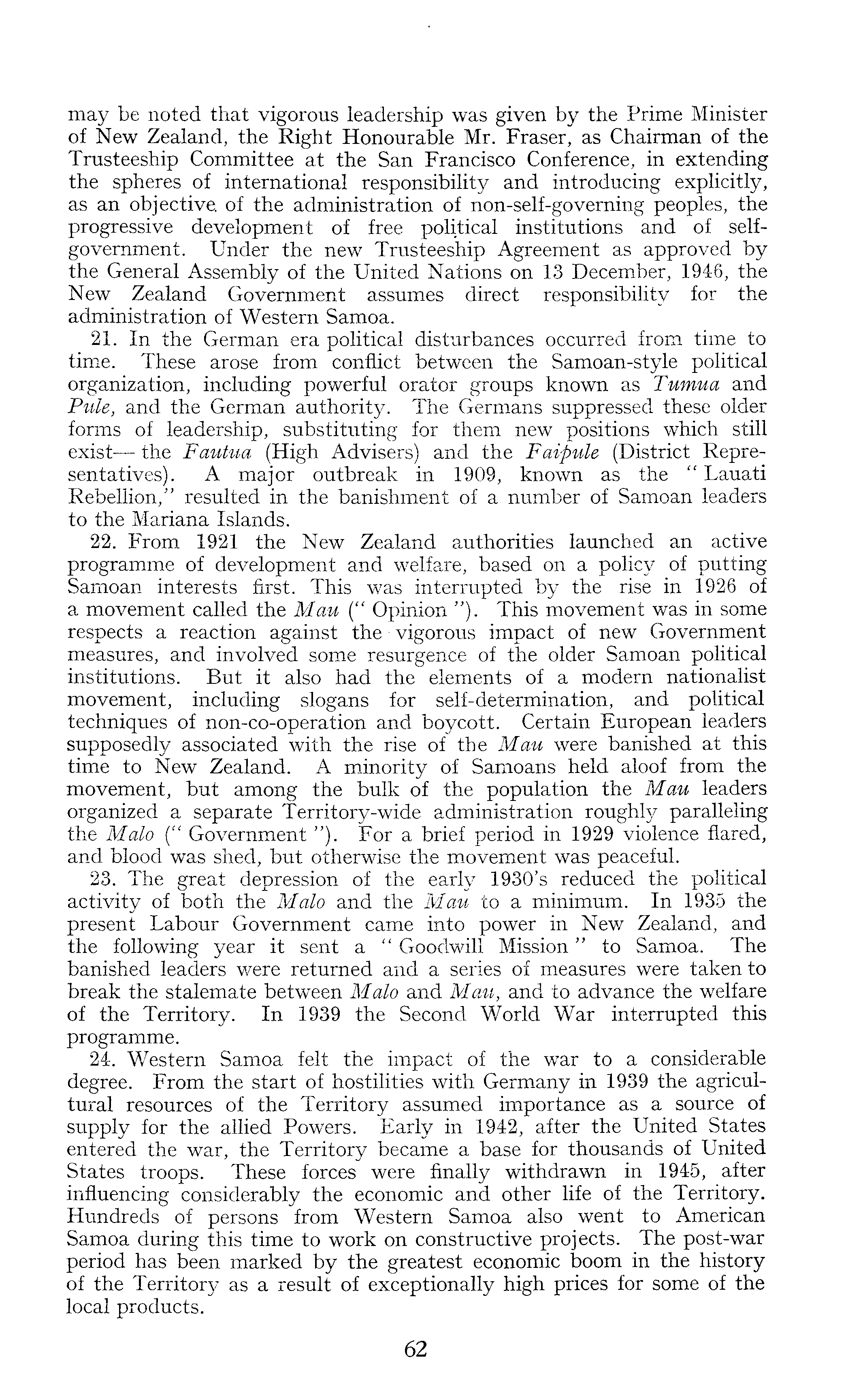 may be noted that vigorous leadership was given by the Prime Minister of New Zealand, the Right Honourable Mr. Fraser, as Chairman of the Trusteeship Committee at the San Francisco Conference, in extending the spheres of international responsibility and introducing explicitly, as an objective of the administration of non-self-governing peoples, the progressive development of free political institutions and of selfgovernment. Under the new Trusteeship Agreement as approved by the General Assembly of the United Nations on 13 December, 1946, the New Zealand Government assumes direct responsibility for the administration of Western Samoa. 21. In the German era political disturbances occurred from time to time. These arose from conflict between the Samoan-style political organization, including powerful orator groups known as Tumua and Pule, and the German authority. The Germans suppressed these older forms of leadership, substituting for them new positions which still exist — the Fautua (High Advisers) and the Faipule (District Representatives). A major outbreak in 1909, known as the " Lauati Rebellion," resulted in the banishment of a number of Samoan leaders to the Mariana Islands. 22. From 1921 the New Zealand authorities launched an active programme of development and welfare, based on a policy of putting Samoan interests first. This was interrupted by the rise in 1926 of a movement called the Mau (" Opinion "). This movement was in some respects a reaction against the vigorous impact of new Government measures, and involved some resurgence of the older Samoan political institutions. But it also had the elements of a modern nationalist movement, including slogans for self-determination, and political techniques of non-co-operation and boycott. Certain European leaders supposedly associated with the rise of the Mau were banished at this time to New Zealand. A minority of Samoans held aloof from the movement, but among the bulk of the population the Mau leaders organized a separate Territory-wide administration roughly paralleling the Malo (" Government "). For a brief period in 1929 violence flared, and blood was shed, but otherwise the movement was peaceful. 23. The great depression of the early 1930's reduced the political activity of both the Malo and the Mau to a minimum. In 1935 the present Labour Government came into power in New Zealand, and the following year it sent a " Goodwill Mission" to Samoa. The banished leaders were returned and a series of measures were taken to break the stalemate between Malo and Mau, and to advance the welfare of the Territory. In 1939 the Second World War interrupted this programme. 24. Western Samoa felt the impact of the war to a considerable degree. From the start of hostilities with Germany in 1939 the agricultural resources of the Territory assumed importance as a source of supply for the allied Powers. Early in 1942, after the United States entered the war, the Territory became a base for thousands of United States troops. These forces were finally withdrawn in 1945, after influencing considerably the economic and other life of the Territory. Hundreds of persons from Western Samoa also went to American Samoa during this time to work on constructive projects. The post-war period has been marked by the greatest economic boom in the history of the Territory as a result of exceptionally high prices for some of the local products.