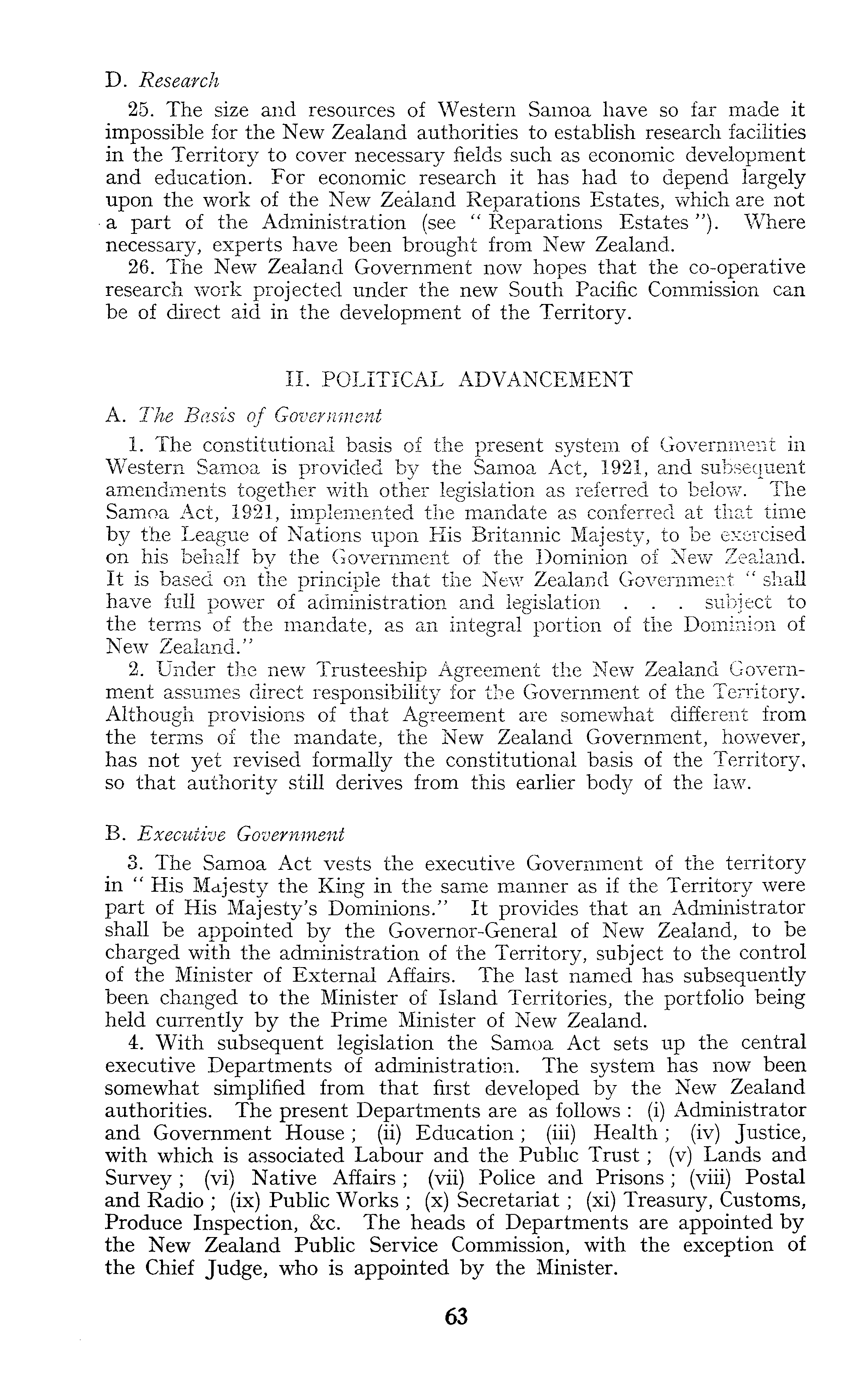 D. Research 25. The size and resources of Western Samoa have so far made it impossible for the New Zealand authorities to establish research facilities in the Territory to cover necessary fields such as economic development and education. For economic research it has had to depend largely upon the work of the New Zealand Reparations Estates, which are not a part of the Administration (see " Reparations Estates"). Where necessary, experts have been brought from New Zealand. 26. The New Zealand Government now hopes that the co-operative research work projected under the new South Pacific Commission can be of direct aid in the development of the Territory. 11. POLITICAL ADVANCEMENT A. The Basis of Government 1. The constitutional basis of the present system of Government in Western Samoa is provided by the Samoa Act, 1921, and subsequent amendments together with other legislation as referred to below. The Samoa Act, 1921, implemented the mandate as conferred at that time by the League of Nations upon His Britannic Majesty, to be exercised on his behalf by the Government of the Dominion of New Zealand. It is based on the principle that the New Zealand Government " shall have full power of administration and legislation . . . subject to the terms of the mandate, as an integral portion of the Dominion of New Zealand." 2. Under the new Trusteeship Agreement the New Zealand Government assumes direct responsibility for the Government of the Territory. Although provisions of that Agreement are somewhat different from the terms of the mandate, the New Zealand Government, however, has not yet revised formally the constitutional basis of the Territory, so that authority still derives from this earlier body of the law. B. Executive Government 3. The Samoa Act vests the executive Government of the territory in " His Majesty the King in the same manner as if the Territory were part of His Majesty's Dominions." It provides that an Administrator shall be appointed by the Governor-General of New Zealand, to be charged with the administration of the Territory, subject to the control of the Minister of External Affairs. The last named has subsequently been changed to the Minister of Island Territories, the portfolio being held currently by the Prime Minister of New Zealand. 4. With subsequent legislation the Samoa Act sets up the central executive Departments of administration. The system has now been somewhat simplified from that first developed by the New Zealand authorities. The present Departments are as follows : (i) Administrator and Government House; (ii) Education; (iii) Health; (iv) Justice, with which is associated Labour and the Public Trust; (v) Lands and Survey; (vi) Native Affairs ; (vii) Police and Prisons; (viii) Postal and Radio ; (ix) Public Works ; (x) Secretariat; (xi) Treasury, Customs, Produce Inspection, &c. The heads of Departments are appointed by the New Zealand Public Service Commission, with the exception of the Chief Judge, who is appointed by the Minister.