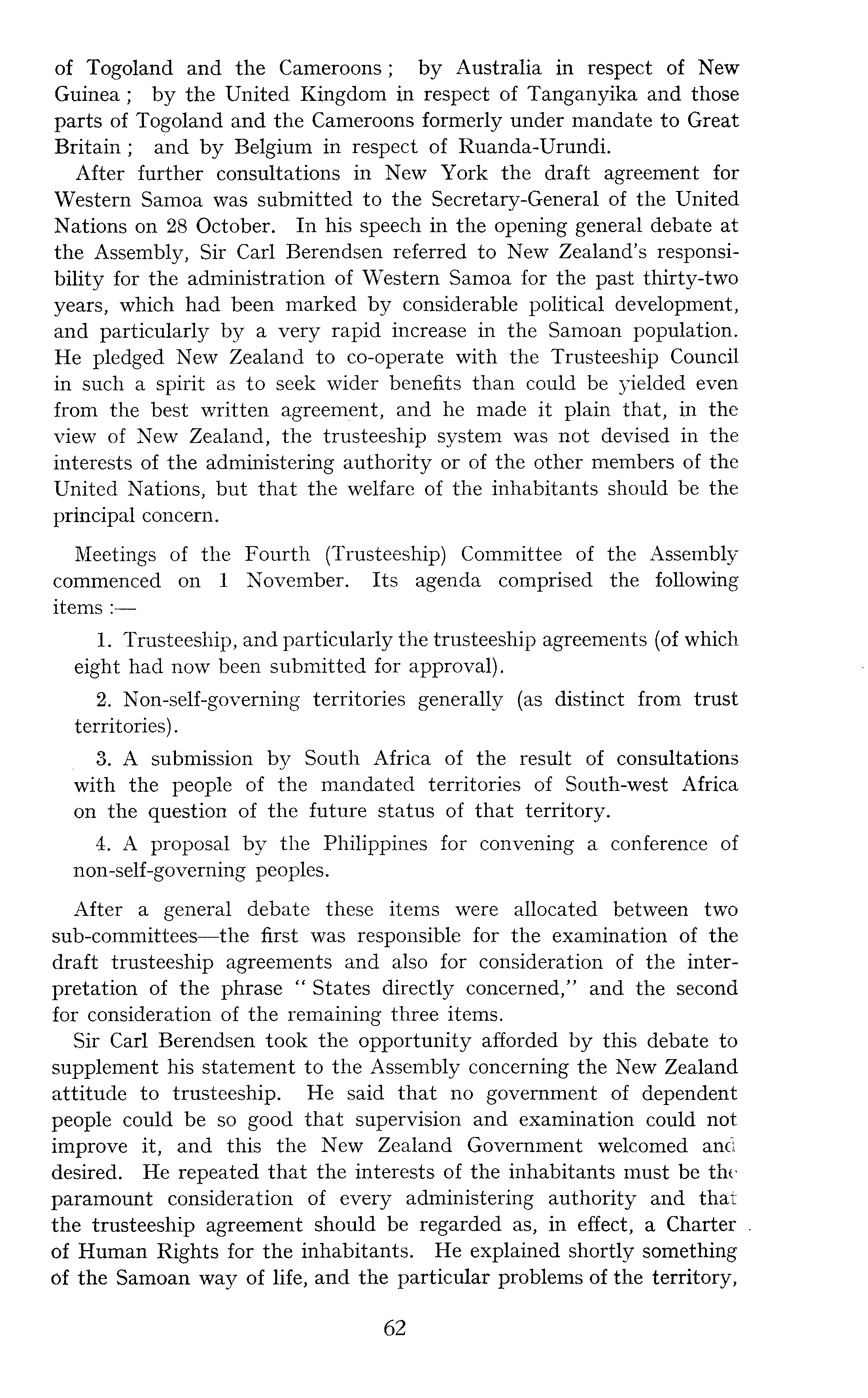 of Togoland and the Cameroons; by Australia in respect of New Guinea; by the United Kingdom in respect of Tanganyika and those parts of Togoland and the Cameroons formerly under mandate to Great Britain ; and by Belgium in respect of Ruanda-Urundi. After further consultations in New York the draft agreement for Western Samoa was submitted to the Secretary-General of the United Nations on 28 October. In his speech in the opening general debate at the Assembly, Sir Carl Berendsen referred to New Zealand's responsibility for the administration of Western Samoa for the past thirty-two years, which had been marked by considerable political development, and particularly by a very rapid increase in the Samoan population. He pledged New Zealand to co-operate with the Trusteeship Council in such a spirit as to seek wider benefits than could be yielded even from the best written agreement, and he made it plain that, in the view of New Zealand, the trusteeship system was not devised in the interests of the administering authority or of the other members of the United Nations, but that the welfare of the inhabitants should be the principal concern. Meetings of the Fourth (Trusteeship) Committee of the Assembly commenced on 1 November. Its agenda comprised the following items : 1. Trusteeship, and particularly the trusteeship agreements (of which eight had now been submitted for approval). 2. Non-self-governing territories generally (as distinct from trust territories). 3. A submission by South Africa of the result of consultations with the people of the mandated territories of South-west Africa on the question of the future status of that territory. 4. A proposal by the Philippines for convening a conference of non-self-governing peoples. After a general debate these items were allocated between twa sub-committees —the first was responsible for the examination of the draft trusteeship agreements and also for consideration of the interpretation of the phrase " States directly concerned," and the second for consideration of the remaining three items. Sir Carl Berendsen took the opportunity afforded by this debate to supplement his statement to the Assembly concerning the New Zealand attitude to trusteeship. He said that no government of dependent people could be so good that supervision and examination could not improve it, and this the New Zealand Government welcomed and desired. He repeated that the interests of the inhabitants must be the paramount consideration of every administering authority and that the trusteeship agreement should be regarded as, in effect, a Charter of Human Rights for the inhabitants. He explained shortly something Of the Samoan way of life, and the particular problems of the territory,
