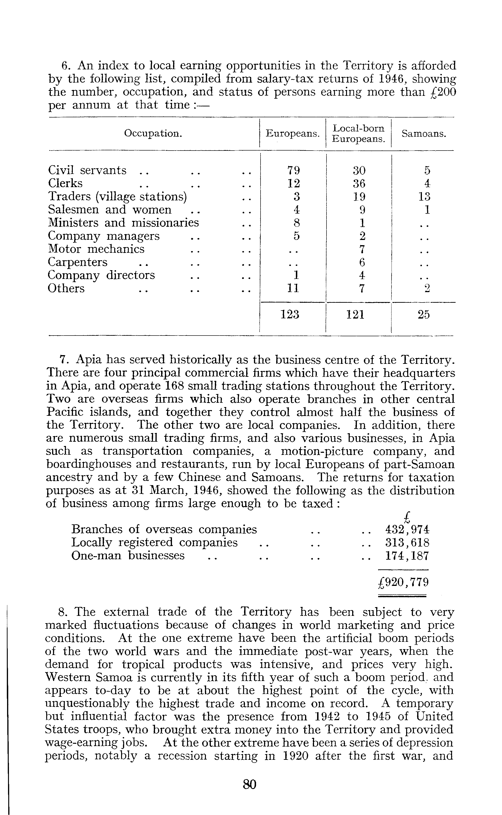7. Apia has served historically as the business centre of the Territory. There are four principal commercial firms which have their headquarters in Apia, and operate 168 small trading stations throughout the Territory. Two are overseas firms which also operate branches in other central Pacific islands, and together they control almost half the business of the Territory. The other two are local companies. In addition, there are numerous small trading firms, and also various businesses, in Apia such as transportation companies, a motion-picture company, and boardinghouses and restaurants, run by local Europeans of part-Samoan ancestry and by a few Chinese and Samoans. The returns for taxation purposes as at 31 March, 1946, showed the following as the distribution of business among firms large enough to be taxed : £ Branches of overseas companies .. .. 432,974 Locally registered companies .. .. .. 313,618 One-man businesses .. .. .. .. 174,187 £920,779 8. The external trade of the Territory has been subject to very marked fluctuations because of changes in world marketing and price conditions. At the one extreme have been the artificial boom periods of the two world wars and the immediate post-war years, when the demand for tropical products was intensive, and prices very high. Western Samoa is currently in its fifth year of such a boom period, and appears to-day to be at about the highest point of the cycle, with unquestionably the highest trade and income on record. A temporary but influential factor was the presence from 1942 to 1945 of United States troops, who brought extra money into the Territory and provided wage-earning jobs. At the other extreme have been a series of depression periods, notably a recession starting in 1920 after the first war, and