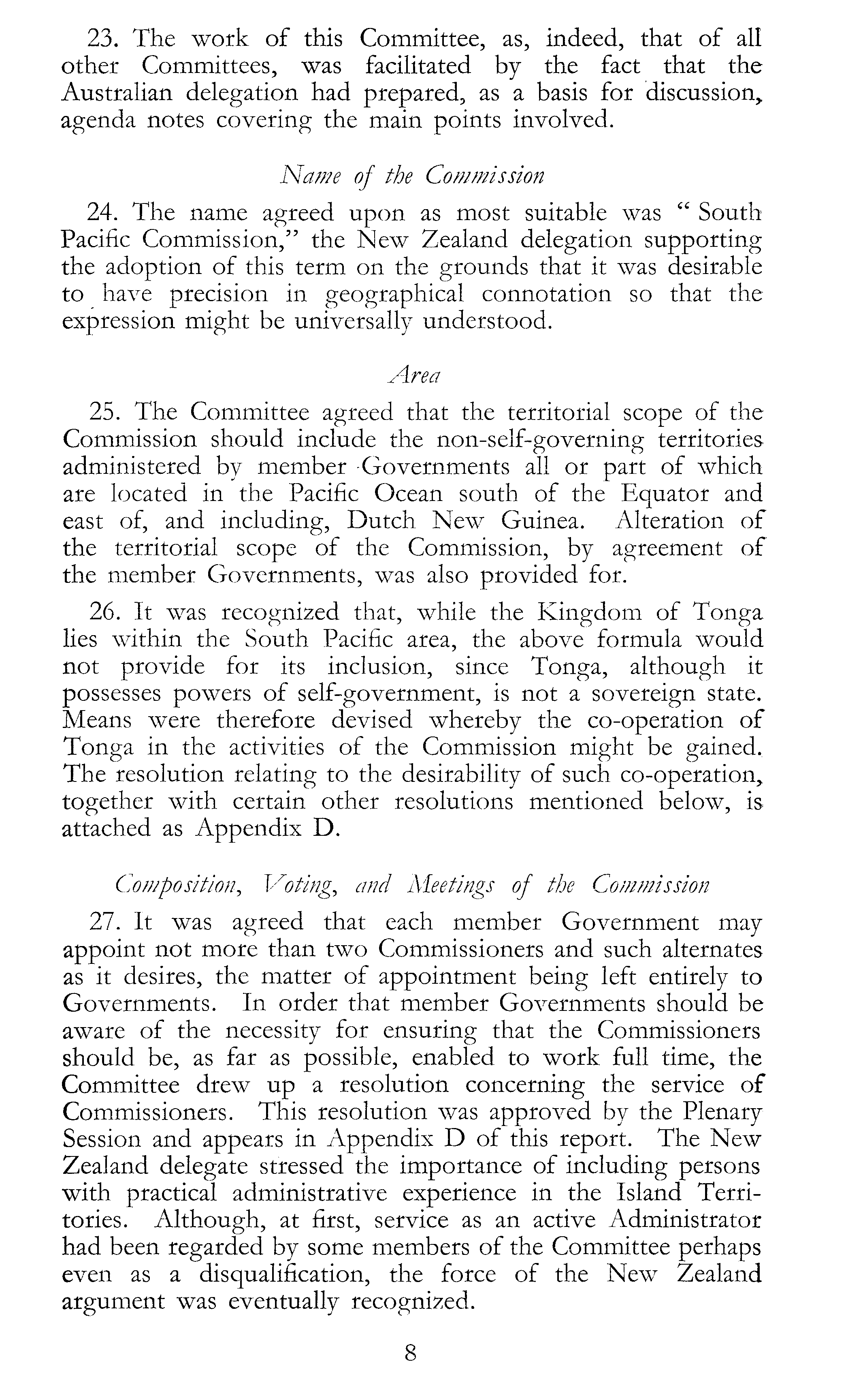 23. The work of this Committee, as, indeed, that of all other Committees, was facilitated by the fact that the Australian delegation had prepared, as a basis for discussion, agenda notes covering the main points involved. Name of the Commission 24. The name agreed upon as most suitable was " South Pacific Commission," the New Zealand delegation supporting the adoption of this term on the grounds that it was desirable to have precision in geographical connotation so that the expression might be universally understood. Area 25. The Committee agreed that the territorial scope of the Commission should include the non-self-governing territories administered by member -Governments all or part of which are located in the Pacific Ocean south of the Equator and east of, and including, Dutch New Guinea. Alteration of the territorial scope of the Commission, by agreement of the member Governments, was also provided for. 26. It was recognized that, while the Kingdom of Tonga lies within the South Pacific area, the above formula would not provide for its inclusion, since Tonga, although it possesses powers of self-government, is not a sovereign state. Means were therefore devised whereby the co-operation of Tonga in the activities of the Commission might be gained. The resolution relating to the desirability of such co-operation, together with certain other resolutions mentioned below, is attached as Appendix D. Composition, Voting,, and Meetings of the Commission 27. It was agreed that each member Government may appoint not more than two Commissioners and such alternates as it desires, the matter of appointment being left entirely to Governments. In order that member Governments should be aware of the necessity for ensuring that the Commissioners should be, as far as possible, enabled to work full time, the Committee drew up a resolution concerning the service of Commissioners. This resolution was approved by the Plenary Session and appears in Appendix D of this report. The New Zealand delegate stressed the importance of including persons with practical administrative experience in the Island Territories. Although, at first, service as an active Administrator had been regarded by some members of the Committee perhaps even as a disqualification, the force of the New Zealand argument was eventually recognized.