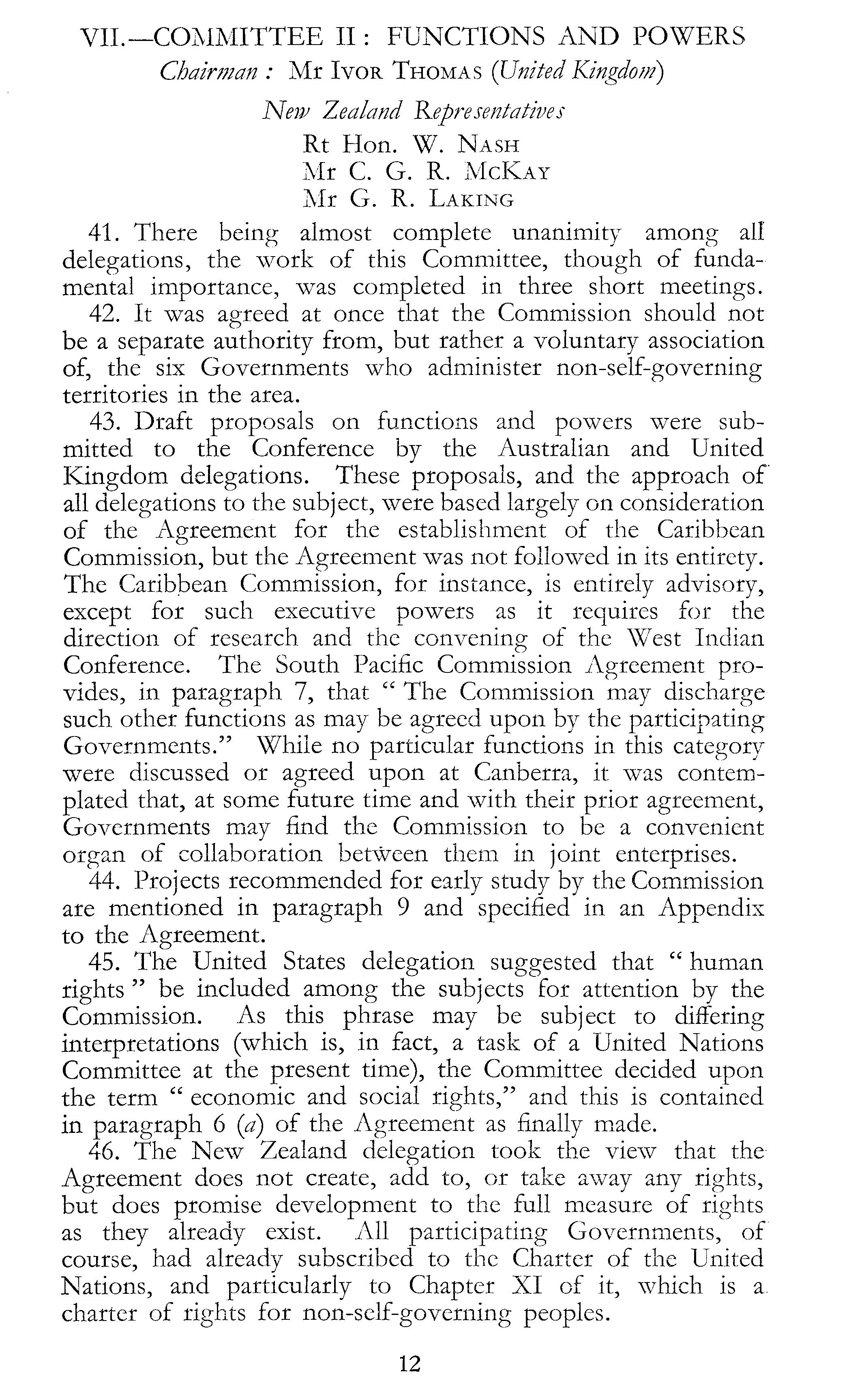 VII.—COMMITTEE II: FUNCTIONS AND POWERS Chairman : Mr Ivor Thomas (United Kingdom) New Zealand Representatives Rt Hon. W. Nash Mr C. G. R. McKay Mr G. R. Laking 41. There being almost complete unanimity among all delegations, the work of this Committee, though of fundamental importance, was completed in three short meetings. 42. It was agreed at once that the Commission should not be a separate authority from, but rather a voluntary association of, the six Governments who administer non-self-governing territories in the area. 43. Draft proposals on functions and powers were submitted to the Conference by the Australian and United Kingdom delegations. These proposals, and the approach of all delegations to the subject, were based largely on consideration of the Agreement for the establishment of the Caribbean Commission, but the Agreement was not followed in its entirety. The Caribbean Commission, for instance, is entirely advisory, except for such executive powers as it requires for the direction of research and the convening of the West Indian Conference. The South Pacific Commission Agreement provides, in paragraph 7, that " The Commission may discharge such other functions as may be agreed upon by the participating Governments." While no particular functions in- this category were discussed or agreed upon at Canberra, it was contemplated that, at some future time and with their prior agreement, Governments may find the Commission to be a convenient organ of collaboration between them in joint enterprises. 44. Projects recommended for early study by the Commission are mentioned in paragraph 9 and specified in an Appendix to the Agreement. 45. The United States delegation suggested that " human rights " be included among the subjects for attention by the Commission. As this phrase may be subject to differing interpretations (which is, in fact, a task of a United Nations Committee at the present time), the Committee decided upon the term " economic and social rights," and this is contained in paragraph 6 (a) of the Agreement as finally made. 46. The New Zealand delegation took the view that the Agreement does not create, add to, or take away any rights, but does promise development to the full measure of rights as they already exist. All participating Governments, of course, had already subscribed to the Charter of the United Nations, and particularly to Chapter XI of it, which is a. charter of rights for non-self-governing peoples.