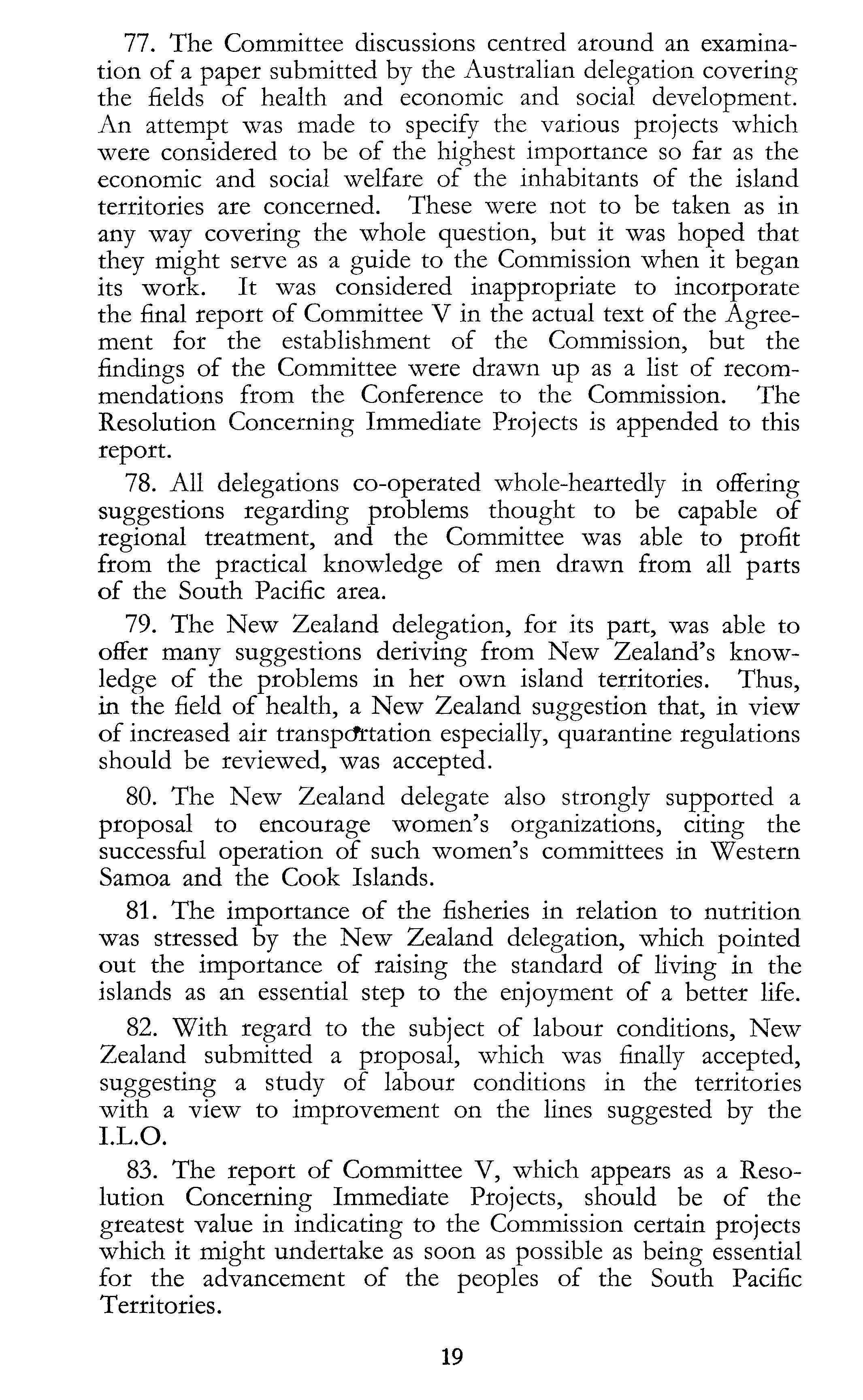 77. The Committee discussions centred around an examination of a paper submitted by the Australian delegation covering the fields of health and economic and social development. An attempt was made to specify the various projects which were considered to be of the highest importance so far as the economic and social welfare of the inhabitants of the island territories are concerned. These were not to be taken as in any way covering the whole question, but it was hoped that they might serve as a guide to the Commission when it began its work. It was considered inappropriate to incorporate the final report of Committee V in the actual text of the Agreement for the establishment of the Commission, but the findings of the Committee were drawn up as a list of recommendations from the Conference to the Commission. The Resolution Concerning Immediate Projects is appended to this report. 78. All delegations co-operated whole-heartedly in offering suggestions regarding problems thought to be capable of regional treatment, and the Committee was able to profit from the practical knowledge of men drawn from all parts of the South Pacific area. 79. The New Zealand delegation, for its part, was able to offer many suggestions deriving from New Zealand's knowledge of the problems in her own island territories. Thus, in the field of health, a New Zealand suggestion that, in view of increased air transportation especially, quarantine regulations should be reviewed, was accepted. 80. The New Zealand delegate also strongly supported a proposal to encourage women's organizations, citing the successful operation of such women's committees in Western Samoa and the Cook Islands. 81. The importance of the fisheries in relation to nutrition was stressed by the New Zealand delegation, which pointed out the importance of raising the standard of living in the islands as an essential step to the enjoyment of a better life. 82. With regard to the subject of labour conditions, New Zealand submitted a proposal, which was finally accepted, suggesting a study of labour conditions in the territories with a view to improvement on the lines suggested by the 1.L.0. 83. The report of Committee V, which appears as a Resolution Concerning Immediate Projects, should be of the greatest value in indicating to the Commission certain projects which it might undertake as soon as possible as being essential for the advancement of the peoples of the South Pacific Territories.
