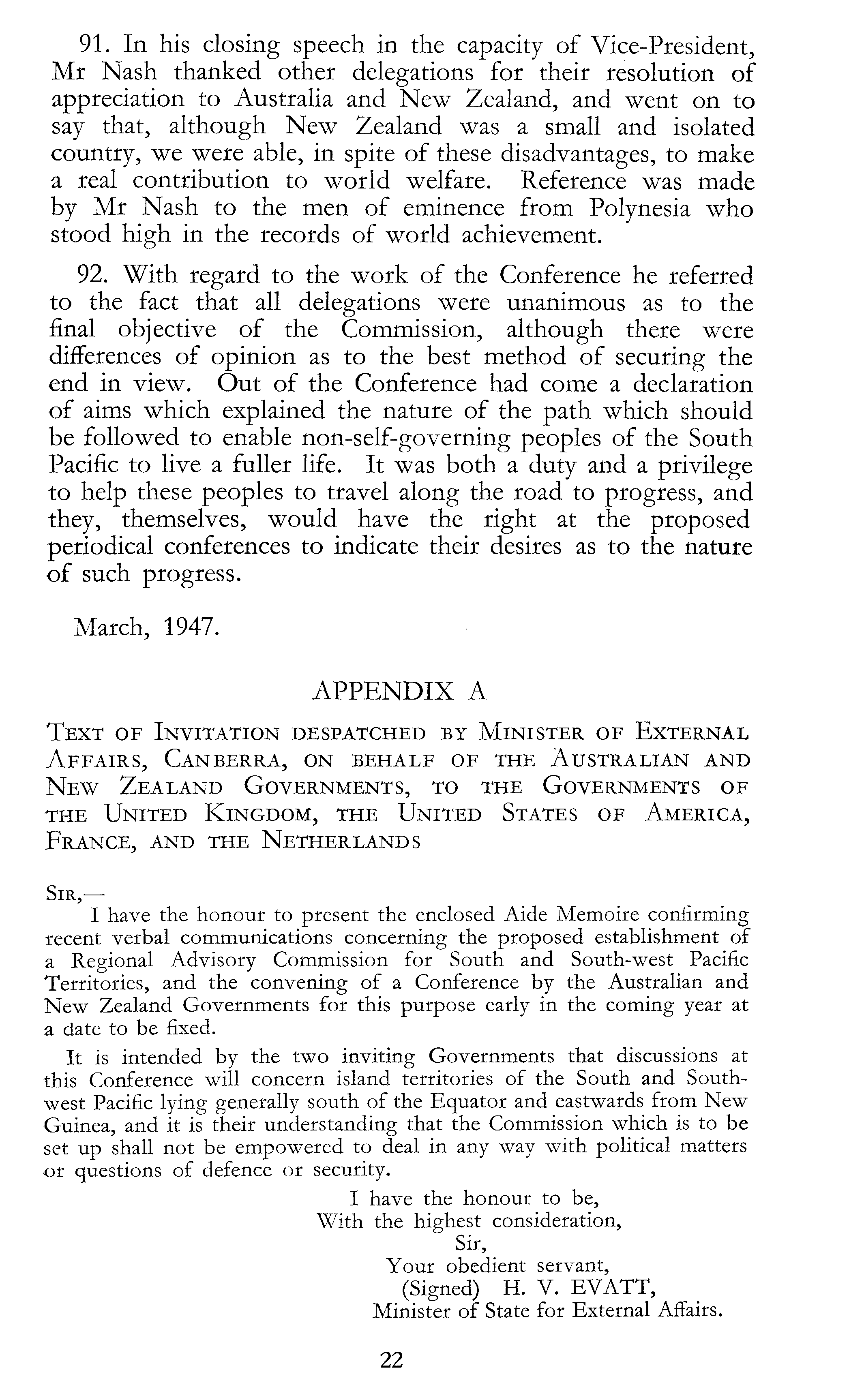 91. In his closing speech in the capacity of Vice-President, Mr Nash thanked other delegations for their resolution of appreciation to Australia and New Zealand, and went on to say that, although New Zealand was a small and isolated country, we were able, in spite of these disadvantages, to make a real contribution to world welfare. Reference was made by Mr Nash to the men of eminence from Polynesia who stood high in the records of world achievement. 92. With regard to the work of the Conference he referred to the fact that all delegations were unanimous as to the final objective of the Commission, although there were differences of opinion as to the best method of securing the end in view. Out of the Conference had come a declaration of aims which explained the nature of the path which should be followed to enable non-self-governing peoples of the South Pacific to live a fuller life. It was both a duty and a privilege to help these peoples to travel along the road to progress, and they, themselves, would have the right at the proposed periodical conferences to indicate their desires as to the nature of such progress. March, 1947. APPENDIX A Text of Invitation despatched by Minister of External Affairs, Canberra, on behalf of the Australian and New Zealand Governments, to the Governments of the United Kingdom, the United States of America, France, and the Netherlands Sir, — I have the honour to present the enclosed Aide Memoire confirming recent verbal communications concerning the proposed establishment of a Regional Advisory Commission for South and South-west Pacific Territories, and the convening of a Conference by the Australian and New Zealand Governments for this purpose early in the coming year at a date to be fixed. It is intended by the two inviting Governments that discussions at this Conference will concern island territories of the South and Southwest Pacific lying generally south of the Equator and eastwards from New Guinea, and it is their understanding that the Commission which is to be set up shall not be empowered to deal in any way with political matters or questions of defence or security. I have the honour to be, With the highest consideration, Sir, Your obedient servant, (Signed) H. V. EVATT, Minister of State for External Affairs.