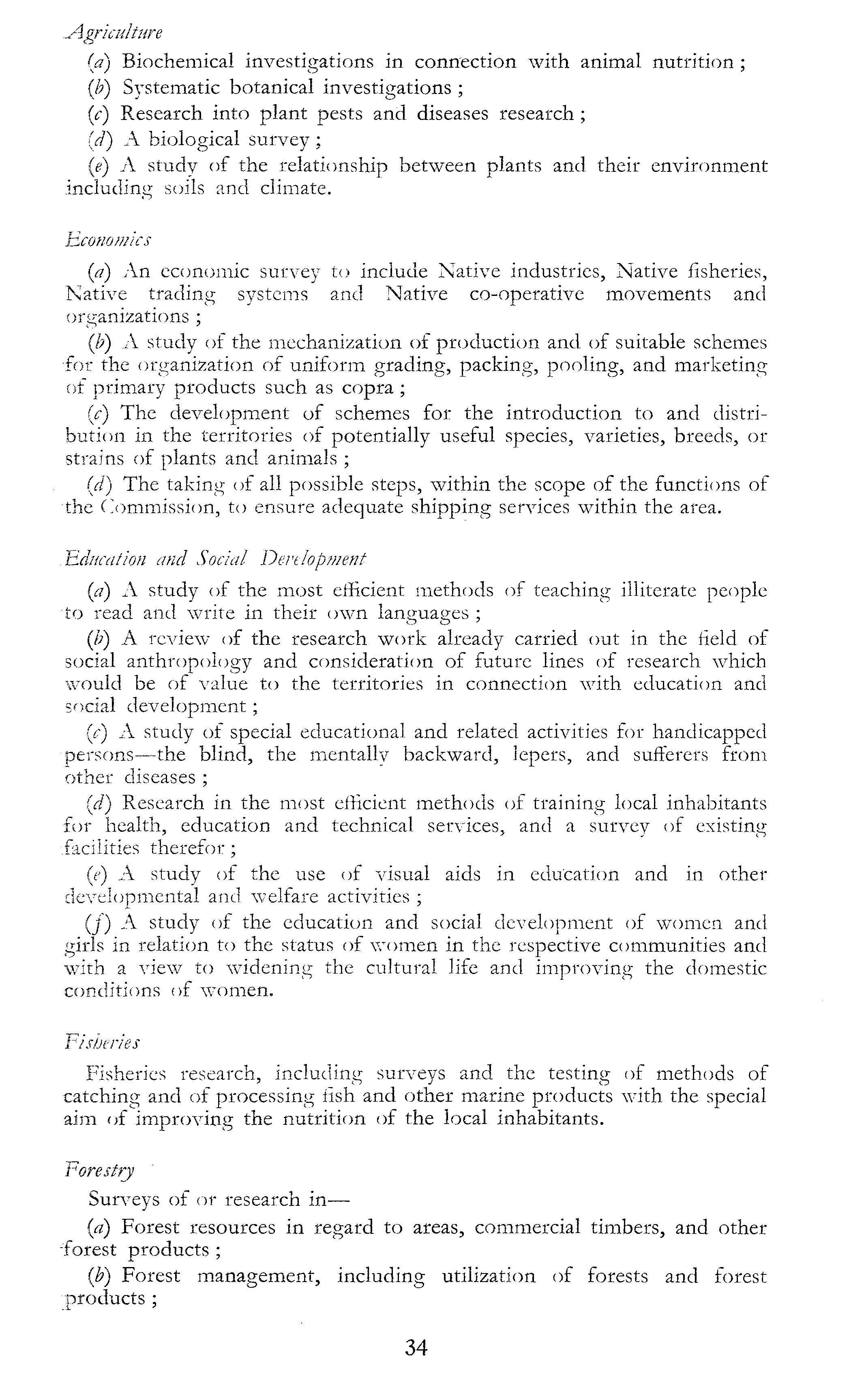 Agriculture (a) Biochemical investigations in connection with animal nutrition ; (b) Systematic botanical investigations ; (c) Research into plant pests and diseases research; (d) A biological survey ; (e) A study of the relationship between plants and their environment including soils and climate. Economics (a) An economic survey to include Native industries, Native fisheries, Native trading systems and Native co-operative movements and organizations ; (b) A study of the mechanization of production and of suitable schemes for the organization of uniform grading, packing, pooling, and marketing of primary products such as copra ; (c) The development of schemes for the introduction to and distribution in the territories of potentially useful species, varieties, breeds, or strains of plants and animals; (d) The taking of all possible steps, within the scope of the functions of the Commission, to ensure adequate shipping services within the area. Education and Social Development (a) A study of the most efficient methods of teaching illiterate people to read and write in their own languages ; (b) A review of the research work already carried out in the field of social anthropology and consideration of future lines of research which would be of value to the territories in connection with education and social development; (c) A study of special educational and related activities for handicapped persons —the blind, the mentally backward, lepers, and sufferers from other diseases ; (d) Research in the most efficient methods of training local inhabitants for health, education and technical services, and a survey of existing facilities therefor; (e) A study of the use of visual aids in education and in other developmental and welfare activities ; (/) A study of the education and social development of women and girls in relation to the status of women in the respective communities and with a view to widening the cultural life and improving the domestic conditions of women. Fisheries Fisheries research, inclyding surveys and the testing of methods of catching and of processing fish and other marine products with the special aim of improving the nutrition of the local inhabitants. Forestry Surveys of or research in—(a) Forest resources in regard to areas, commercial timbers, and other 'forest products ; (J?) Forest management, including utilization of forests and forest products ;