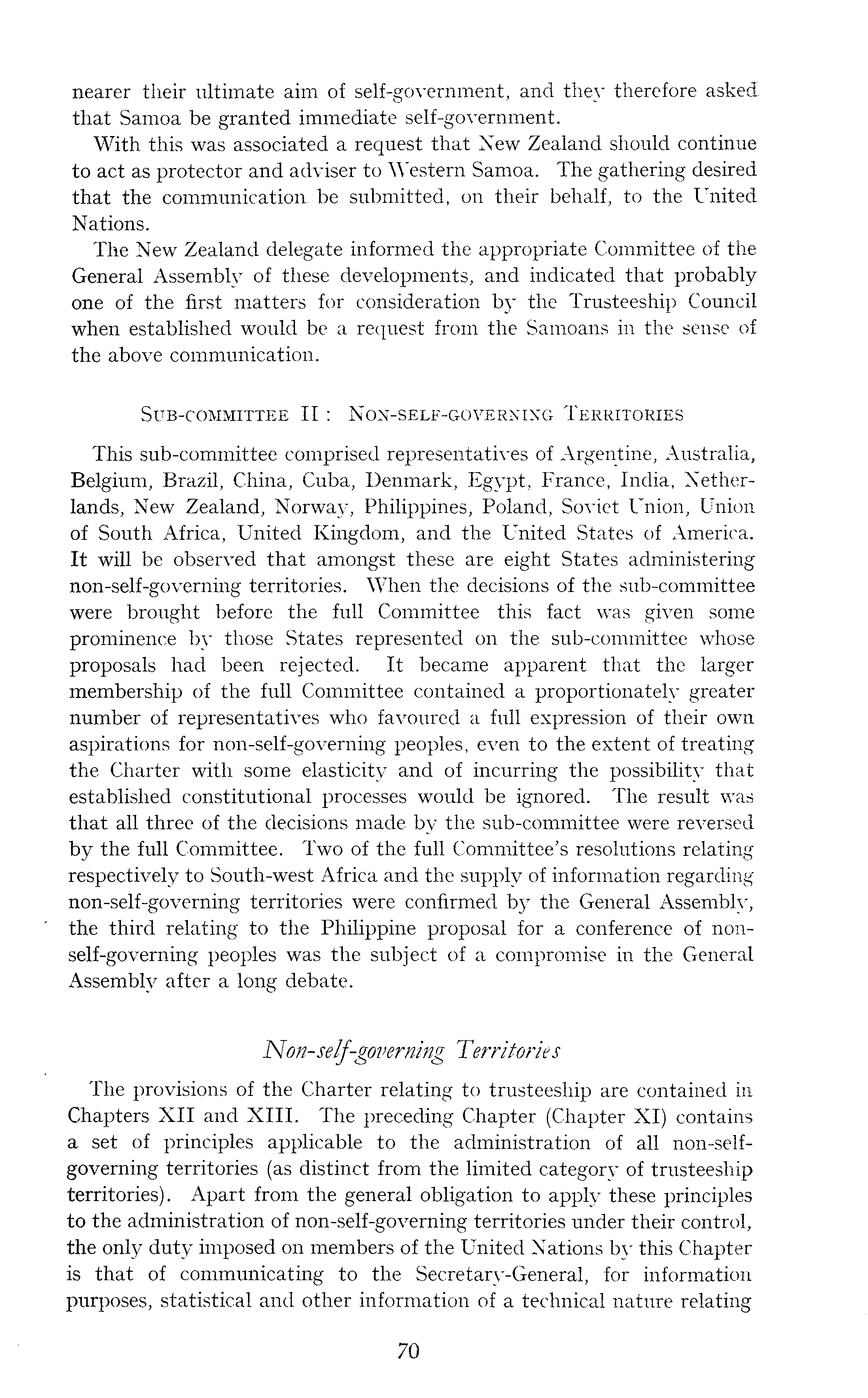 nearer their ultimate aim of self-government, and they therefore asked that Samoa be granted immediate self-government. With this was associated a request that New Zealand should continue to act as protector and adviser to Western Samoa. The gathering desired that the communication, be submitted, on their behalf, to the United Nations. The New Zealand delegate informed the appropriate Committee of the General Assembly of these developments, and indicated that probably one of the first matters for consideration by the Trusteeship Council when established would be a request from the Samoans in the sense of the above communication. Sub-committee II: Non-self-governing Territories This sub-committee comprised representatives of Argentine, Australia, Belgium, Brazil, China, Cuba, Denmark, Egypt, France, India, Netherlands, New Zealand, Norway, Philippines, Poland, Soviet Union, Union of South' Africa, United Kingdom, and the United States of America. It will be observed that amongst these are eight States administering non-self-governing territories. When the decisions of the sub-committee were brought before the full Committee this fact was given some prominence by those States represented on the sub-committee whose proposals had been rejected. It became apparent that the larger membership of the full Committee contained a proportionately greater number of representatives who favoured a full expression of their own aspirations for non-self-governing peoples, even to the extent of treating the Charter with some elasticity and of incurring the possibility that established constitutional processes would be ignored. The result was that all three of the decisions made by the sub-committee were reversed by the full Committee. Two of the full Committee's resolutions relating respectively to South-west Africa and the supply of information regarding non-self-governing territories were confirmed by the General Assembly, the third relating to the Philippine proposal for a conference of non-self-governing peoples was the subject of a compromise in the General Assembly after a long debate. Non-self-governing Territories The provisions of the Charter relating to trusteeship are contained in Chapters XII and XIII. The preceding Chapter (Chapter XI) contains a set of principles applicable to the administration of all non-self-governing territories (as distinct from the limited category of trusteeship territories). Apart from the general obligation to apply these principles to the administration of non-self-governing territories under their control, the only duty imposed on members of the United Nations by this Chapter is that of communicating to the Secretary-General, for information purposes, statistical and other information of a technical nature relating