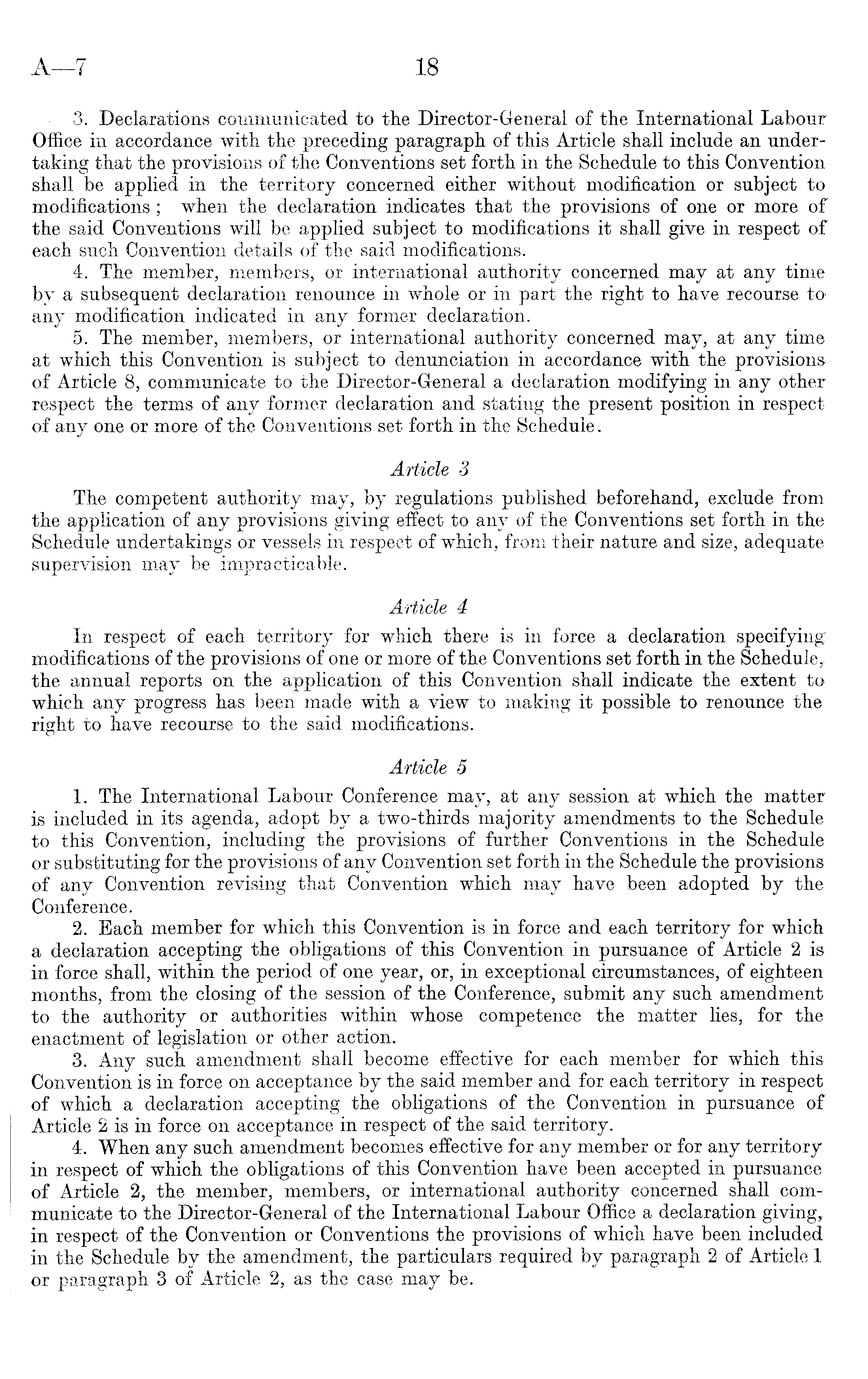 3. Declarations communicated to the Director-General of the International Labour Office in accordance with the preceding paragraph of this Article shall include an undertaking that the provisions of the Conventions set forth in the Schedule to this Convention shall be applied in the territory concerned either without modification or subject to modifications; when the declaration indicates that the provisions of one or more of the said Conventions will be applied subject to modifications it shall give in respect of each such Convention details of the said modifications. 4. The member, members, or international authority concerned may at any time by a subsequent declaration renounce in whole or in part the right to have recourse to' any modification indicated in any former declaration. 5. The member, members, or international authority concerned may, at any time at which this Convention is subject to denunciation in accordance with the provisions of Article 8, communicate to the Director-General a declaration modifying in any other respect the terms of any former declaration and stating the present position in respect of any one or more of the Conventions set forth in the Schedule. Article 3 The competent authority may, by regulations published beforehand, exclude from the application of any provisions giving effect to any of the Conventions set forth in the Schedule undertakings or vessels in respect of which, from their nature and size, adequate supervision may be impracticable. Article 4 In respect of each territory for which there is in force a declaration specifying modifications of the provisions of one or more of the Conventions set forth in the Schedule, the annual reports on the application of this Convention shall indicate the extent to which any progress has been made with a view to making it possible to renounce the right to have recourse to the said modifications. Article 5 1. The International Labour Conference may, at any session at which the matter is included in its agenda, adopt by a two-thirds majority amendments to the Schedule to this Convention, including the provisions of further Conventions in the Schedule or substituting for the provisions of any Convention set forth in the Schedule the provisions of any Convention revising that Convention which may have been adopted by the Conference. 2. Each member for which this Convention is in force and each territory for which a declaration accepting the obligations of this Convention in pursuance of Article 2 is in force shall, within the period of one year, or, in exceptional circumstances, of eighteen months, from the closing of the session of the Conference, submit any such amendment to the authority or authorities within whose competence the matter lies, for the enactment of legislation or other action. 3. Any such amendment shall become effective for each member for which this Convention is in force on acceptance by the said member and for each territory in respect of which a declaration accepting the obligations of the Convention in pursuance of Article 2 is in force on acceptance in respect of the said territory. 4. When any such amendment becomes effective for any member or for any territory in respect of which the obligations of this Convention have been accepted in pursuance of Article 2, the member, members, or international authority concerned shall communicate to the Director-General of the International Labour Office a declaration giving, in respect of the Convention or Conventions the provisions of which have been included in the Schedule by the amendment, the particulars required by paragraph 2 of Article 1 or paragraph 3 of Article 2, as the case may be.