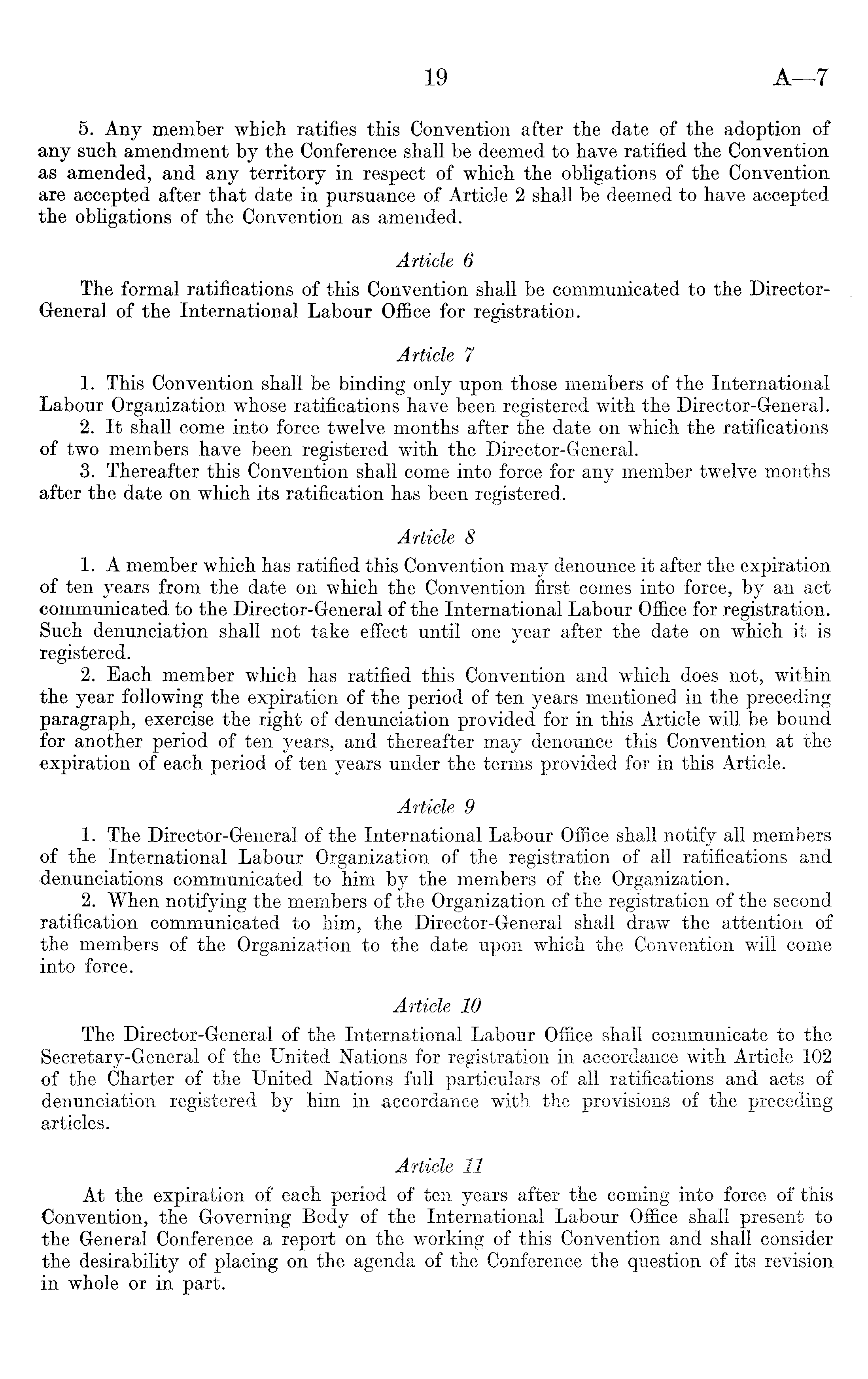 5. Any member which ratifies this Convention after the date of the adoption of any such amendment by the Conference shall be deemed to have ratified the Convention as amended, and any territory in respect of which the obligations of the Convention are accepted after that date in pursuance of Article 2 shall be deemed to have accepted the obligations of the Convention as amended. Article 6 The formal ratifications of this Convention shall be communicated to the DirectorGeneral of the International Labour Office for registration. Article 7 1. This Convention shall be binding only upon those members of the International Labour Organization whose ratifications have been registered with the Director-General. 2. It shall come into force twelve months after the date on which the ratifications of two members have been registered with the Director-General. 3. Thereafter this Convention shall come into force for any member twelve months after the date on which its ratification has been registered. Article 8 1. A member which has ratified this Convention may denounce it after the expiration of ten years from the date on which the Convention first comes into force, by an act communicated to the Director-General of the International Labour Office for registration. Such denunciation shall not take effect until one year after the date on which it is registered. 2. Each member which has ratified this Convention and which does not, within the year following the expiration of the period of ten years mentioned in the preceding paragraph, exercise the right of denunciation provided for in this Article will be bound for another period of ten years, and thereafter may denounce this Convention at the expiration of each period of ten years under the terms provided for in this Article. Article 9 1. The Director-General of the International Labour Office shall notify all members of the International Labour Organization of the registration of all ratifications and denunciations communicated to him by the members of the Organization. 2. When notifying the members of the Organization of the registration of the second ratification communicated to him, the Director-General shall draw the attention of the members of the Organization to the date upon which the Convention will come into force. Article 10 The Director-General of the International Labour Office shall communicate to the Secretary-General of the United Nations for registration in accordance with Article 102 of the Charter of the United Nations full particulars of all ratifications and acts of denunciation registered by him in accordance with the provisions of the preceding articles. Article 11 At the expiration of each period of ten years after the coming into force of this Convention, the Governing Body of the International Labour Office shall present to the General Conference a report on the working of this Convention and shall consider the desirability of placing on the agenda of the Conference the question of its revision in whole or in part.