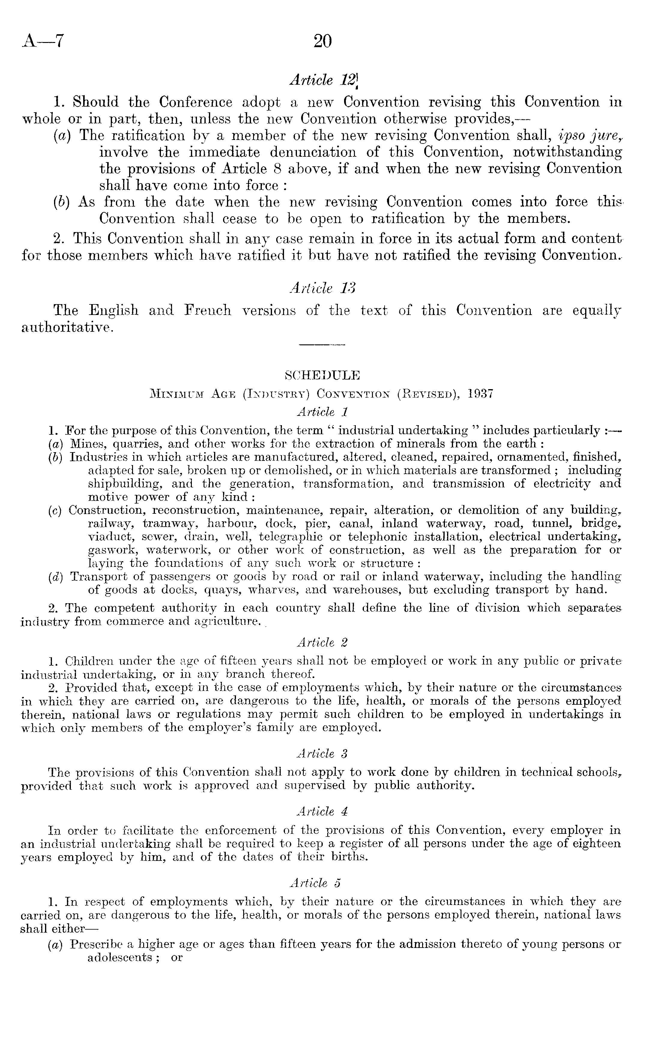 Article 12\ 1. Should the Conference adopt a new Convention revising this Convention in whole or in part, then, unless the new Convention otherwise provides,— (a) The ratification by a member of the new revising Convention shall, ipsojjurye y involve the immediate denunciation of this Convention, notwithstanding the provisions of Article 8 above, if and when the new revising Convention shall have come into force : (b) As from the date when the new revising Convention comes into force this. Convention shall cease to be open to ratification by the members. 2. This Convention shall in any case remain in force in its actual form and content for those members which have ratified it but have not ratified the revising Convention.. Article 13 The English and French versions of the text of this Convention are equally authoritative. SCHEDULE Minimum Age (Industry) Convention (Revised), 1937 Article 1 1. For the purpose of this Convention, the term " industrial undertaking " includes particularly : (a) Mines, quarries, and other works for the extraction of minerals from the earth : (b) Industries in which articles are manufactured, altered, cleaned, repaired, ornamented, finished, adapted for sale, broken up or demolished, or in which materials are transformed ; including shipbuilding, and the generation, transformation, and transmission of electricity and motive power of anj>- kind : (c) Construction, reconstruction, maintenance, repair, alteration, or demolition of any building, railway, tramway, harbour, dock, pier, canal, inland waterway, road, tunnel, bridge, viaduct, sewer, drain, well, telegraphic or telephonic installation, electrical undertaking, gaswork, waterwork, or other work of construction, as well as the preparation for or laying the foundations of any such work or structure : (d) Transport of passengers or goods by road or rail or inland waterway, including the handling of goods at docks, quays, wharves, and warehouses, but excluding transport by hand. 2. The competent authority in each country shall define the fine of division which separates industry from commerce and agriculture.. Article 2 1. Children under the age of fifteen years shall not be employed or work in any public or private industrial undertaking, or in any branch thereof. 2. Provided that, except in the case of employments which, by their nature or the circumstances in which they are carried on, are dangerous to the life, health, or morals of the persons employed therein, national laws or regulations may permit such children to be employed in undertakings in which only members of the employer's family are employed. Article 3 The provisions of this Convention shall not apply to work done by children in technical schools, provided that such work is approved and supervised by public authority. Article 4 In order to facilitate the enforcement of the provisions of this Convention, every employer in an industrial undertaking shall be required to keep a register of all persons under the age of eighteen years employed by him, and of the dates of their births. Article 5 1. In respect of employments which, by their nature or the circumstances in which they are carried on, are dangerous to the life, health, or morals of the persons employed therein, national laws shall either —- (a) Prescribe a higher age or ages than fifteen years for the admission thereto of young persons or adolescents ; or
