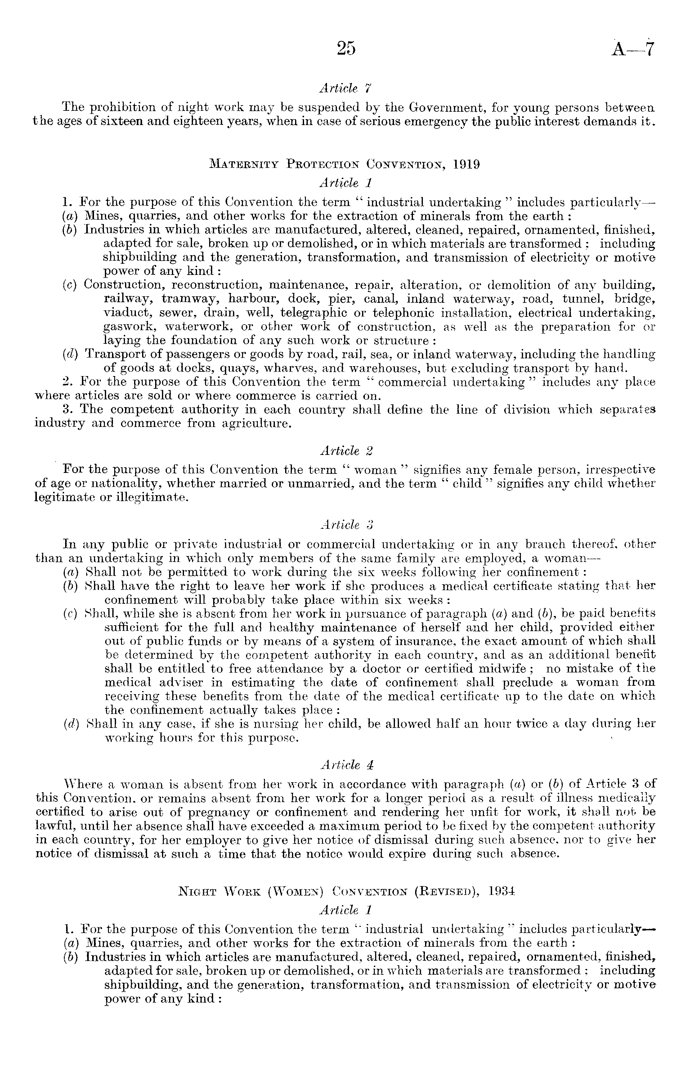 Article 7 The prohibition of night work may be suspended by the Government, for young persons between the ages of sixteen and eighteen years, when in case of serious emergency the public interest demands it. Maternity Protection Convention, 1919 Article 1 1. For the purpose of this Convention the term " industrial undertaking " includes particularly—(a) Mines, quarries, and other works for the extraction of minerals from the earth : (b) Industries in which articles are manufactured, altered, cleaned, repaired, ornamented, finished, adapted for sale, broken up or demolished, or in which materials are transformed ; including shipbuilding and the generation, transformation, and transmission of electricity or motive power of any kind : (c) Construction, reconstruction, maintenance, repair, alteration, or demolition of any building, railway, tramway, harbour, dock, pier, canal, inland waterway, road, tunnel, bridge, viaduct, sewer, drain, well, telegraphic or telephonic installation, electrical undertaking, gaswork, waterwork, or other work of construction, as well as the preparation for or laying the foundation of any such work or structure : (d) Transport of passengers or goods by road, rail, sea, or inland waterway, including the handling of goods at docks, quays, wharves, and warehouses, but excluding transport by hand. 2. For the purpose of this Convention the term " commercial undertaking " includes any place where articles are sold or where commerce is carried on. 3. The competent authority in each country shall define the line of division which separates industry and commerce from agriculture. Article 2 For the purpose of this Convention the term " woman " signifies any female person, irrespective of age or nationality, whether married or unmarried, and the term " child " signifies any child whether legitimate or illegitimate. Article 3 In any public or private industrial or commercial undertaking or in any branch thereof, other than an undertaking in which only members of the same family are employed, a woman — (a) Shall not be permitted to work during the six weeks following her confinement: (b) Shall have the right to leave her work if she produces a medical certificate stating that her confinement will probably take place within six weeks: (c) Shall, while she is absent from her work in pursuance of paragraph (a) and (6), be paid benefits sufficient for the full and healthy maintenance of herself and her child, provided either out of public funds or by means of a system of insurance, the exact amount of which shall be determined by the competent authority in each country, and as an additional benefit shall be entitled to free attendance by a doctor or certified midwife; no mistake of the medical adviser in estimating the date of confinement shall preclude a woman .from receiving these benefits from the date of the medical certificate up to the date on which the confinement actually takes place : (d) Shall in any case, if she is nursing her child, be allowed half an hour twice a day during her working hours for this purpose. Article 4 Where a woman is absent from her work in accordance with paragraph (a) or (b) of Article 3 of this Convention, or remains absent from her work for a longer period as a result of illness medically certified to arise out of pregnancy or confinement and rendering her unfit for work, it shall not be lawful, until her absence shall have exceeded a maximum period to be fixed by the competent authority in each country, for her employer to give her notice of dismissal during such absence, nor to give her notice of dismissal at such a time that the notice would expire during such absence. Night Work (Women) Convention (Revised), 1934 Article 1 I. For the purpose of this Convention the term " industrial undertaking " includes particularly—(a) Mines, quarries, and other works for the extraction of minerals from the earth : (b) Industries in which articles are manufactured, altered, cleaned, repaired, ornamented, finished, adapted for sale, broken up or demolished, or in which materials are transformed ; including shipbuilding, and the generation, transformation, and transmission of electricity or motive power of any kind :