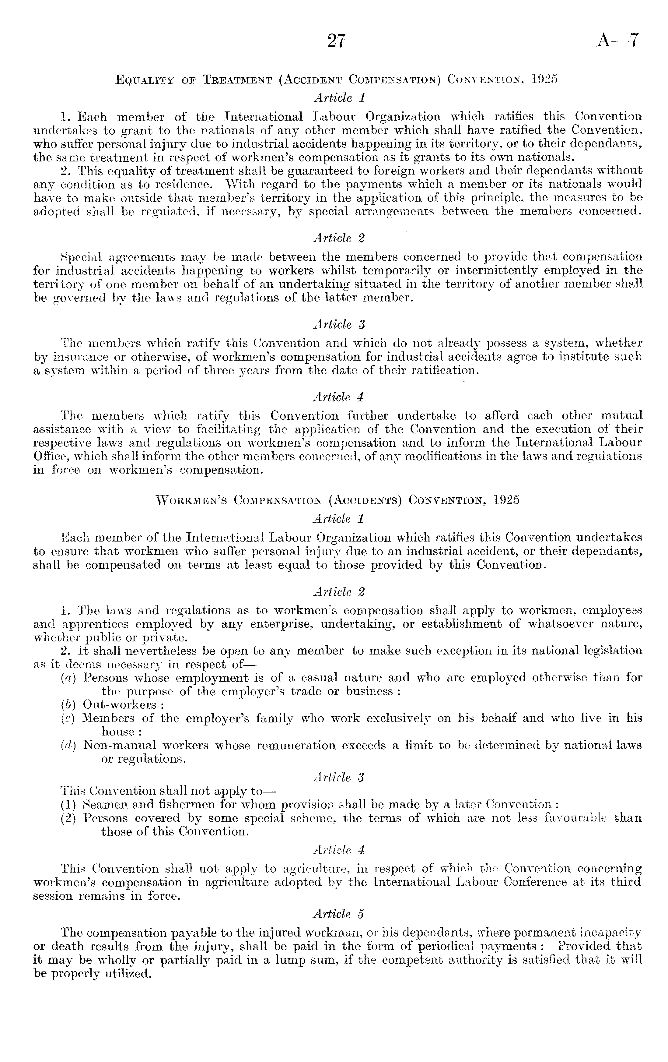 Eqtjality of Treatment (Accident Compensation) Convention, 1925 Article 1 1. Each member of the International Labour Organization which ratifies this Convention undertakes to grant to the nationals of any other member which shall have ratified the Convention, who suffer personal injury due to industrial accidents happening in its territory, or to their dependants, the same treatment in respect of workmen's compensation as it grants to its own nationals. 2. This equality of treatment shall be guaranteed to foreign workers and their dependants without any condition as to residence. With regard to the payments which a member or its nationals would have to make outside that member's territory in the application of this principle, the measures to be adopted shall be regulated, if necessary, by special arrangements between the members concerned. Article 2 Special agreements may be made between the members concerned to provide that compensation for industrial accidents happening to workers whilst temporarily or intermittently employed in the territory of one member on behalf of an undertaking situated in the territory of another member shall be governed by the laws and regulations of the latter member. Article 3 The members which ratify this Convention and which do not already possess a system, whether by insurance or otherwise, of workmen's compensation for industrial accidents agree to institute such a system within a period of three years from the date of their ratification. Article 4 The members which ratify this Convention further undertake to afford each other mutual assistance with a view to facilitating the application of the Convention and the execution of their respective laws and regulations on workmen's compensation and to inform the International Labour Office, which shall inform the other members concerned, of any modifications in the laws and regulations in force on workmen's compensation. Workmen's Compensation (Accidents) Convention, 1925 Article 1 Each member of the International Labour Organization which ratifies this Convention undertakes to ensure that workmen who suffer personal injury due to an industrial accident, or their dependants, shall be compensated on terms at least equal to those provided by this Convention. Article 2 1. The laws and regulations as to workmen's compensation shall apply to workmen, employees and apprentices employed by any enterprise, undertaking, or establishment of whatsoever nature, whether public or private. 2. It shall nevertheless be open to any member to make such exception in its national legislation as it deems necessary in respect of—(a) Persons whose employment is of a casual nature and who are employed otherwise than for the purpose of the employer's trade or business : (b) Out-workers : (c) Members of the employer's family who work exclusively on his behalf and who live in his house: (d) Non-manual workers whose remuneration exceeds a limit to be determined by national laws or regulations. Article 3 This Convention shall not apply to—(1) Seamen and fishermen for whom provision shall be made by a later Convention : (2) Persons covered by some special scheme, the terms of which are not less favourable than those of this Convention. Article 4 This Convention shall not apply to agriculture, in respect of which the Convention concerning workmen's compensation in agriculture adopted by the International Labour Conference at its third session remains in force. Article 5 The compensation payable to the injured workman, or his dependants, where permanent incapacity or death results from the injury, shall be paid in the form of periodical payments : Provided that it may be wholly or partially paid in a lump sum, if the competent authority is satisfied that it will be properly utilized.