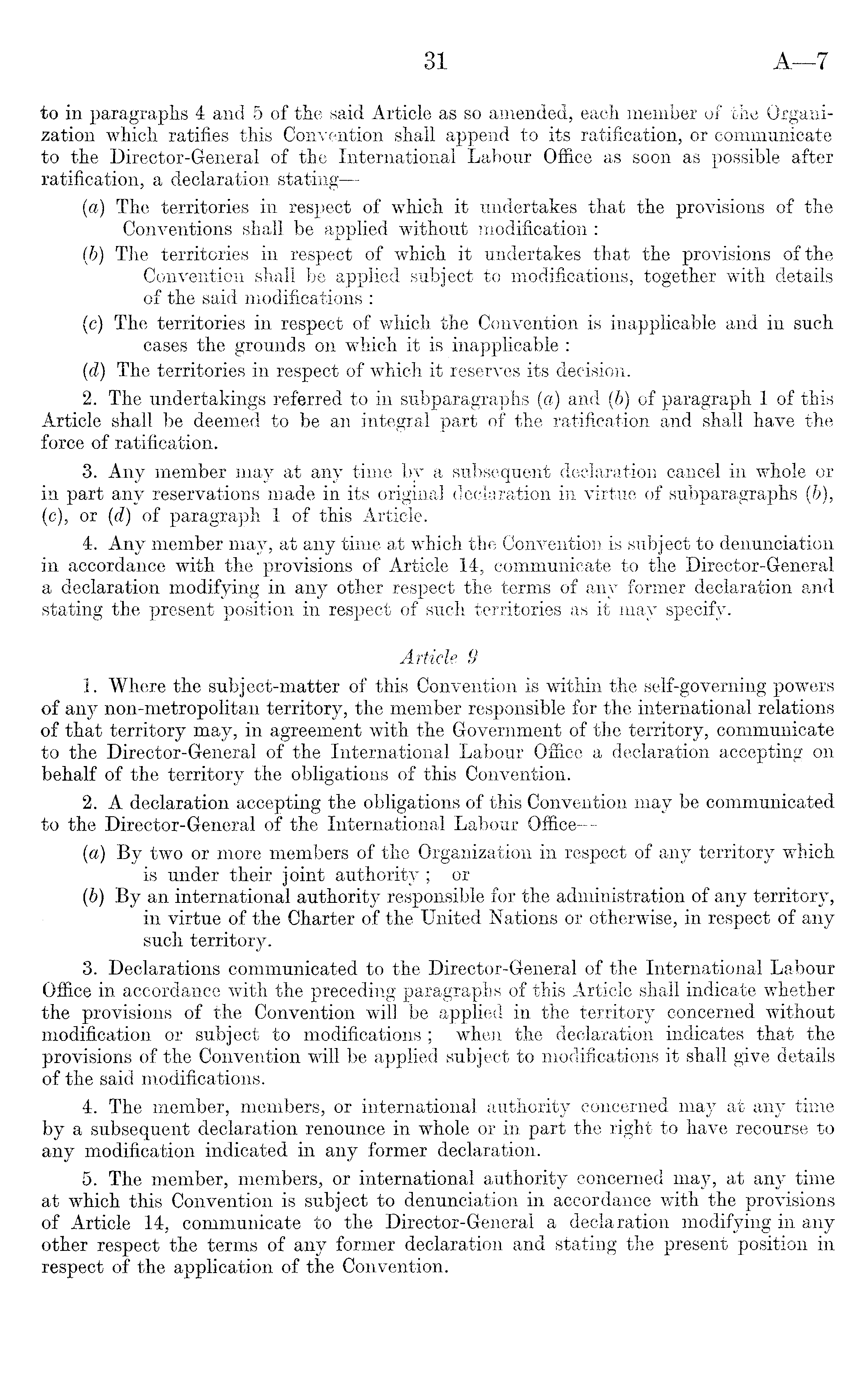 to in paragraphs 4 and 5 of the said Article as so amended, each member of the Organization which ratifies this Convention shall append to its ratification, or communicate to the Director-General of the International Labour Office as soon as possible after ratification, a declaration stating—(a) The territories in respect of which it undertakes that the provisions of the Conventions shall be applied without modification : (b) The territories in respect of which it undertakes that the provisions of the Convention shall be applied subject to modifications, together with details of the said modifications : (c) The territories in respect of which the Convention is inapplicable and in such cases the grounds on which it is inapplicable : (d) The territories in respect of which it reserves its decision. 2. The undertakings referred to in subparagraphs (a) and (b) of paragraph lof this Article shall be deemed to be an integral part of the ratification and shall have the force of ratification. 3. Any member may at any time by a subsequent declaration cancel in whole or in part any reservations made in its original declaration in virtue of subparagraphs (b), (c), or (d) of paragraph lof this Article. 4. Any member may, at any time at which the Convention is subject to denunciation in accordance with the provisions of Article 14, communicate to the Director-General a declaration modifying in any other respect the terms of any former declaration and stating the present position in respect of such territories as it may specify. Article 9 1. Where the subject-matter of this Convention is within the self-governing powers of any non-metropolitan territory, the member responsible for the international relations of that territory may, in agreement with the Government of the territory, communicate to the Director-General of the International Labour Office a declaration accepting on behalf of the territory the obligations of this Convention. 2. A declaration accepting the obligations of this Convention may be communicated to the Director-General of the International Labour Office — (a) By two or more members of the Organization in respect of any territory which is under their joint authority ; or (b) By an international authority responsible for the administration of any territory, in virtue of the Charter of the United Nations or otherwise, in respect of any such territory. 3. Declarations communicated to the Director-General of the International Labour Office in accordance with the preceding paragraphs of this Article shall indicate whether the provisions of the Convention will be applied in the territory concerned without modification or subject to modifications ; when the declaration indicates that the provisions of the Convention will be applied subject to modifications it shall give details of the said modifications. 4. The member, members, or international authority concerned may at any time by a subsequent declaration renounce in whole or in part the right to have recourse to any modification indicated in any former declaration. 5. The member, members, or international authority concerned may, at any time at which this Convention is subject to denunciation in accordance with the provisions of Article 14, communicate to the Director-General a declaration modifying in any other respect the terms of any former declaration and stating the present position in respect of the application of the Convention.