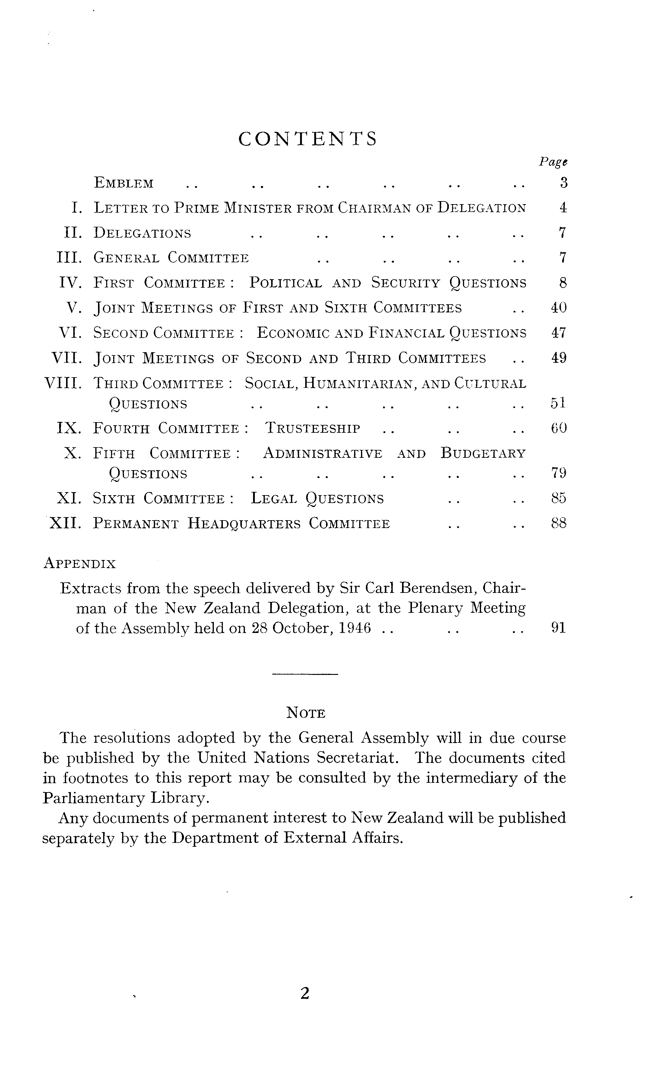 CONTENTS Page Emblem .. .. .. .. .. .. 3 I. Letter to Prime Minister from Chairman of Delegation 4 11. Delegations .. .. .. .. .. 7 111. General Committee .. .. .. .. 7 IV. First Committee : Political and Security Questions 8 V. Joint Meetings of First and Sixth Committees .. 40 VI. Second Committee : Economic and Financial Questions 47 VII. Joint Meetings of Second and Third Committees .. 49 VIII. Third Committee : Social, Humanitarian, and Cultural Questions .. .. .. .. 51 IX. Fourth Committee : Trusteeship .. .. .. 60 X. Fifth Committee : Administrative and Budgetary Questions .. .. .. .. 79 XI. Sixth Committee : Legal Questions .. .. 85 XII. Permanent Headquarters Committee .. .. 88 Appendix Extracts from the speech delivered by Sir Carl Berendsen, Chairman of the New Zealand Delegation, at the Plenary Meeting of the Assembly held on 28 October, 1946 .. .. .. 91