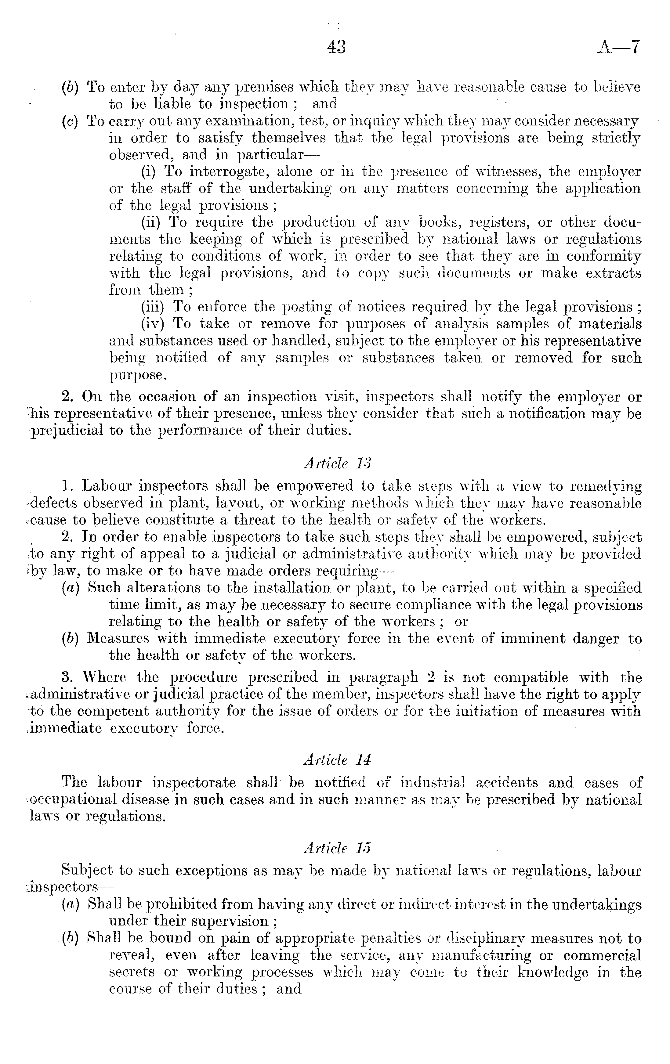 (b) To enter by day any premises which they may have reasonable cause to believe to be liable to inspection; and (c) To carry out any examination, test, or inquiry which they may consider necessary in order to satisfy themselves that the legal provisions are being strictly observed, and in particular — (i) To interrogate, alone or in the presence of witnesses, the employer or the staff of the undertaking on any matters concerning the application of the legal provisions ; (ii) To require the production of any books, registers, or other documents the keeping of which is prescribed by national laws or regulations relating to conditions of work, in order to see that they are in conformity with the legal provisions, and to copy such documents or make extracts from them; (iii) To enforce the posting of notices required by the legal provisions ; (iv) To take or remove for purposes of analysis samples of materials and substances used or handled, subject to the employer or his representative being notified of any samples or substances taken or removed for such purpose. 2. On the occasion of an inspection visit, inspectors shall notify the employer or his representative of their presence, unless they consider that such a notification may be prejudicial to the performance of their duties. Article 13 1. Labour inspectors shall be empowered to take steps with a view to remedying •defects observed in plant, layout, or working methods which they may have reasonable ♦cause to believe constitute a threat to the health or safety of the workers. 2. In order to enable inspectors to take such steps they shall be empowered, subject to any right of appeal to a judicial or administrative authority which may be provided (by law, to make or to have made orders requiring—(a) Such alterations to the installation or plant, to be carried out within a specified time limit, as may be necessary to secure compliance with the legal provisions relating to the health or safety of the workers ; or (b) Measures with immediate executory force in the event of imminent danger to the health or safety of the workers. 3. Where the procedure prescribed in paragraph 2 is not compatible with the .administrative or judicial practice of the member, inspectors shall have the right to apply -to the competent authority for the issue of orders or for the initiation of measures with ■immediate executory force. Article 14 The labour inspectorate shall be notified of industrial accidents and cases of .occupational disease in such cases and in such manner as may be prescribed by national laws or regulations. Article 15 Subject to such exceptions as may be made by national laws or regulations, labour .inspectors — (a) Shall be prohibited from having any direct or indirect interest in the undertakings under their supervision; (b) Shall be bound on pain of appropriate penalties or disciplinary measures not to reveal, even after leaving the service, any manufacturing or commercial secrets or working processes which may come to their knowledge in the course of their duties ; and
