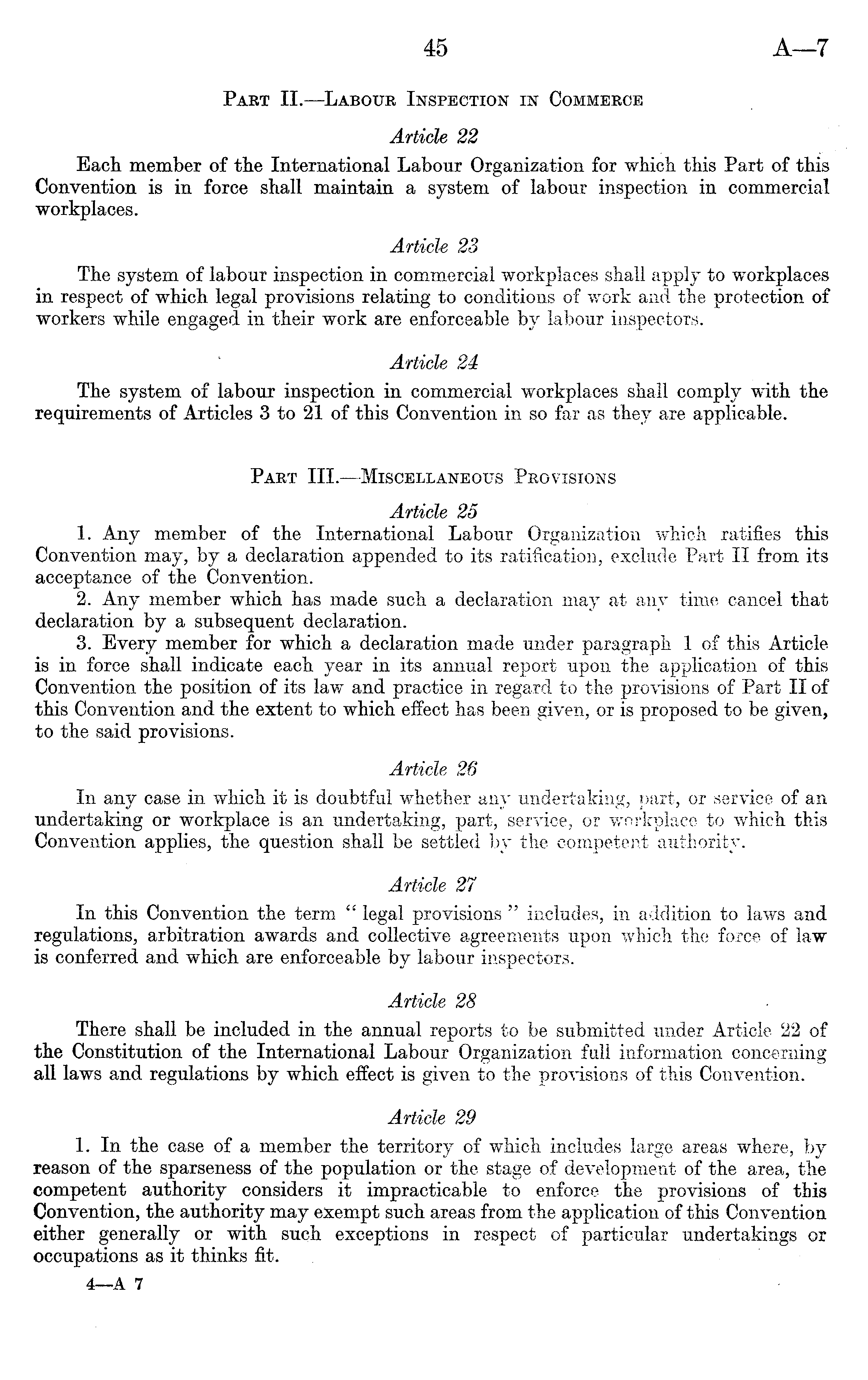 Part ll.—Labour Inspection in Commerce Article 22 Each member of the International Labour Organization for which this Part of this Convention is in force shall maintain a system of labour inspection in commercial workplaces. Article 23 « The system of labour inspection in commercial workplaces shall apply to workplaces in respect of which legal provisions relating to conditions of work and the protection of workers while engaged in their work are enforceable by labour inspectors. Article 24 The system of labour inspection in commercial workplaces shall comply with the requirements of Articles 3 to 21 of this Convention in so far as they are applicable. Part 111. —Miscellaneous Provisions Article 25 1. Any member of the International Labour Organization which ratifies this Convention may, by a declaration appended to its ratification, exclude Part II from its acceptance of the Convention. 2. Any member which has made such a declaration may at any time cancel that declaration by a subsequent declaration. 3. Every member for which a declaration made under paragraph 1 of this Article is in force shall indicate each year in its annual report upon the application of this Convention the position of its law and practice in regard to the provisions of Part II of this Convention and the extent to which effect has been given, or is proposed to be given, to the said provisions. Article 26 In any case in which it is doubtful whether any undertaking, part, or service of an undertaking or workplace is an undertaking, part, service, or workplace to which this Convention applies, the question shall be settled by the competent authority. Article 27 In this Convention the term " legal provisions " includes, in addition to laws and regulations, arbitration awards and collective agreements upon which the force of law is conferred and which are enforceable by labour inspectors. Article 28 There shall be included in the annual reports to be submitted under Article 22 of the Constitution of the International Labour Organization full information concerning all laws and regulations by which effect is given to the provisions of this Convention. Article 29 1. In the case of a member the territory of which includes large areas where, by reason of the sparseness of the population or the stage of development of the area, the competent authority considers it impracticable to enforce the provisions of this Convention, the authority may exempt such areas from the application of this Convention either generally or with such exceptions in respect of particular undertakings or occupations as it thinks fit.