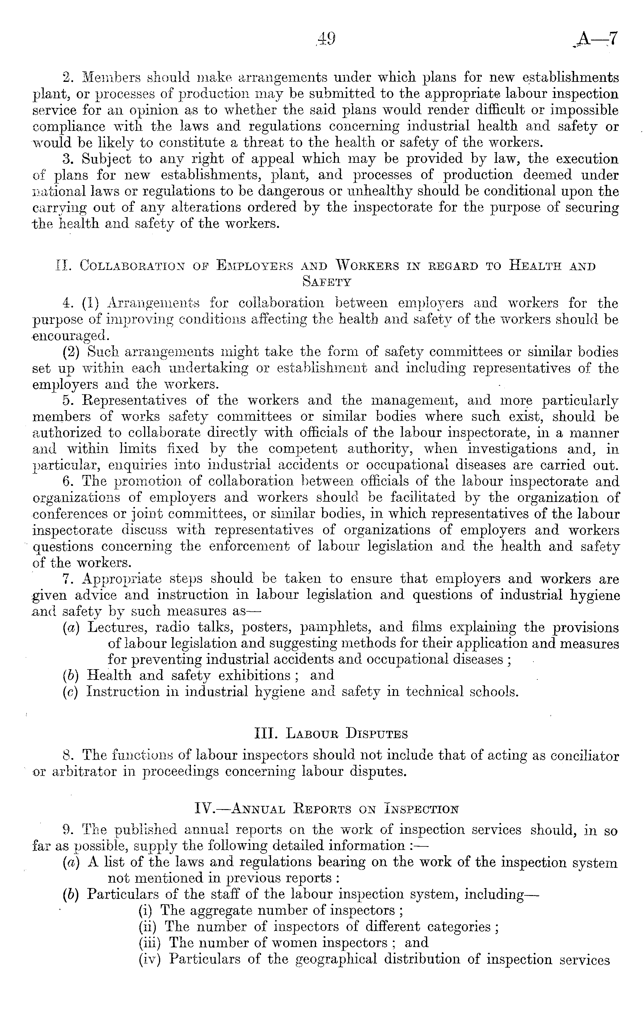 2. Members should make arrangements under which, plans for new establishments plant, or processes of production may be submitted to the appropriate labour inspection service for an opinion as to whether the said plans would render difficult or impossible compliance with the laws and regulations concerning industrial health and safety or would be likely to constitute a threat to the health or safety of the workers. 3. Subject to any right of appeal which may be provided by law, the execution of plans for new establishments, plant, and processes of production deemed under national laws or regulations to be dangerous or unhealthy should be conditional upon the carrying out of any alterations ordered by the inspectorate for the purpose of securing the health and safety of the workers. 11. Collaboration of Employers and Workers in regard to Health and Safety 4. (1) Arrangements for collaboration between employers and workers for the purpose of improving conditions affecting the health and safety of the workers should be •encouraged. (2) Such arrangements might take the form of safety committees or similar bodies set up within each undertaking or establishment and including representatives of the employers and the workers. 5. Representatives of the workers and the management, and more particularly members of works safety committees or similar bodies where such exist, should be authorized to collaborate directly with officials of the labour inspectorate, in a manner and within limits fixed by the competent authority, when investigations and, in particular, enquiries into industrial accidents or occupational diseases are carried out. 6. The promotion of collaboration between officials of the labour inspectorate and organizations of employers and workers should be facilitated by the organization of conferences or joint committees, or similar bodies, in which representatives of the labour inspectorate discuss with representatives of organizations of employers and workers questions concerning the enforcement of labour legislation and the health and safety of the workers. 7. Appropriate steps should be taken to ensure that employers and workers are given advice and instruction in labour legislation and questions of industrial hygiene and safety by such measures as — (a) Lectures, radio talks, posters, pamphlets, and films explaining the provisions of labour legislation and suggesting methods for their application and measures for preventing industrial accidents and occupational diseases; (b) Health and safety exhibitions ; and (c) Instruction in industrial hygiene and safety in technical schools. 111. Labour Disputes 8. The functions of labour inspectors should not include that of acting as conciliator or arbitrator in proceedings concerning labour disputes. IV.—Annual Reports on Inspection 9. The published annual reports on the work of inspection services should, in so far as possible, supply the following detailed information : (а) A list of the laws and regulations bearing on the work of the inspection system not mentioned in previous reports : (б) Particulars of the staff of the labour inspection system, including—(i) The aggregate number of inspectors ; (ii) The number of inspectors of different categories; (iii) The number of women inspectors ; and (iv) Particulars of the geographical distribution of inspection services