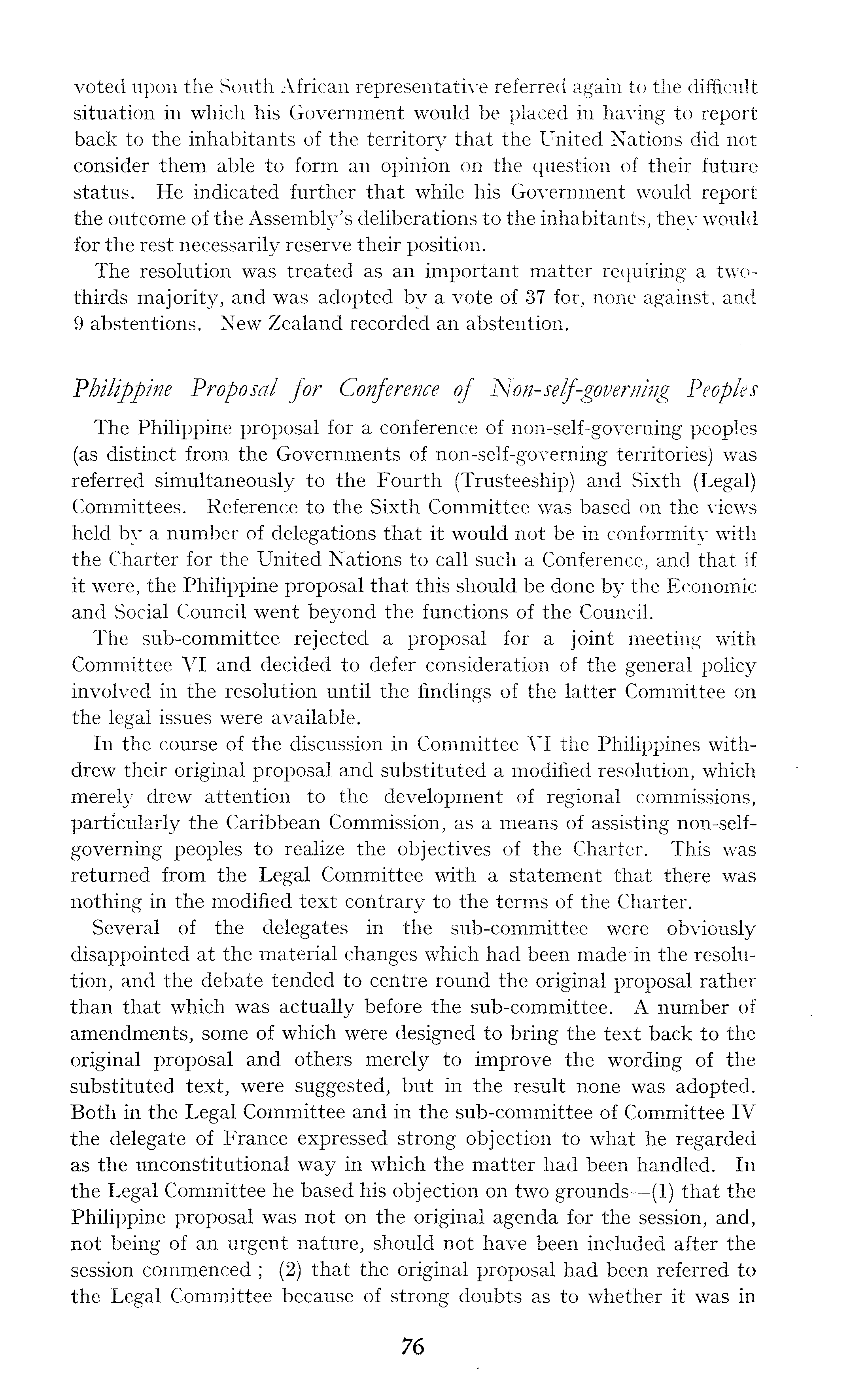 voted upon the South African representative referred again to the difficult situation in which his Government would be placed in having to report back to the inhabitants of the territory that the United Nations did not consider them able to form an opinion on the question of their future status. He indicated further that while his Government would report the outcome of the Assembly's deliberations to the inhabitants, they would for the rest necessarily reserve their position. The resolution was treated as an important matter requiring a twothirds majority, and was adopted by a vote of 37 for, none against, and 9 abstentions. New Zealand recorded an abstention. Philippine Proposal for Conference of Non-self-governing Peoples The Philippine proposal for a conference of non-self-governing peoples (as distinct from the Governments of non-self-governing territories) was referred simultaneously to the Fourth (Trusteeship) and Sixth (Legal) Committees. Reference to the Sixth Committee was based on the views held by a number of delegations that it would not be in conformity with the Charter for the United Nations to call such a Conference, and that if it were, the Philippine proposal that this should be done by the Economic and Social Council went beyond the functions of the Council. The sub-committee rejected a proposal for a joint meeting with Committee VI and decided to defer consideration of the general policy involved in the resolution until the findings of the latter Committee on the legal issues were available. In the course of the discussion in Committee VI the Philippines withdrew their original proposal and substituted a modified resolution, which merely drew attention to the development of regional commissions, particularly the Caribbean Commission, as a means of assisting non-self-governing peoples to realize the objectives of the Charter. This was returned from the Legal Committee with a statement that there was nothing in the modified text contrary to the terms of the Charter. Several of the delegates in. the sub-committee were obviously disappointed at the material changes which had-been made'in the resolution, and the debate tended to centre round the original proposal rather than that which was actually before the sub-committee. A number of amendments, some of which were designed to bring the text back to the original proposal and others merely to improve the wording of the substituted text, were suggested, but in the result none was adopted. Both in the Legal Committee and in the sub-committee of Committee IV the delegate of France expressed strong objection to what he regarded as the unconstitutional way in which the matter had been handled. In the Legal Committee he based his objection on two grounds—(l) that the Philippine proposal was not on the original agenda for the session, and, not being of an urgent nature, should not have been included after the session commenced ; (2) that the original proposal had been referred to the Legal Committee because of strong doubts as to whether it was in