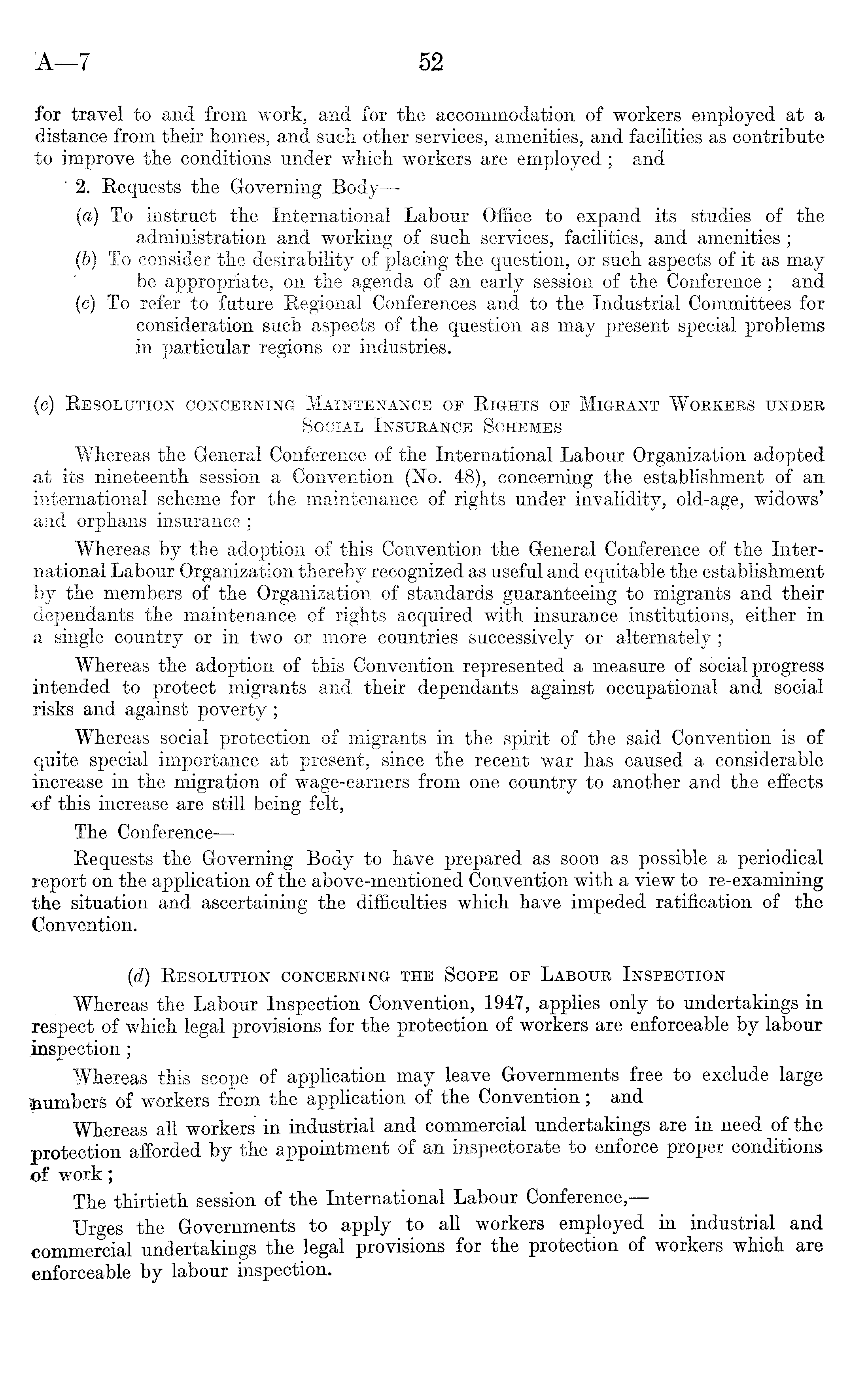 for travel to and from work, and for the accommodation of workers employed at a distance from their homes, and such other services, amenities, and facilities as contribute to improve the conditions under which workers are employed; and ' 2. Requests the Governing Body—(a) To instruct the International Labour Office to expand its studies of the administration and working of such services, facilities, and amenities ; (b) To consider the desirability of placing the question, or such aspects of it as may be appropriate, on the agenda of an early session of the Conference ; and (c) To refer to future Regional Conferences and to the Industrial Committees for consideration such aspects of the question as may present special problems in particular regions or industries. (c) Resolution concerning Maintenance or Rights op Migrant Workers under Social Insurance Schemes Whereas the General Conference of the International Labour Organization adopted at its nineteenth session a Convention (No. 48), concerning the establishment of an international scheme for the maintenance of rights under invalidity, old-age, widows' and orphans insurance ; Whereas by the adoption of this Convention the General Conference of the International Labour Organization thereby recognized as useful and equitable the establishment by the members of the Organization of standards guaranteeing to migrants and their dependants the maintenance of rights acquired with insurance institutions, either in a single country or in two or more countries successively or alternately; Whereas the adoption of this Convention represented a measure of social progress intended to protect migrants and their dependants against occupational and social risks and against poverty; Whereas social protection of migrants in the spirit of the said Convention is of quite special importance at present, since the recent war has caused a considerable increase in the migration of wage-earners from one country to another and the effects of this increase are still being felt, The Conference— Requests the Governing Body to have prepared as soon as possible a periodical report on the application of the above-mentioned Convention with a view to re-examining the situation and ascertaining the difficulties which have impeded ratification of the Convention. (d) Resolution concerning the Scope op Labour Inspection Whereas the Labour Inspection Convention, 1947, applies only to undertakings in respect of which legal provisions for the protection of workers are enforceable by labour inspection; Whereas this scope of application may leave Governments free to exclude large numbers of workers from the application of the Convention; and Whereas all workers in industrial and commercial undertakings are in need of the protection afforded by the appointment of an inspectorate to enforce proper conditions of work; The thirtieth session of the International Labour Conference, — Urges the Governments to apply to all workers employed in industrial and commercial undertakings the legal provisions for the protection of workers which are enforceable by labour inspection.