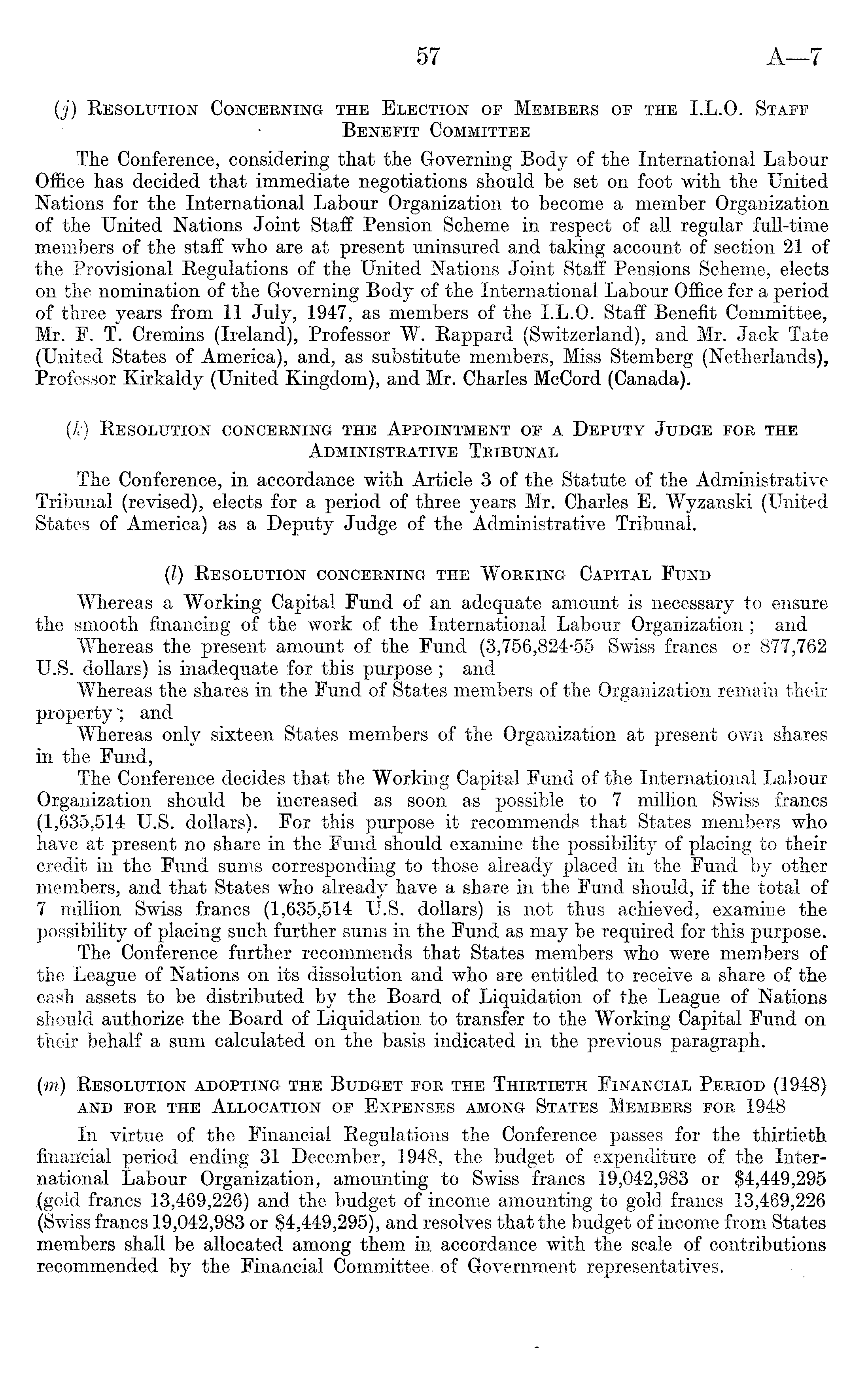 (j) Resolution Concerning the Election of Members of the 1.L.0. Staff Benefit Committee The Conference, considering that the Governing Body of the International Labour Office has decided that immediate negotiations should be set on foot with the United Nations for the International Labour Organization to become a member Organization of the United Nations Joint Staff Pension Scheme in respect of all regular full-time members of the staff who are at present uninsured and taking account of section 21 of the Provisional Regulations of the United Nations Joint Staff Pensions Scheme, elects on the nomination of the Governing Body of the International Labour Office for a period of three years from 11 July, 1947, as members of the 1.L.0. Staff Benefit Committee, Mr. F. T. Cremins (Ireland), Professor W. Rappard (Switzerland), and Mr. Jack Tate (United States of America), and, as substitute members, Miss Sternberg (Netherlands), Professor Kirkaldy (United Kingdom), and Mr. Charles McCord (Canada). (A) Resolution concerning the Appointment of a Deputy Judge for the Administrative Tribunal The Conference, in accordance with Article 3 of the Statute of the Administrative Tribunal (revised), elects for a period of three years Mr. Charles E. Wyzanski (United States of America) as a Deputy Judge of the Administrative Tribunal. (I) Resolution concerning the Working Capital Fund Whereas a Working Capital Fund of an adequate amount is necessary to ensure the smooth financing of the work of the International Labour Organization; and Whereas the present amount of the Fund (3,756,824-55 Swiss francs or 877,762 U.S. dollars) is inadequate for this purpose; and Whereas the shares in the Fund of States members of the Organization remain their propertyand Whereas only sixteen States members of the Organization at present own shares in the Fund, The Conference decides that the Working Capital Fund of the International Labour Organization should be increased as soon as possible to 7 million Swiss francs (1,635,514 U.S. dollars). For this purpose it recommends that States members who have at present no share in the Fund should examine the possibility of placing to their credit in the Fund sums corresponding to those already placed in the Fund by other members, and that States who already have a share in the Fund should, if the total of 7 million Swiss francs (1,635,514 U.S. dollars) is not thus achieved, examine the possibility of placing such further sums in the Fund as may be required for this purpose. The Conference further recommends that States members who were members of the League of Nations on its dissolution and who are entitled to receive a share of the cash assets to be distributed by the Board of Liquidation of the League of Nations should authorize the Board of Liquidation to transfer to the Working Capital Fund on their behalf a sum calculated on the basis indicated in the previous paragraph. (m) Resolution adopting the Budget for the Thirtieth Financial Period (1948) and for the Allocation of Expenses amokg States Members for 1948 In virtue of the Financial Regulations the Conference passes for the thirtieth financial period ending 31 December, 1948, the budget of expenditure of the International Labour Organization, amounting to Swiss francs 19,042,983 or $4,449,295 (gold francs 13,469,226) and the budget of income amounting to gold francs 13,469,226 (Swiss francs 19,042,983 or $4,449,295), and resolves that the budget of income from States members shall be allocated among them in accordance with the scale of contributions recommended by the Financial Committee, of Government representatives.