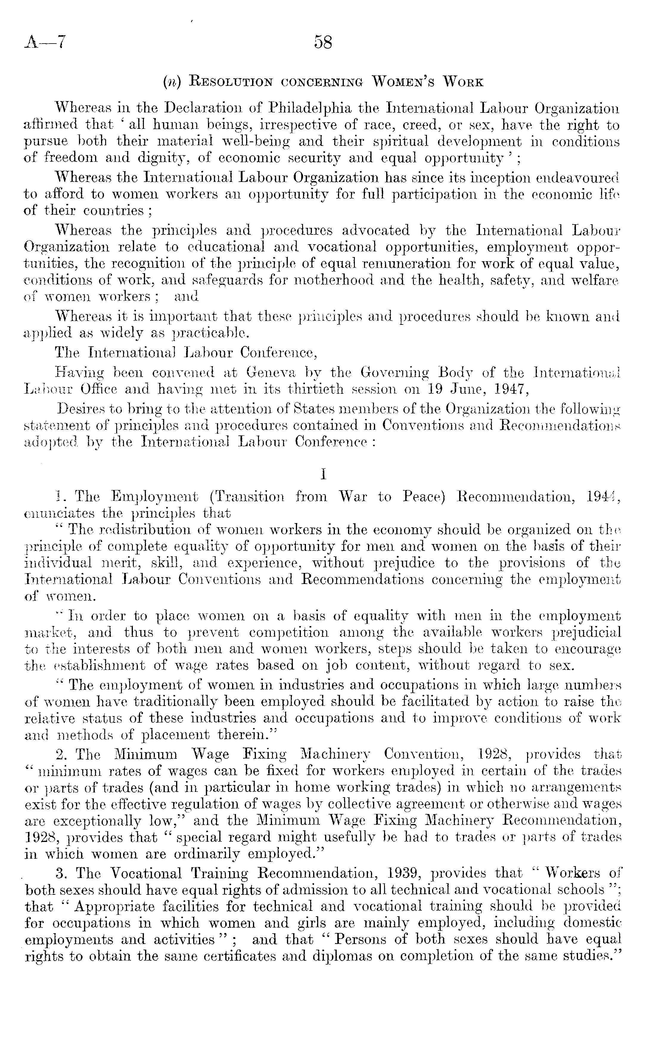(n) Resolution concerning Women's Work Whereas in the Declaration of Philadelphia the International Labour Organization affirmed that ' all human beings, irrespective of race, creed, or sex, have the right to pursue both their material well-being and their spiritual development in conditions of freedom and dignity, of economic security and equal opportunity' ; Whereas the International Labour Organization has since its inception endeavoured to afford to women workers an opportunity for full participation in the economic life of their countries ; Whereas the principles and procedures advocated by the International Labour Organization relate to educational and vocational opportunities, employment opportunities, the recognition of the principle of equal remuneration for work of equal value, conditions of work, and safeguards for motherhood and the health, safety, and welfare of women workers ; and Whereas it is important that these principles and procedures should be known and applied as widely as practicable. The International Labour Conference, Having been convened at Geneva by the Governing Body of the International Labour Office and having met in its thirtieth session on 19 June, 1947, Desires to bring to the attention of States members of the Organization the following statement of principles and procedures contained in Conventions and Recommendations adopted by the International Labour Conference : I 1. The Employment (Transition from War to Peace) Recommendation, 1944, enunciates the principles that " The redistribution of women workers in the economy should be organized on the principle of complete equality of opportunity for men and women on the basis of their individual merit, skill, and experience, without prejudice to the provisions of the International Labour Conventions and Recommendations concerning the employment of women. " In order to place women on a basis of equality with men in the employment market, and thus to prevent competition among the available workers prejudicial to the interests of both men and women workers, steps should be taken to encourage the establishment of wage rates based on job content, without regard to sex. " The employment of women in industries and occupations in which large numbers of women have traditionally been employed should be facilitated by action to raise the relative status of these industries and occupations and to improve conditions of work and methods of placement therein." 2. The Minimum Wage Fixing Machinery Convention, 1928, provides that " minimum rates of wages can be fixed for workers employed in certain of the trades or parts of trades (and in particular in home working trades) in which no arrangements exist for the effective regulation of wages by collective agreement or otherwise and wages are exceptionally low," and the Minimum Wage Fixing Machinery Recommendation, 1928, provides that " special regard might usefully be had to trades or parts of trades in which women are ordinarily employed." 3. The Vocational Training Recommendation, 1939, provides that " Workers of both sexes should have equal rights of admission to all technical and vocational schools that " Appropriate facilities for technical and vocational training should be provided for occupations in which women and girls are mainly employed, including domestic employments and activities" ; and that "Persons of both sexes should have equal rights to obtain the same certificates and diplomas on completion of the same studies."
